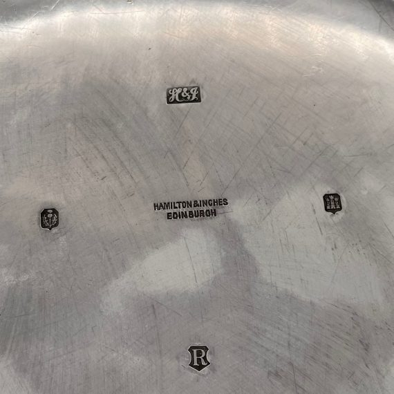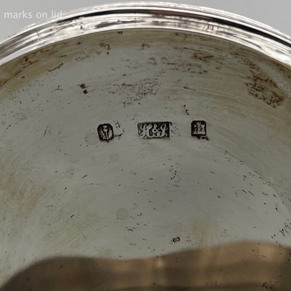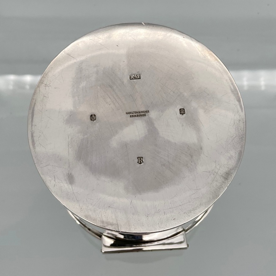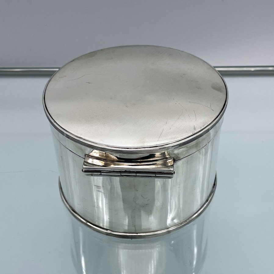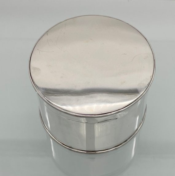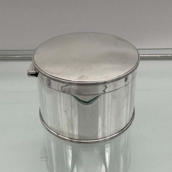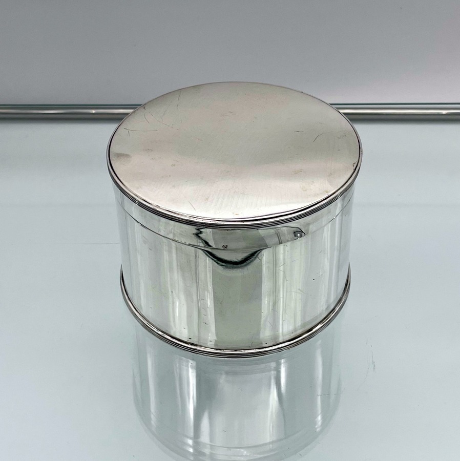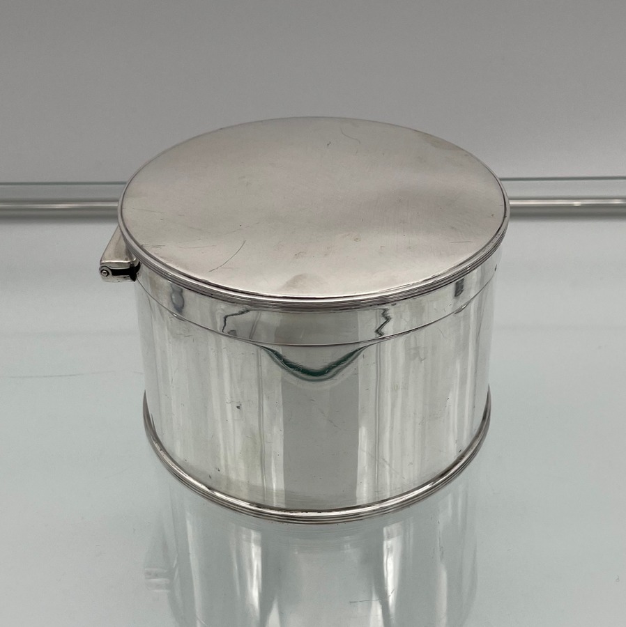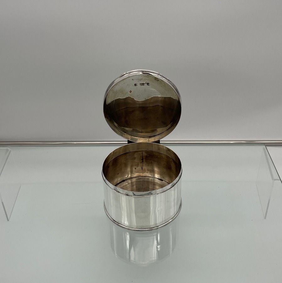A delightful plain formed round George V sterling silver biscuit box designed with a flip hinged lid.