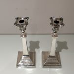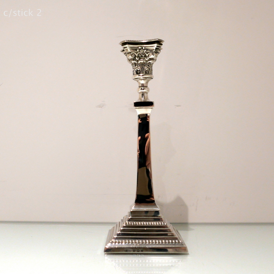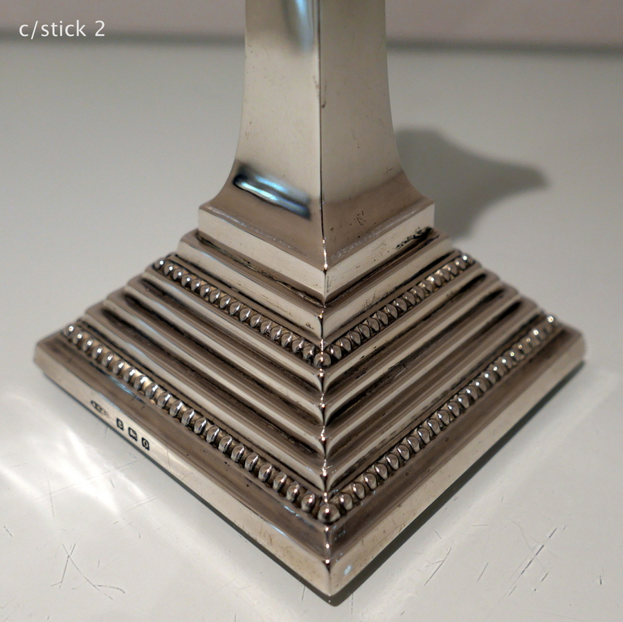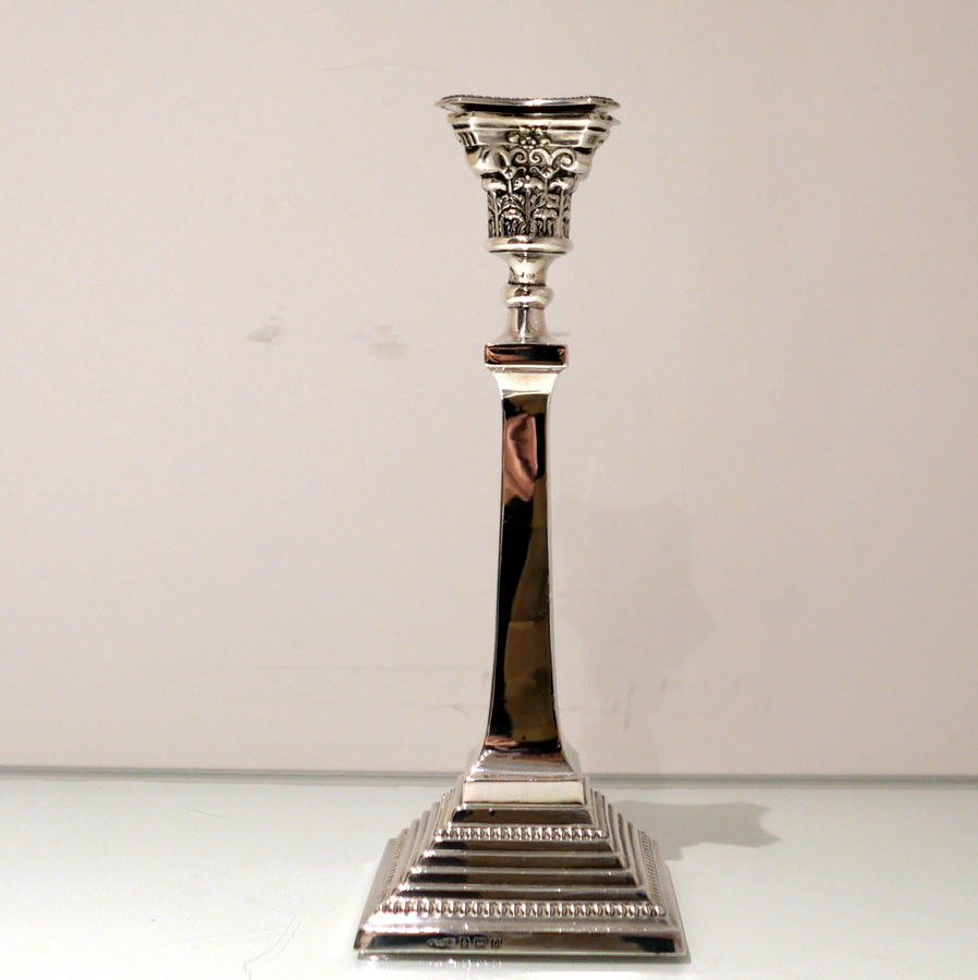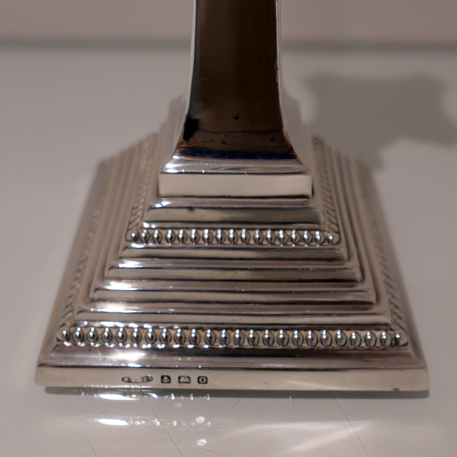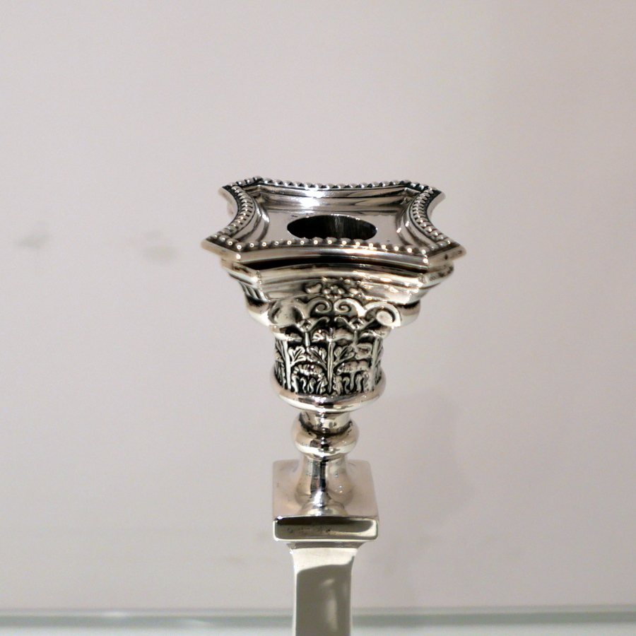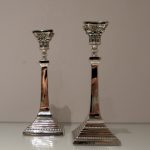 A beautiful pair of early 20th century bead Sabbath sterling silver candlesticks designed with a stylish square ‘stepped’ bases, elegant tapering columns and ornate capitals.