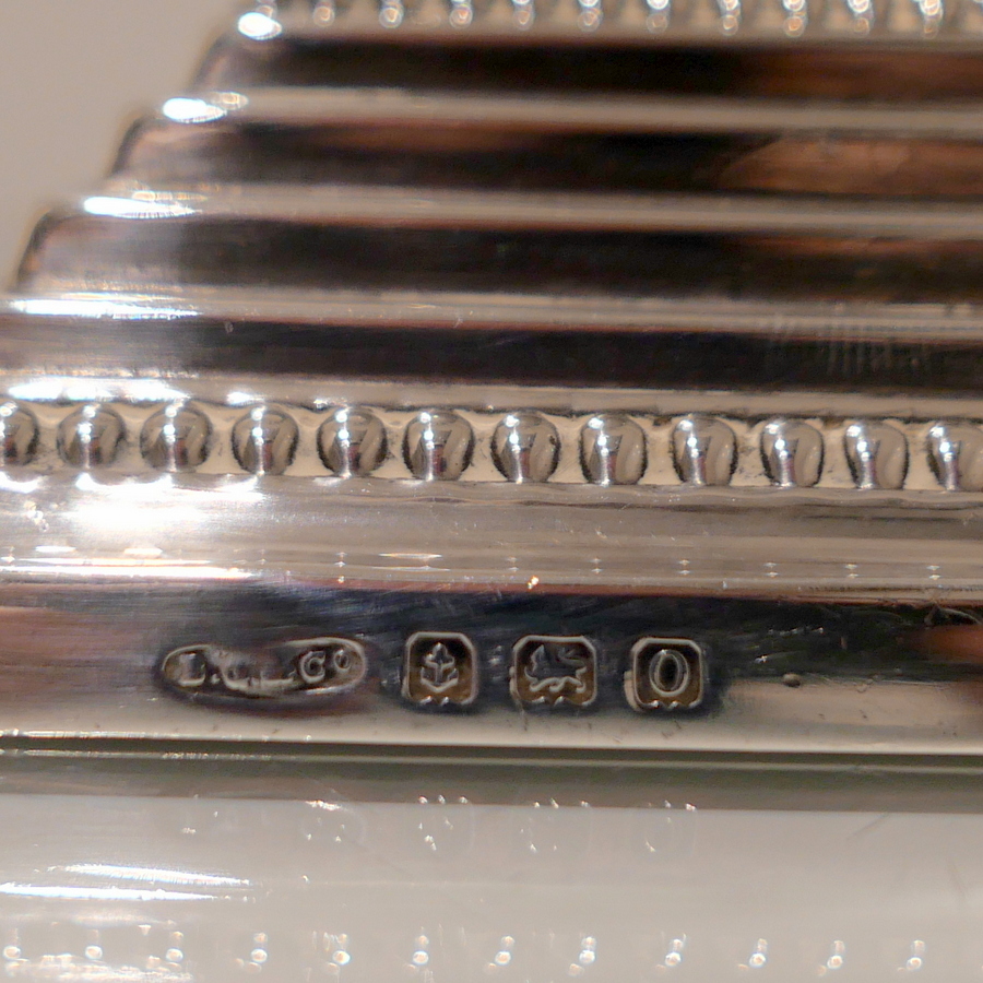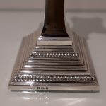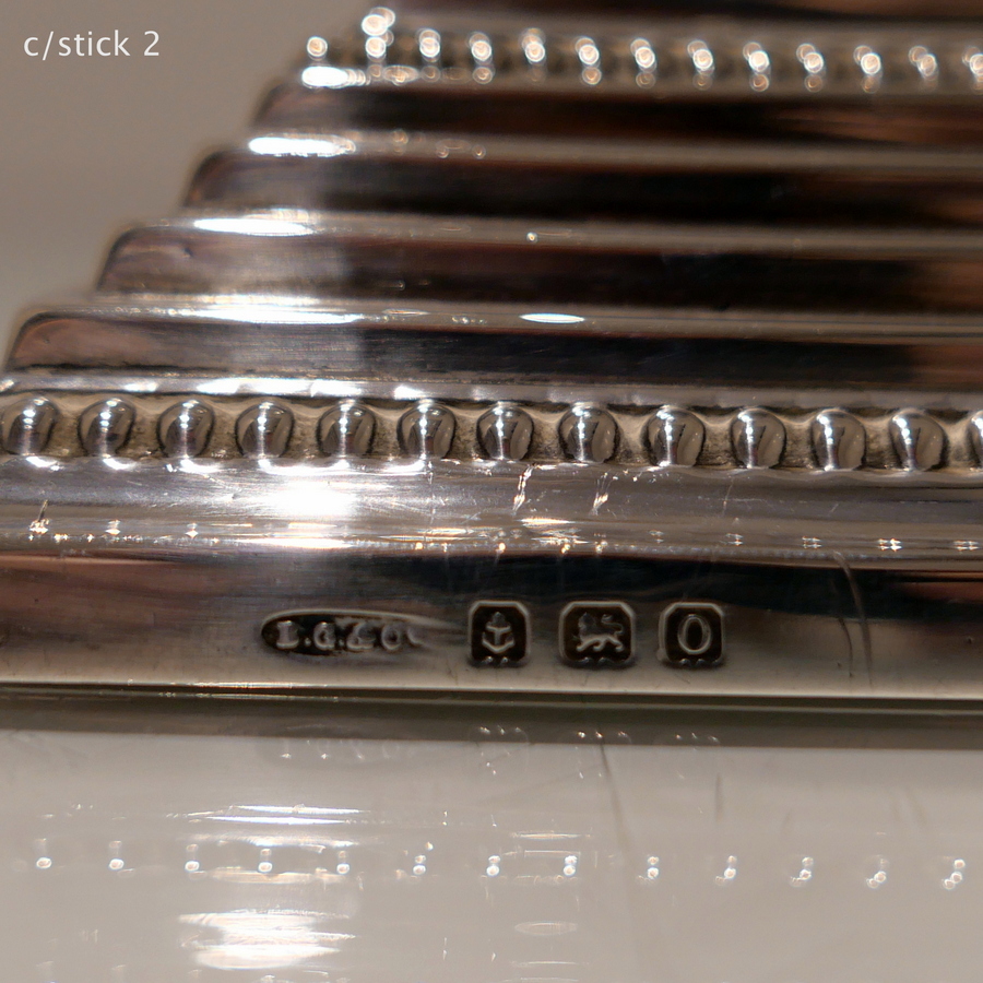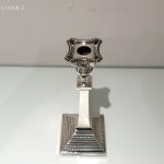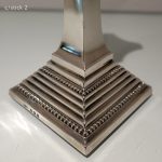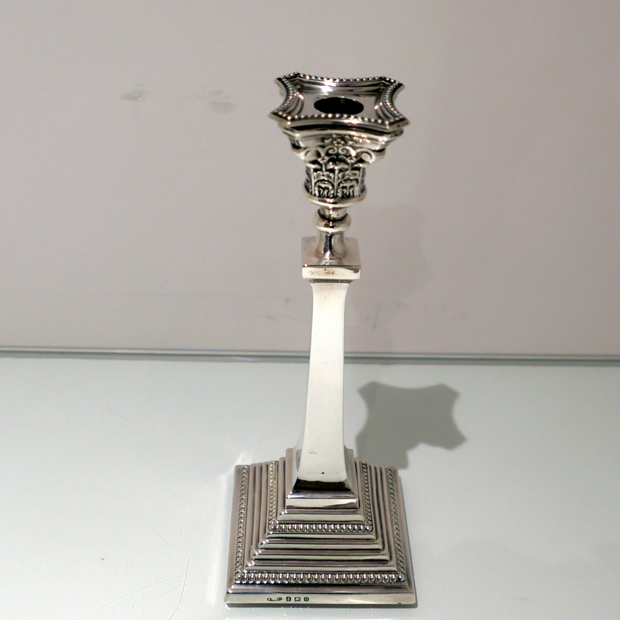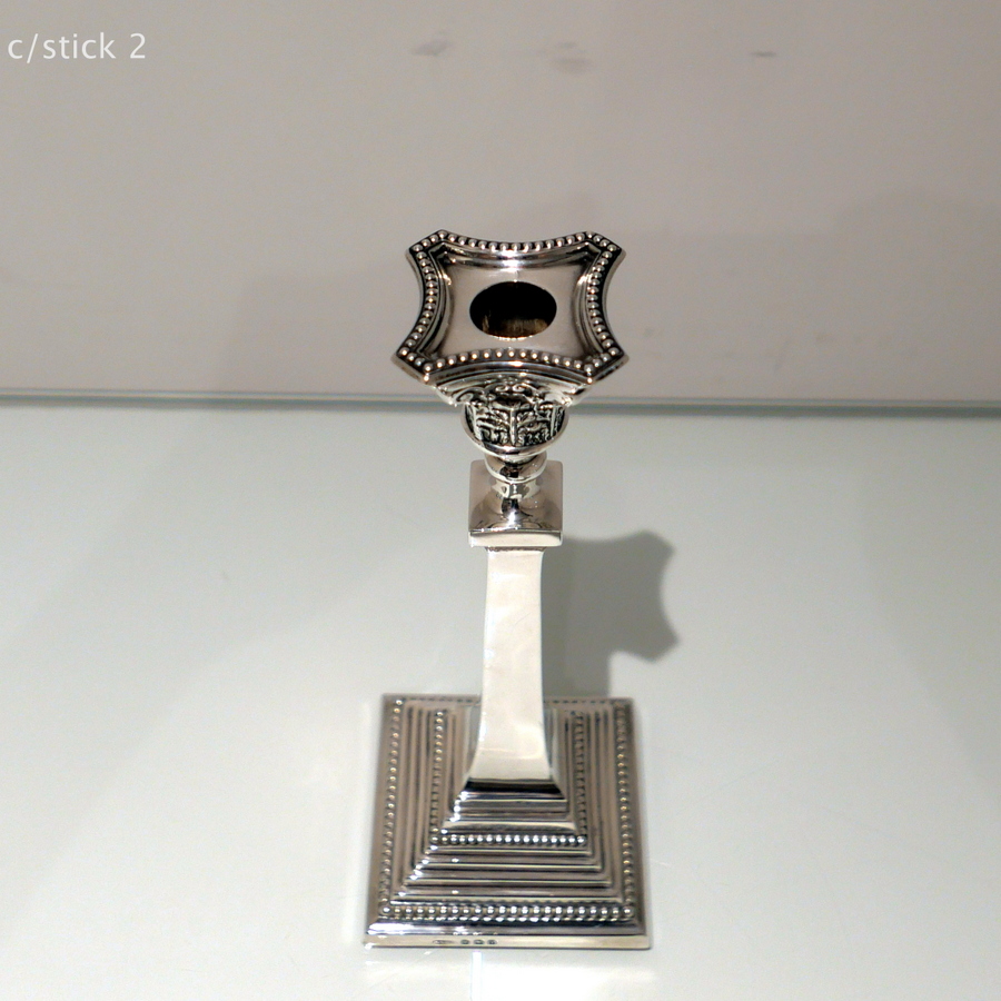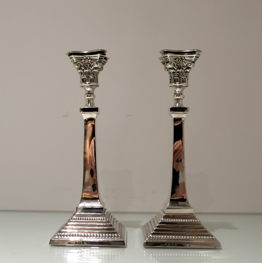 A beautiful pair of early 20th century bead Sabbath sterling silver candlesticks designed with a stylish square ‘stepped’ bases, elegant tapering columns and ornate capitals.