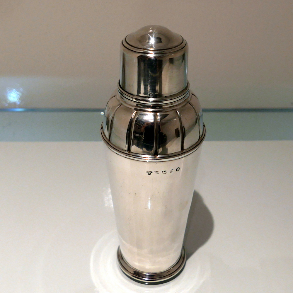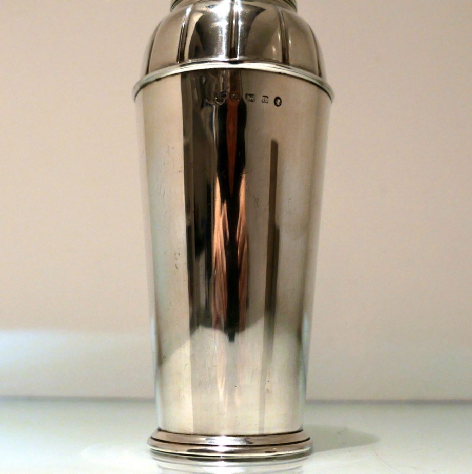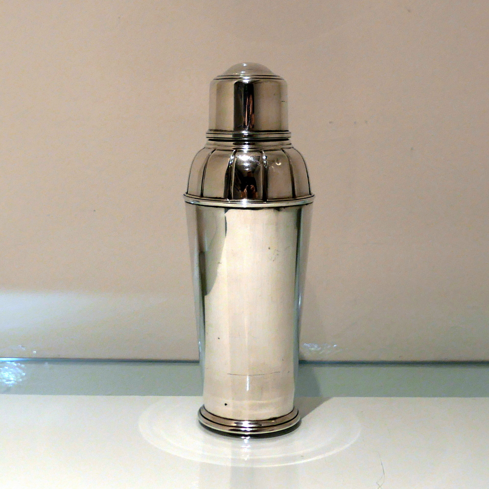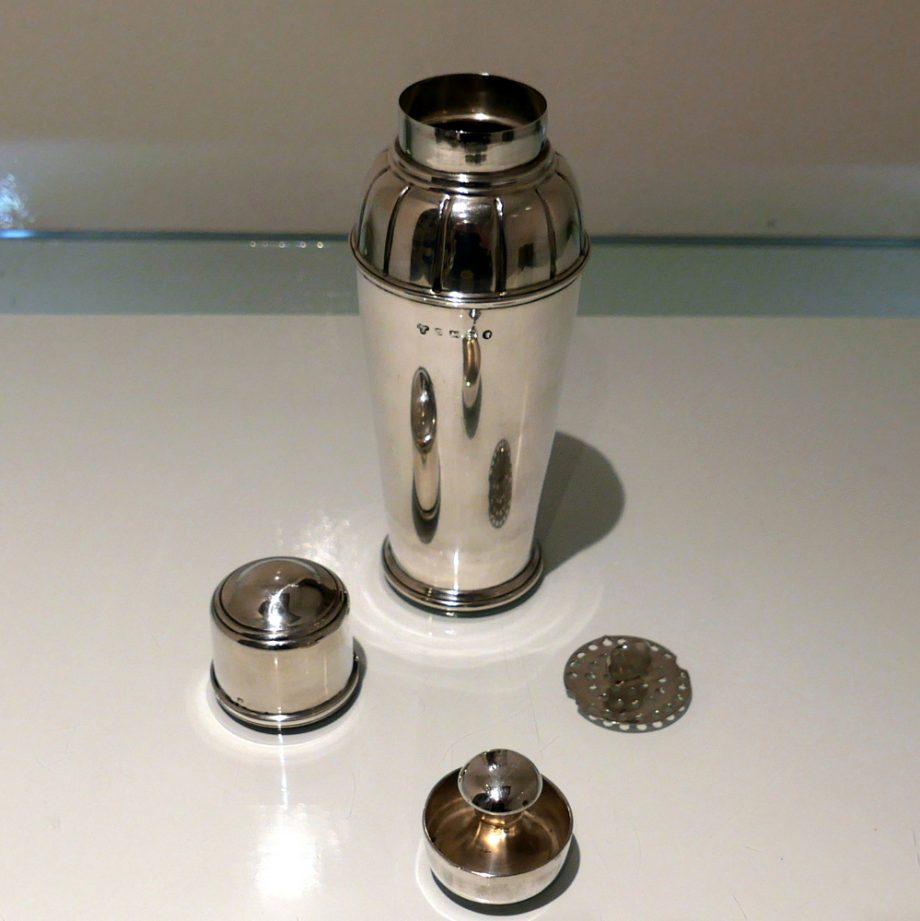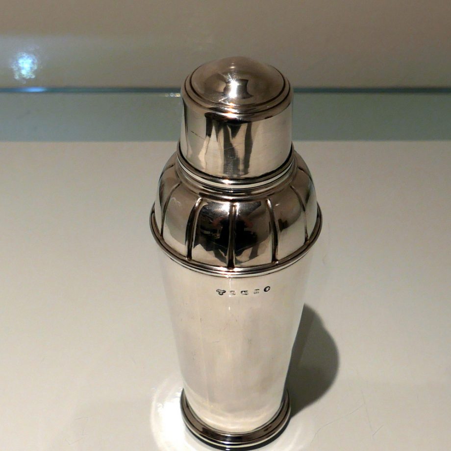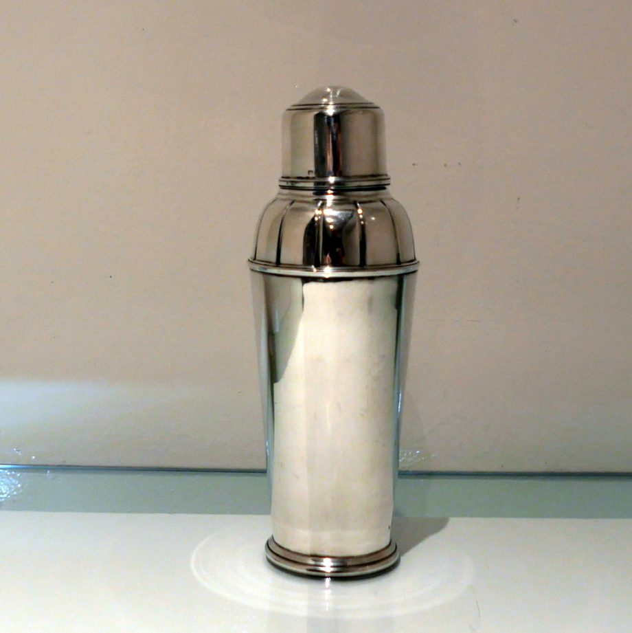 A splendid sterling silver cocktail shaker made for the famous ‘Harrods’ retail store. Â The body is plain formed in design with tapering angles and has a fixed upper (shoulder) panelled gallery.