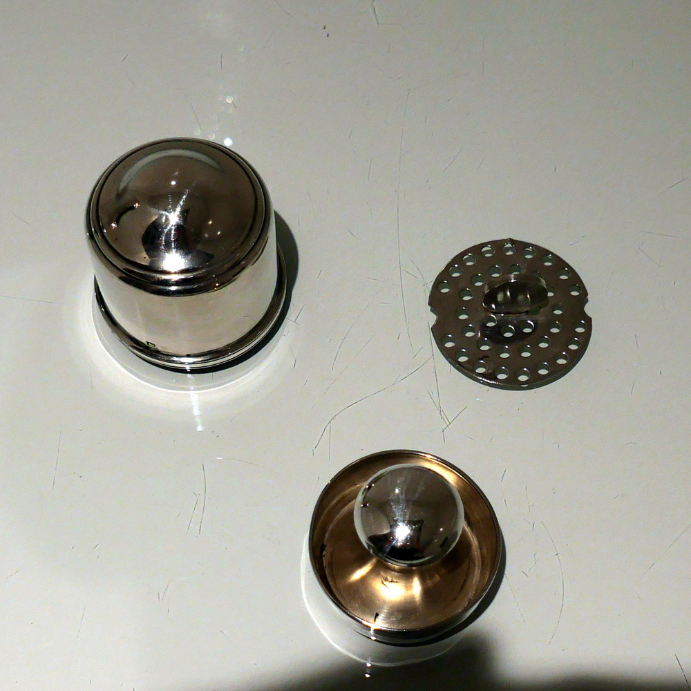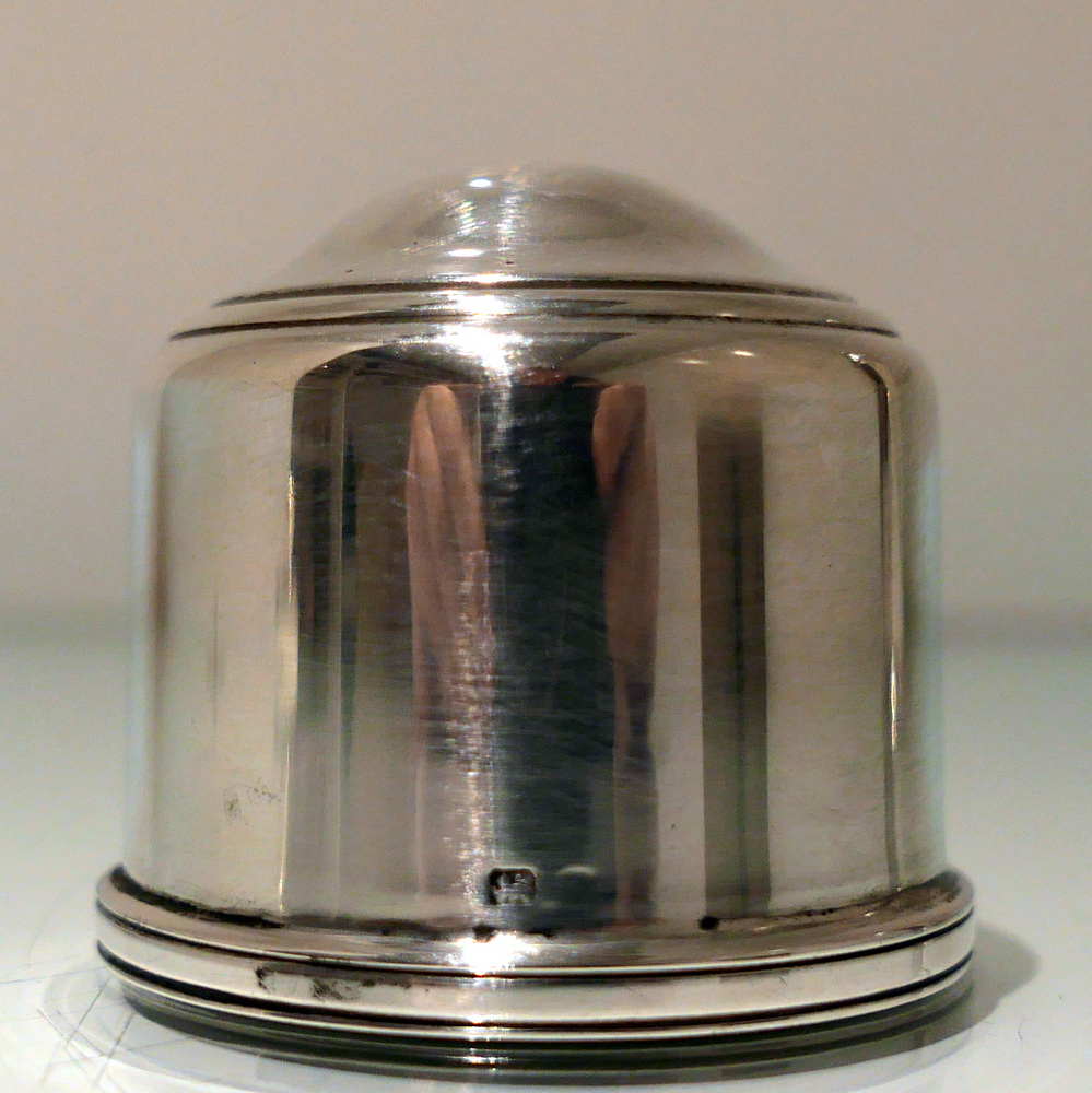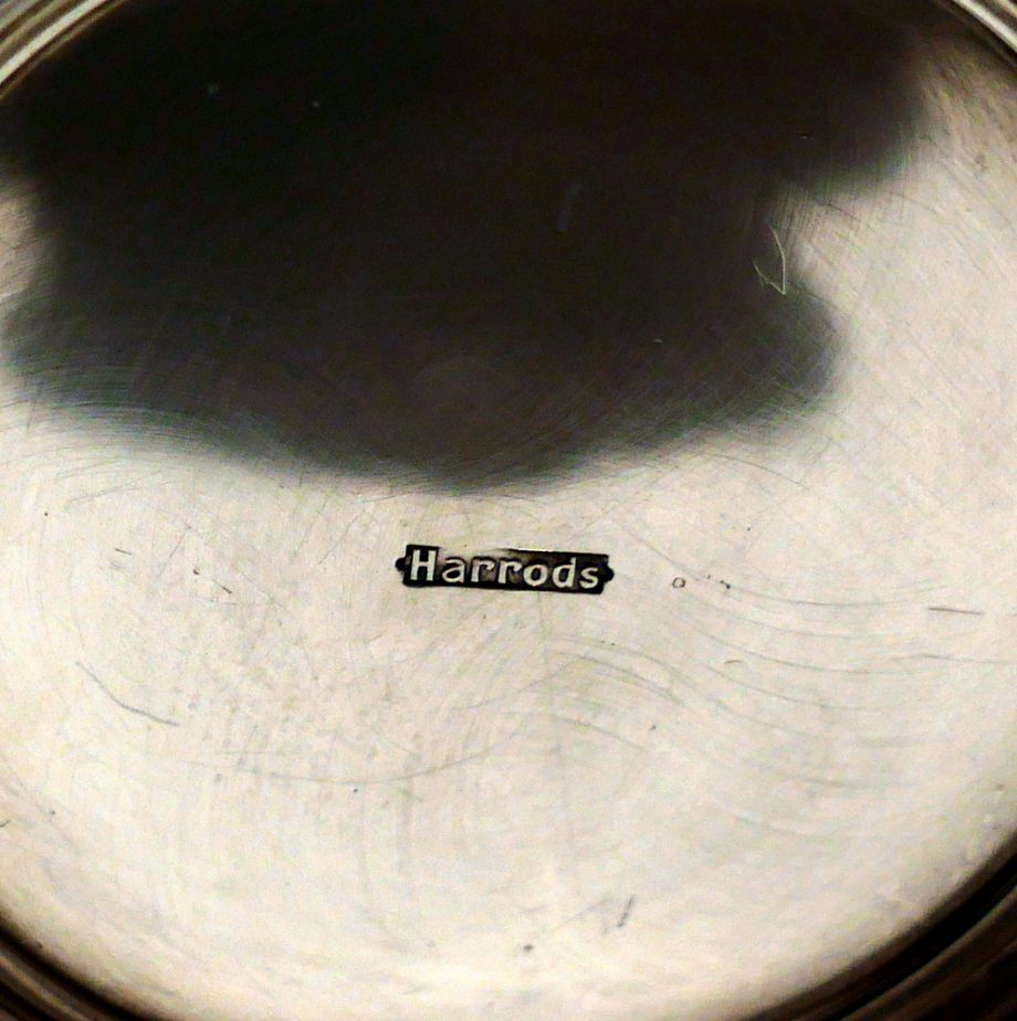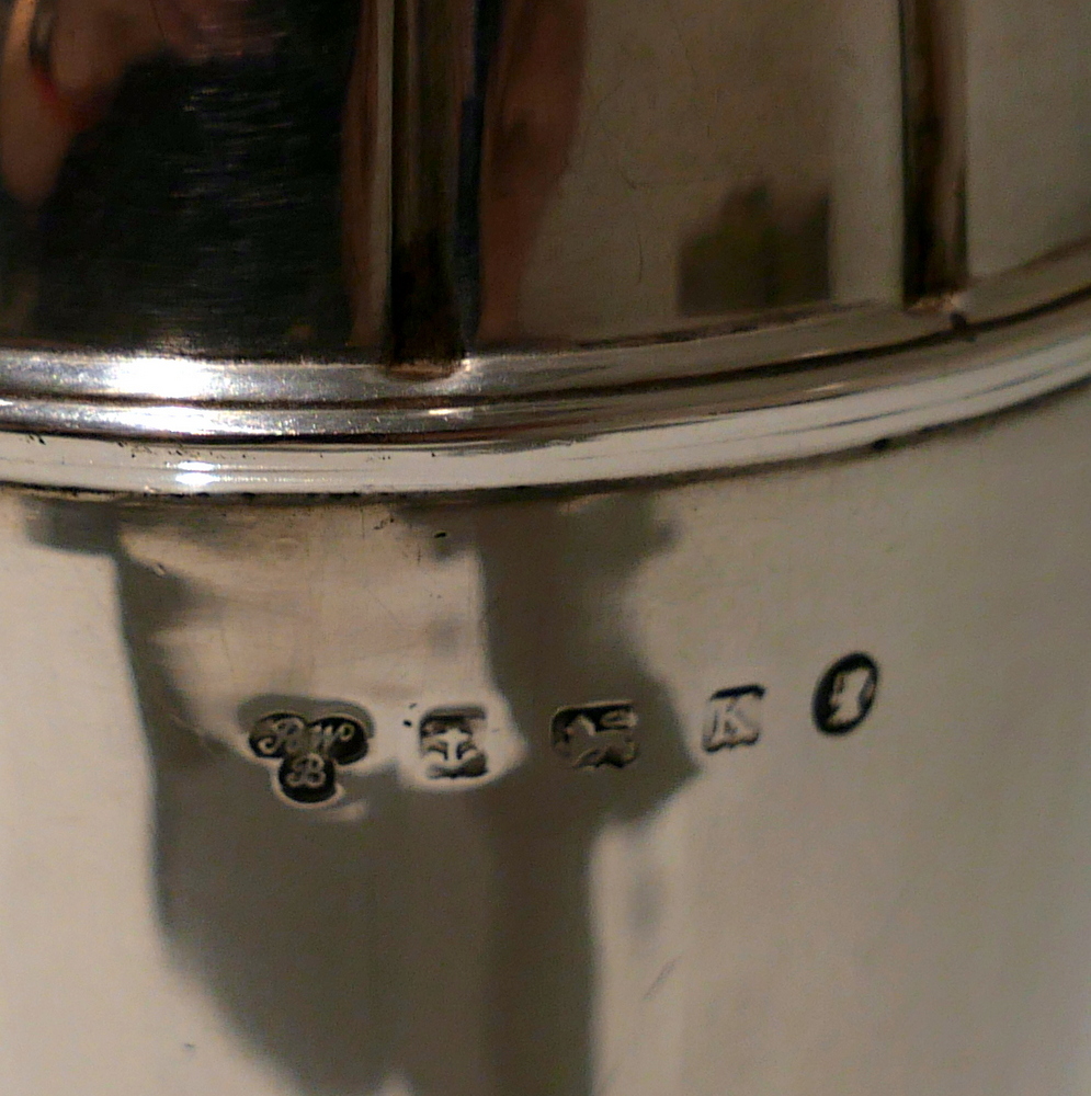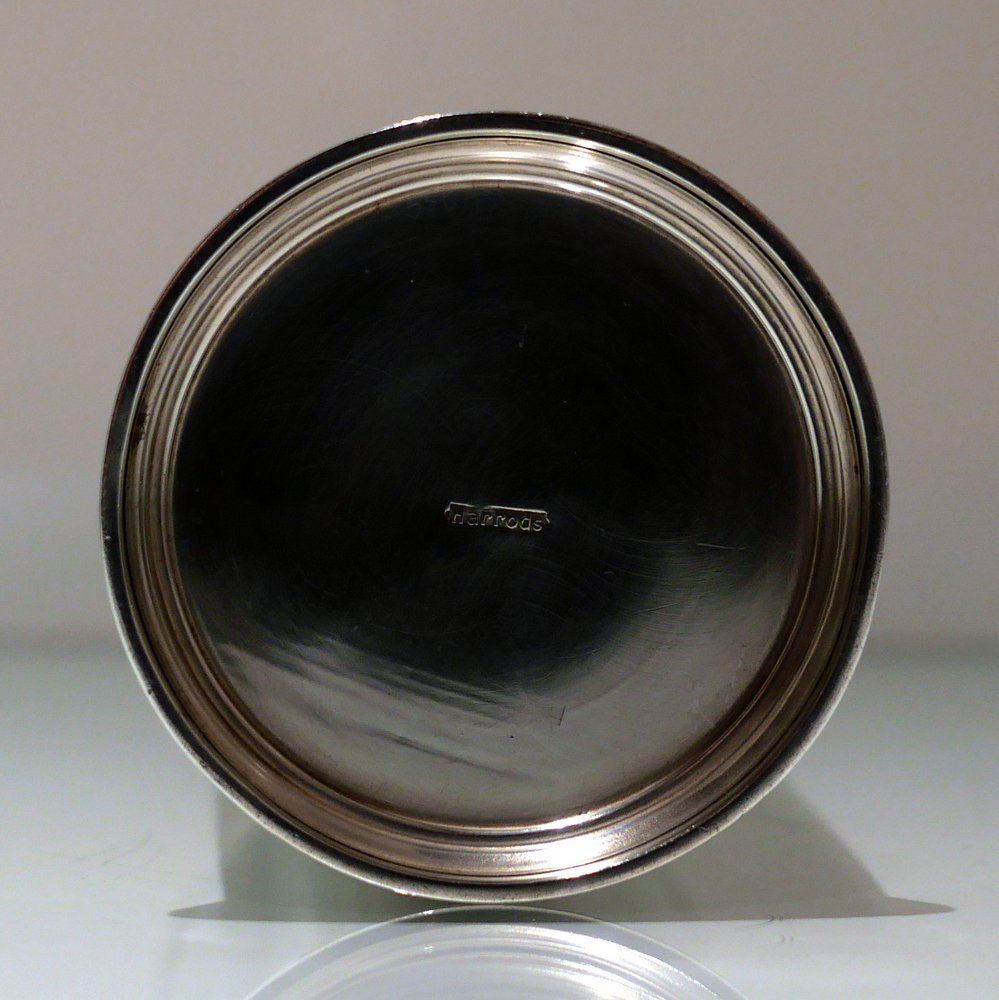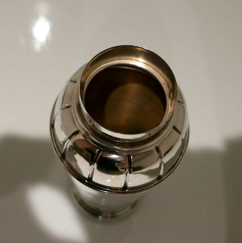 A splendid sterling silver cocktail shaker made for the famous ‘Harrods’ retail store. Â The body is plain formed in design with tapering angles and has a fixed upper (shoulder) panelled gallery.