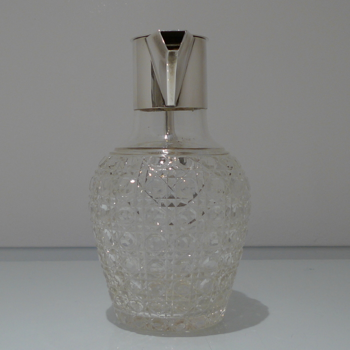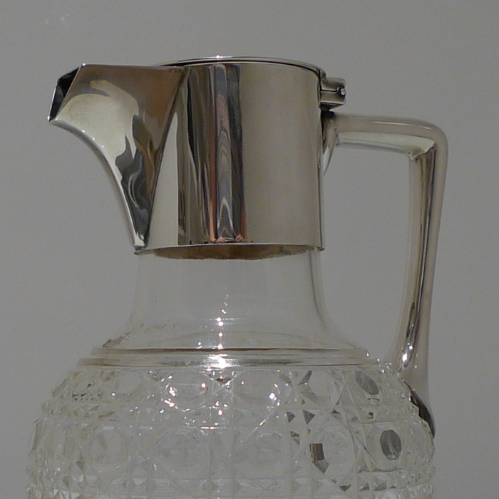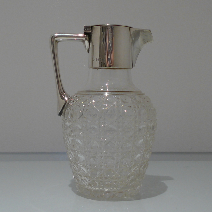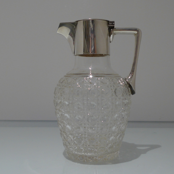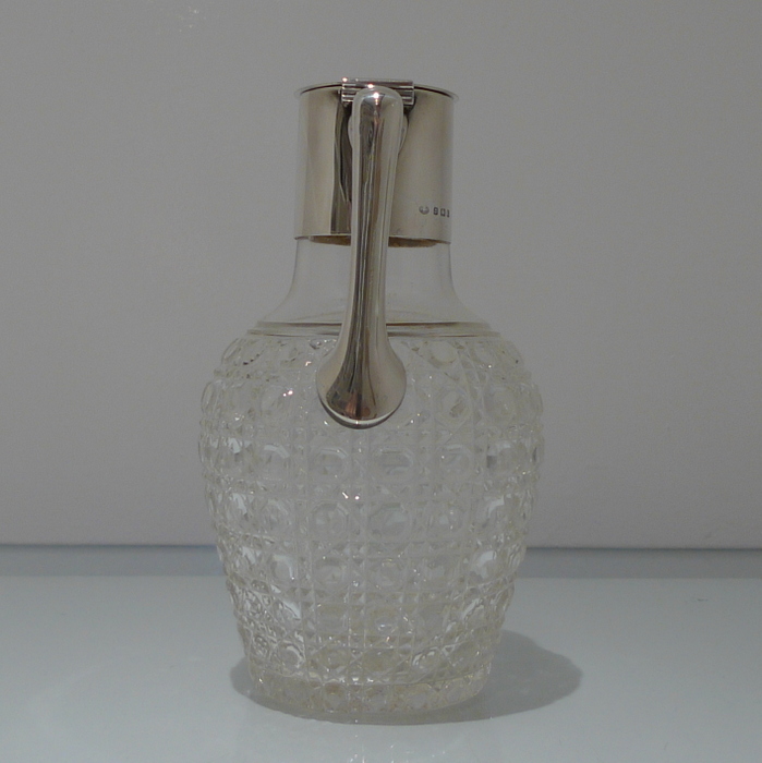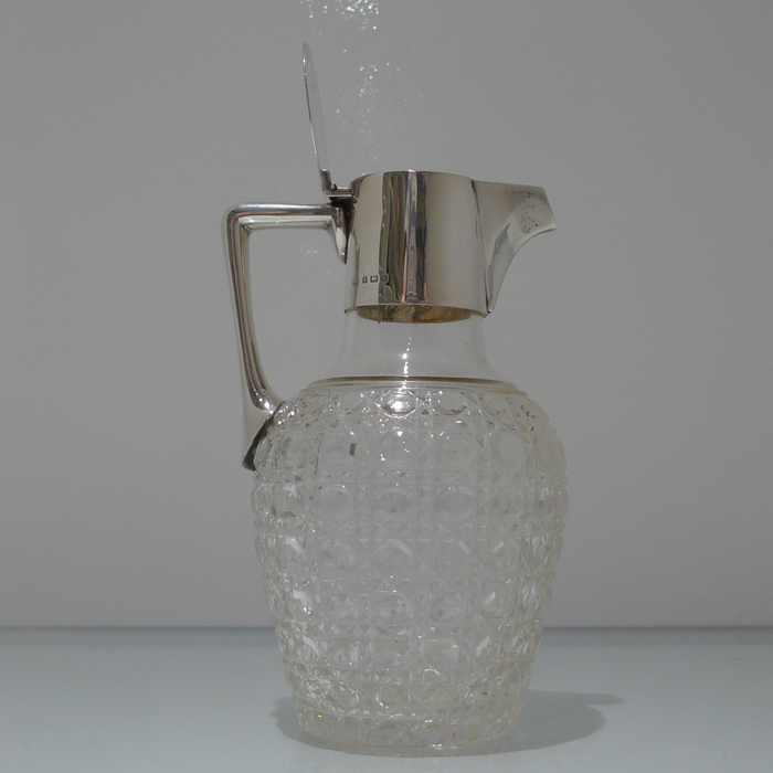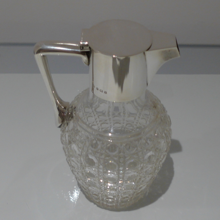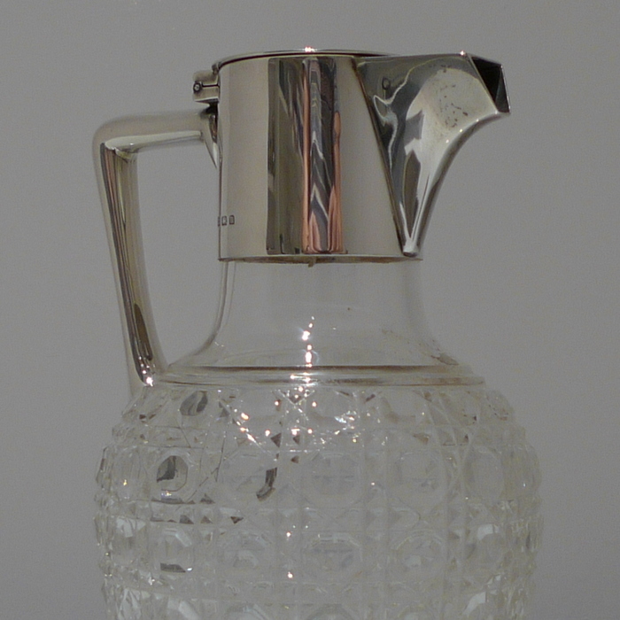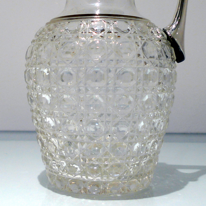 A collectable George V silver & crystal claret jug. Â The mount is stylishly plain formed in design and attaches to a hobnail cut body.