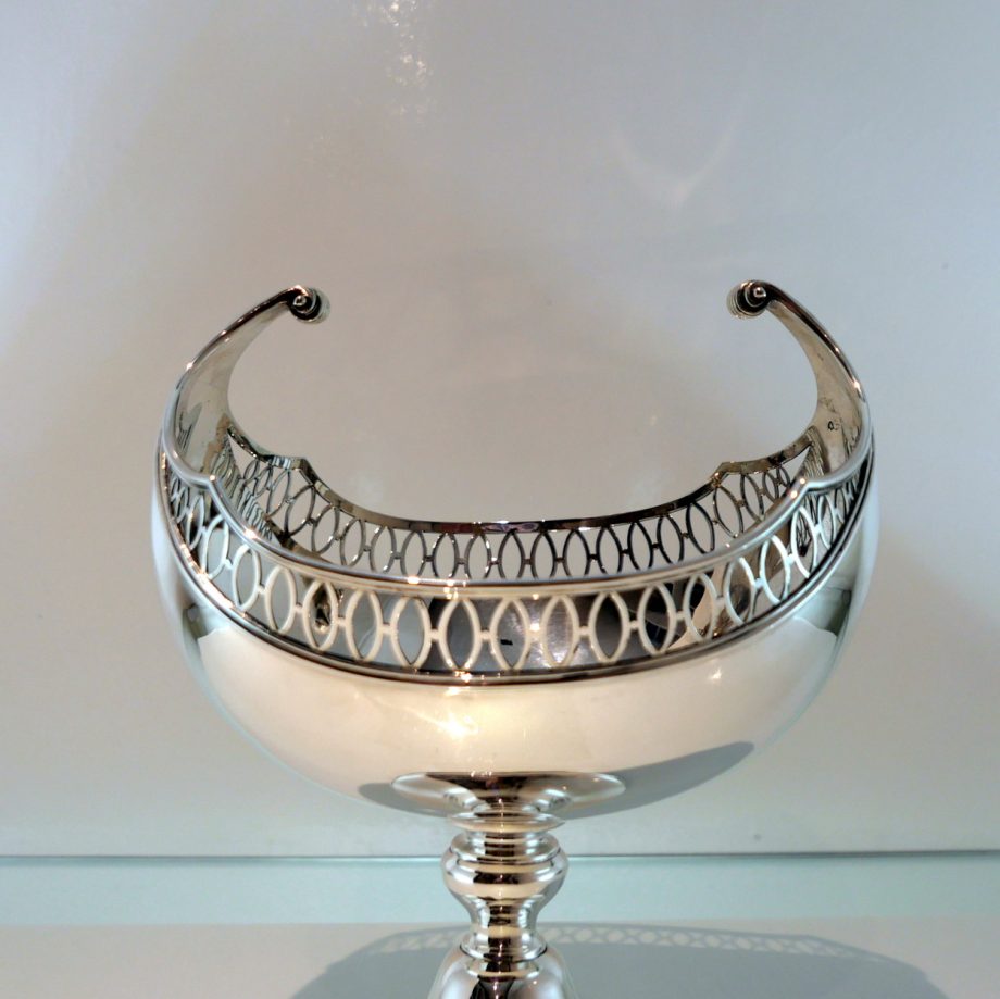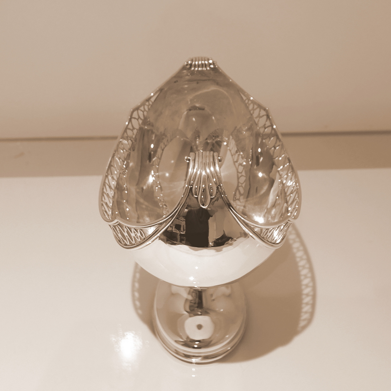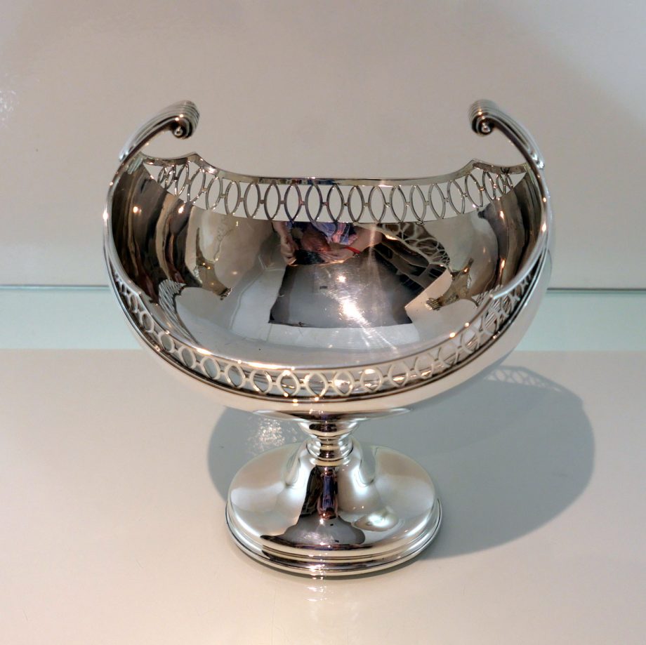 A large beautiful early 20th century silver “boat shaped” sterling silver dish standing on a raised circular pedestal foot. Â The upper bowl has elegant oval piercing for highlights and stunning “floating handles” for supreme craftsmanship.