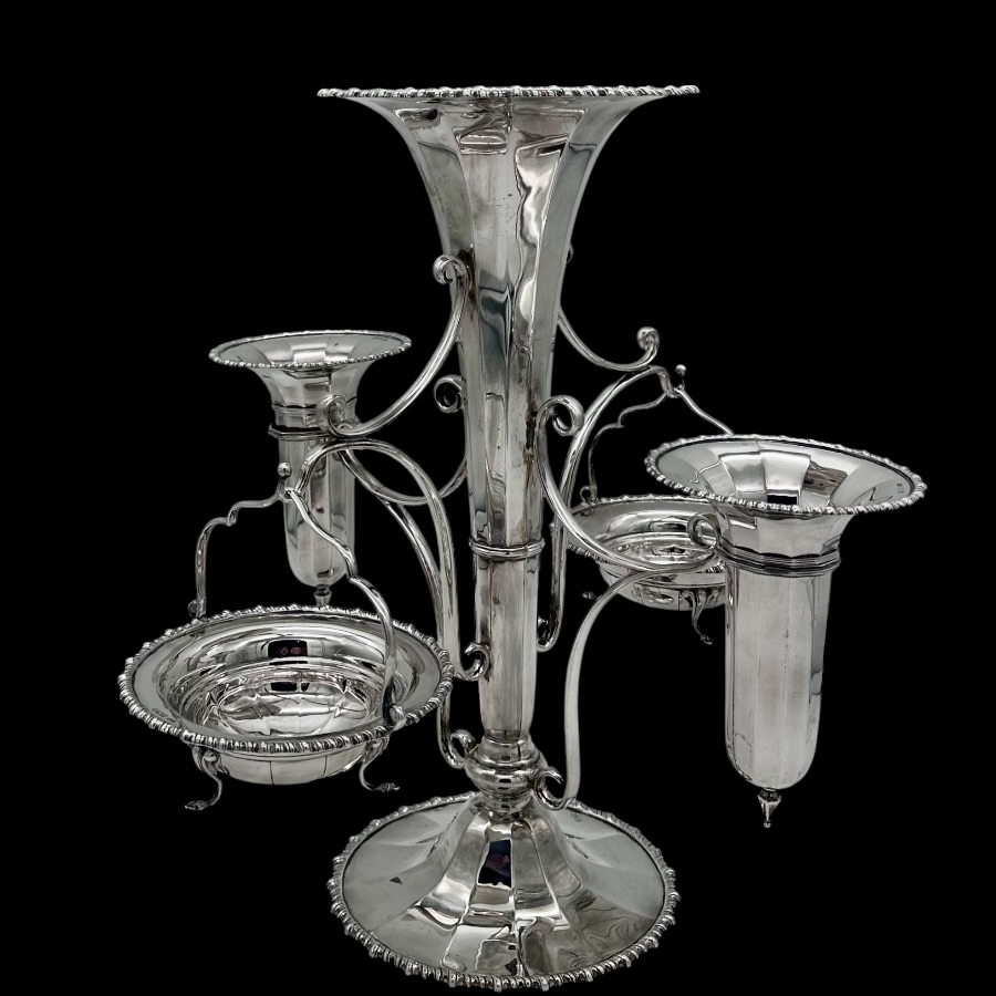 Stylish silver large table (trumpet) epergne designed with an elegant large central panelled vase and two smaller vases accompanied with two delightful swing baskets. There are beautiful applied gadroon borders for decorative highlights.