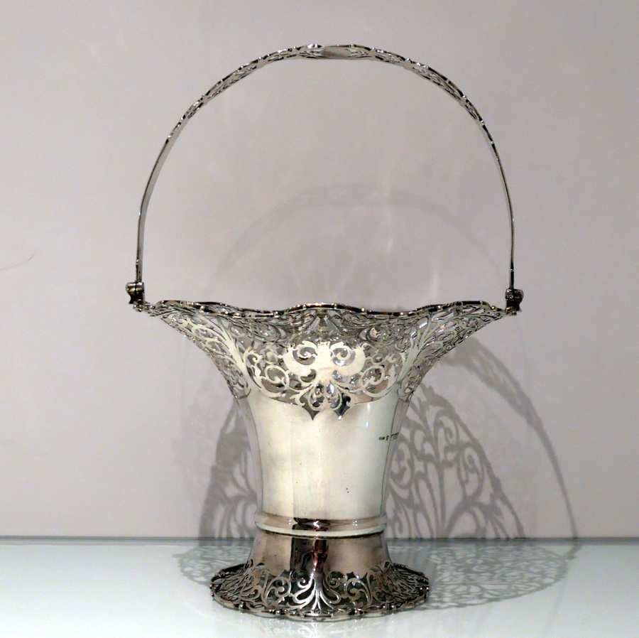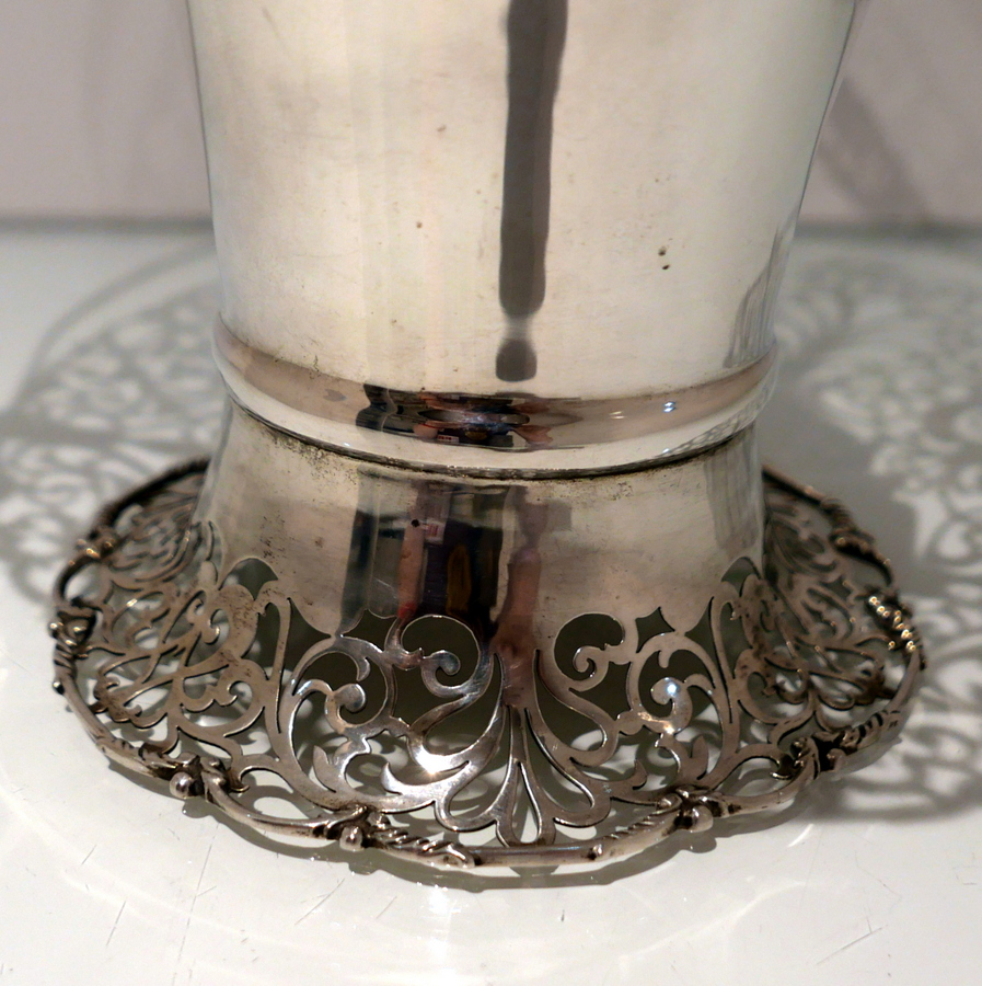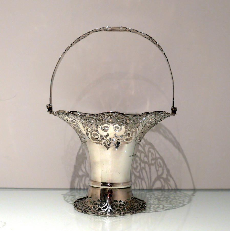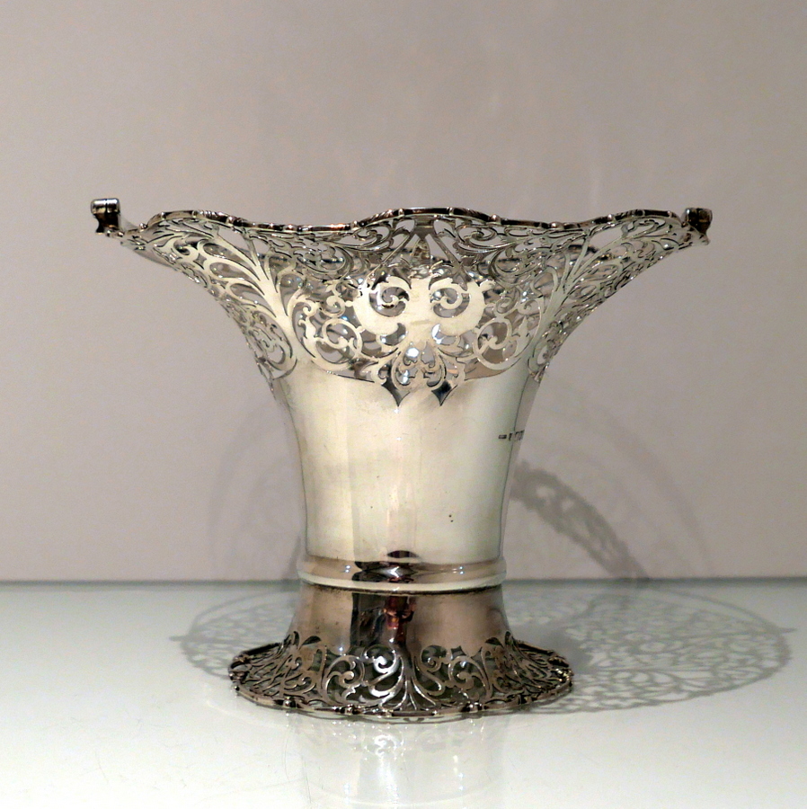 A fine sterling silver elongated vase shaped swing handled flower basket decorated with upper and lower elegantly intricate hand piercing. Â The upper bowl of the basket fans out for decorative highlights and the centre section is plain formed in design for the visual contrast.