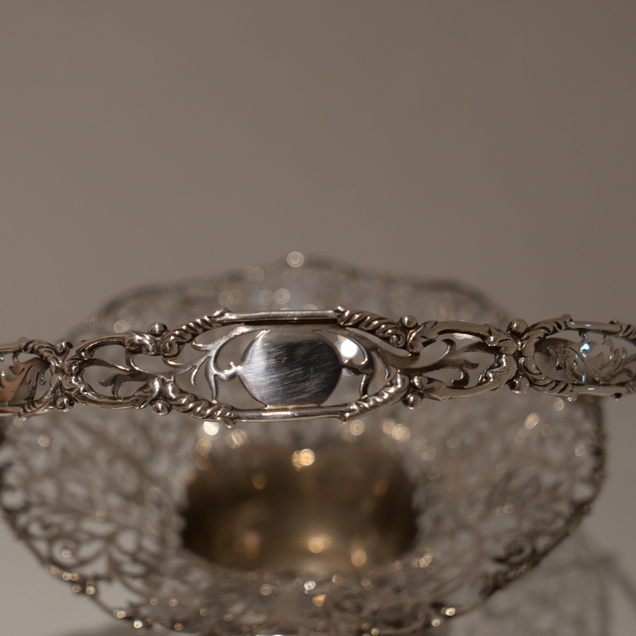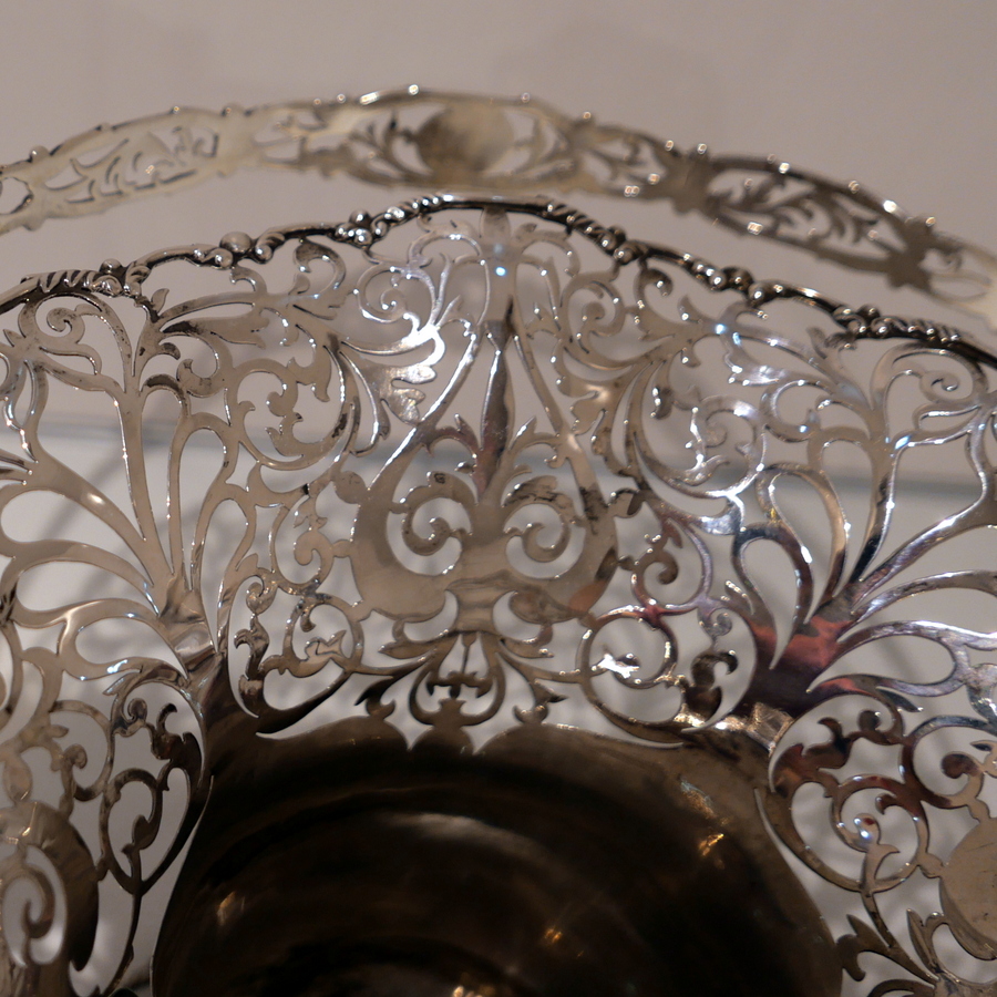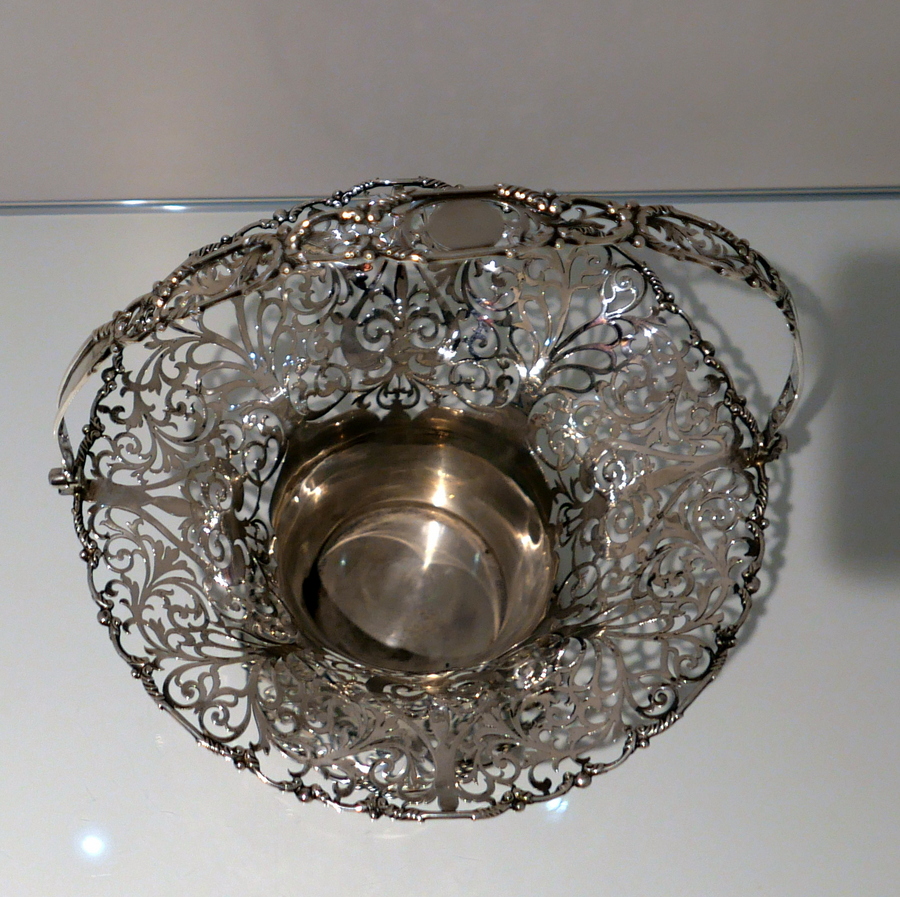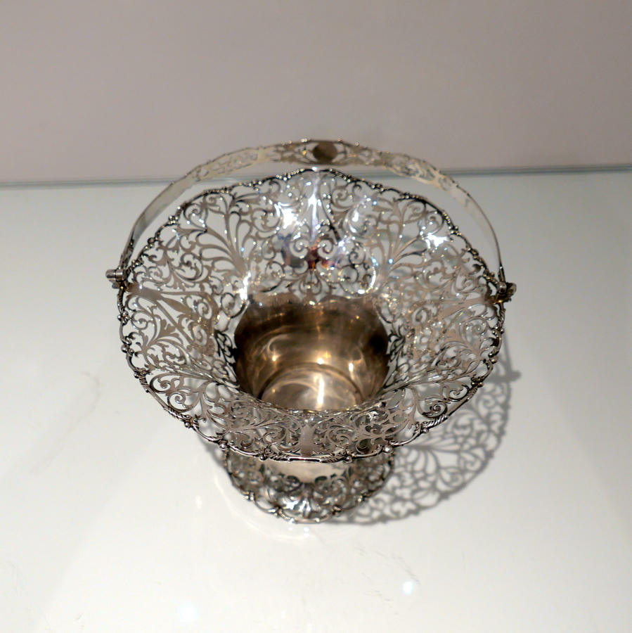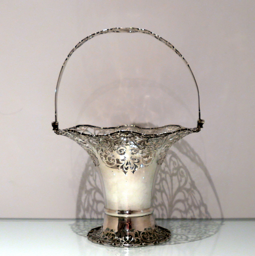 A fine sterling silver elongated vase shaped swing handled flower basket decorated with upper and lower elegantly intricate hand piercing. Â The upper bowl of the basket fans out for decorative highlights and the centre section is plain formed in design for the visual contrast.