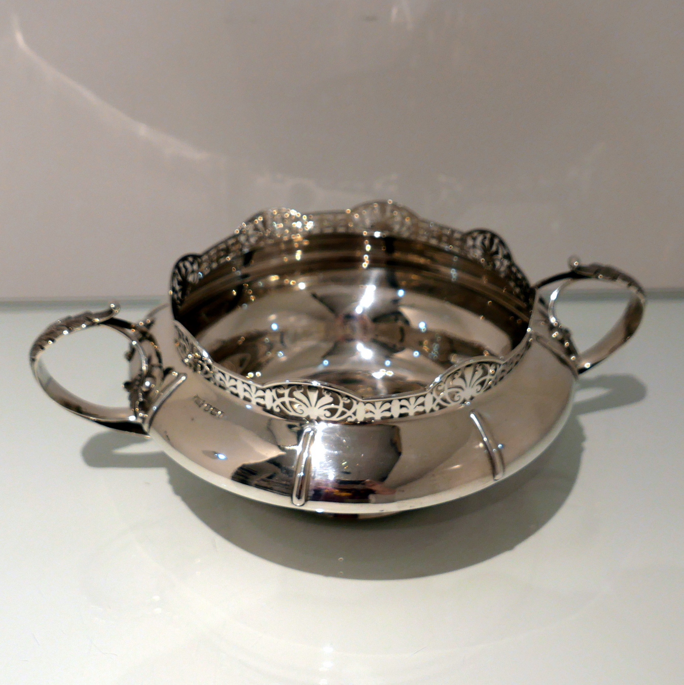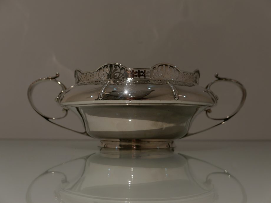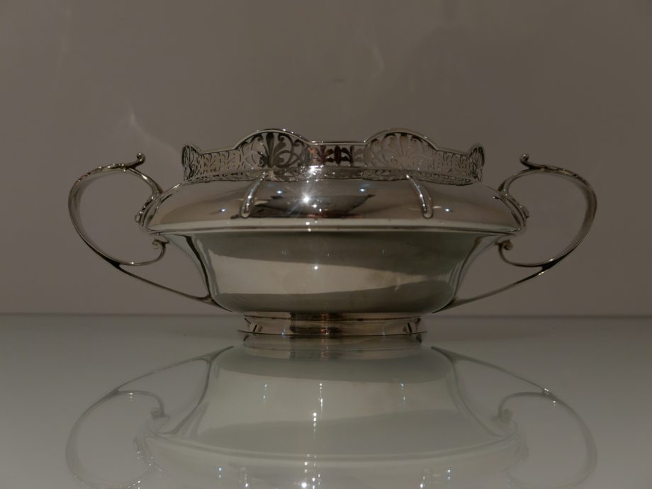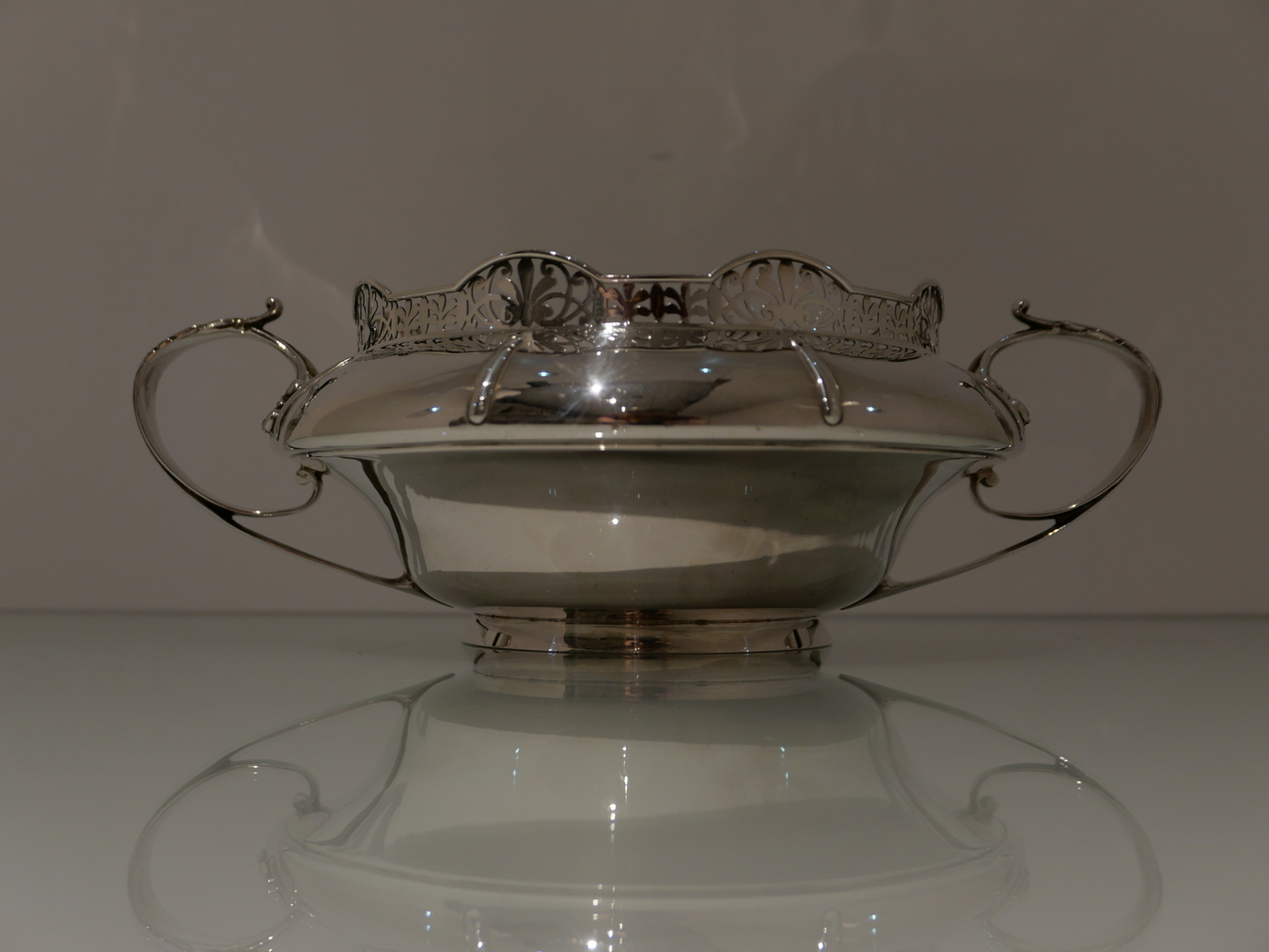 A delightful early 20th century sterling silver rose bowl decorated with an elegant upper pierced gallery and stylish ‘rib’ work mouldings to the outer body. Â The scroll formed wire work handles are unusually designed.