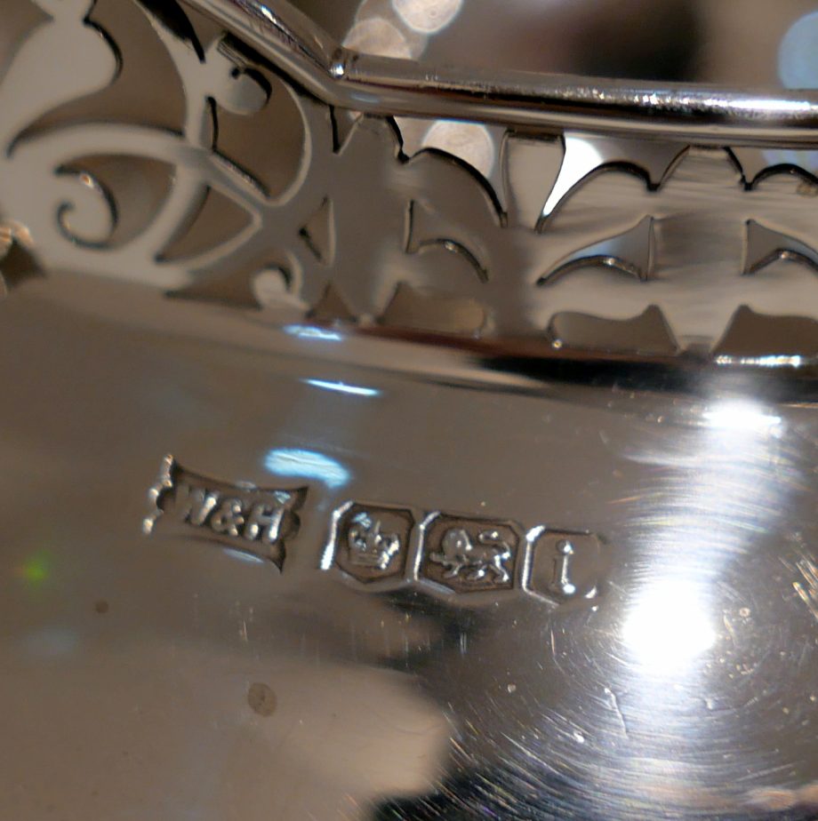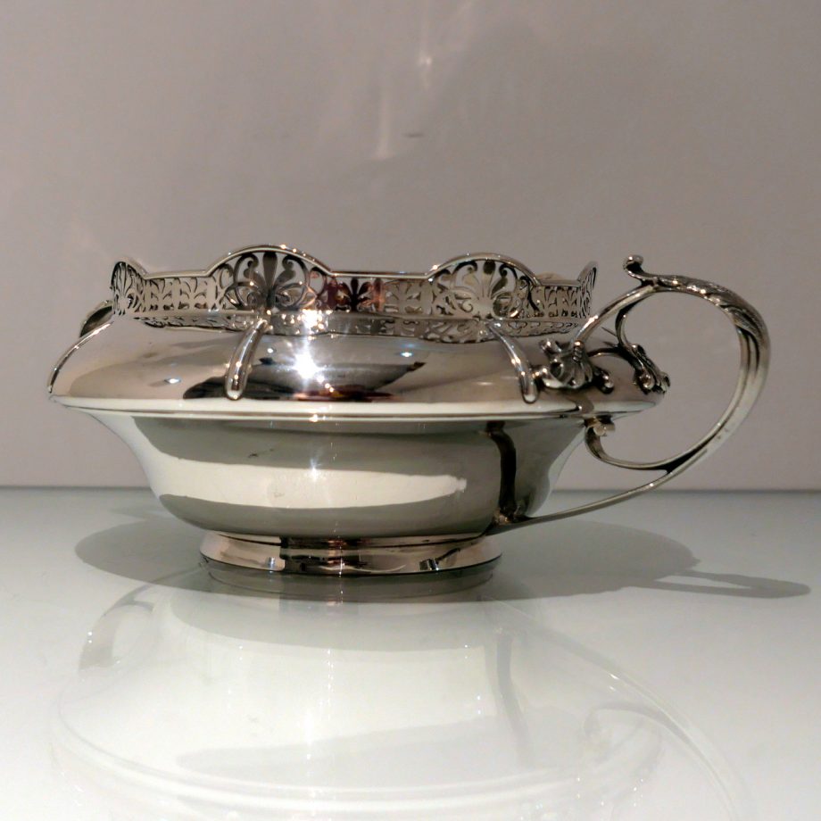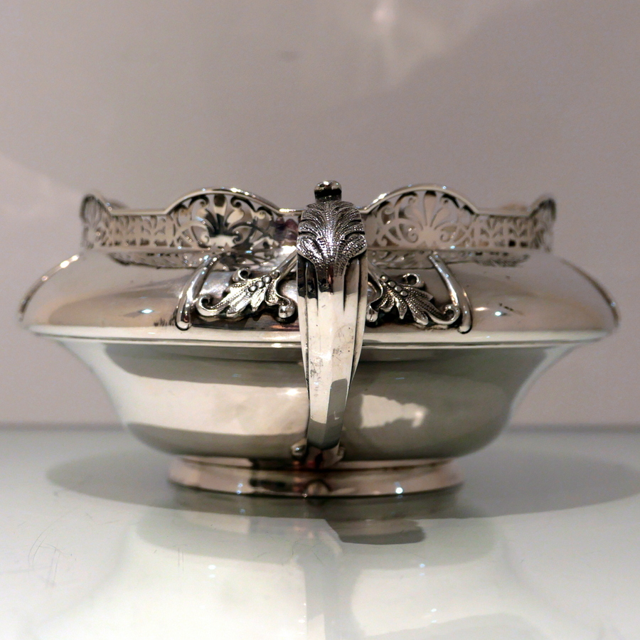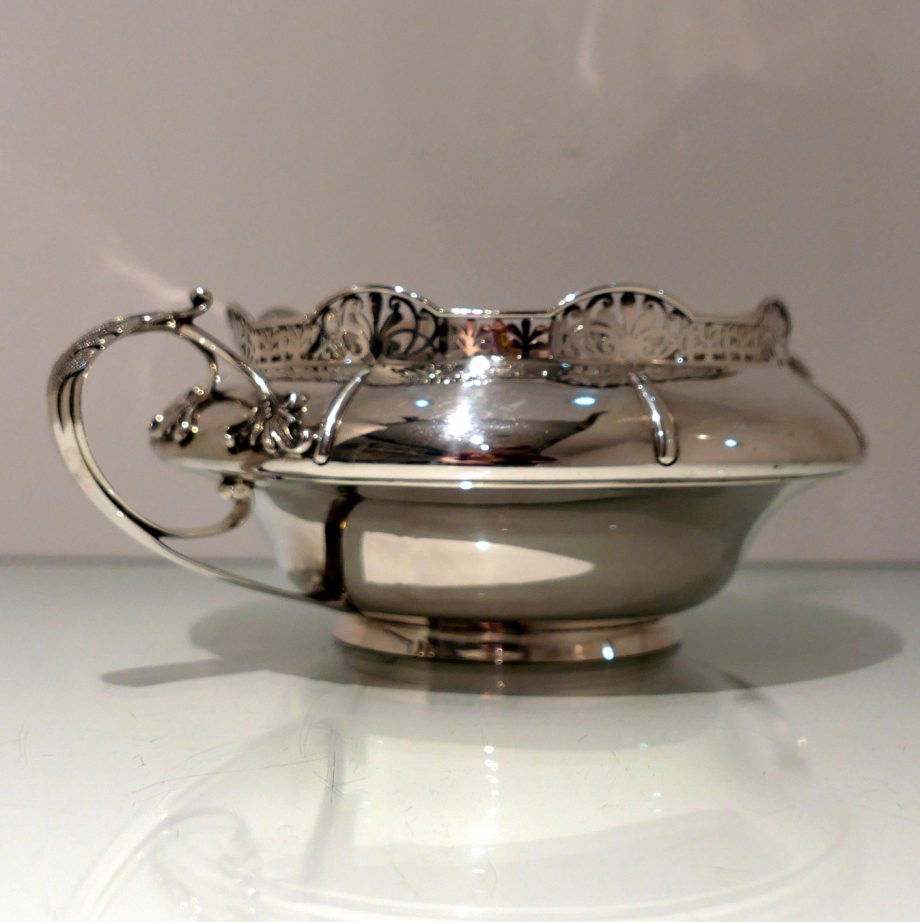 A delightful early 20th century sterling silver rose bowl decorated with an elegant upper pierced gallery and stylish ‘rib’ work mouldings to the outer body. Â The scroll formed wire work handles are unusually designed.