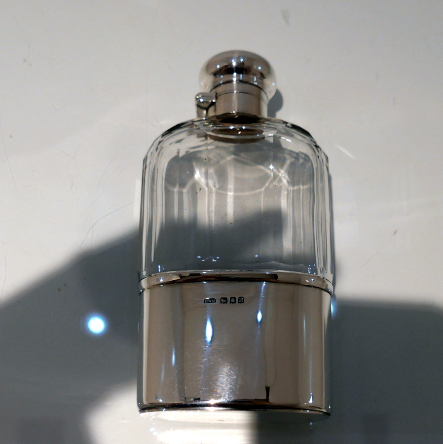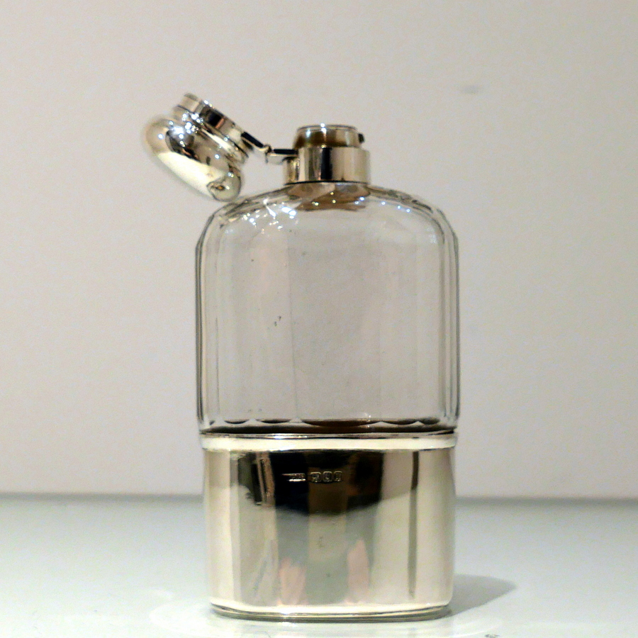 Early 20th Century Antique George V Sterling Silver & Glass Hip Flask London 1914/6 maker PWG