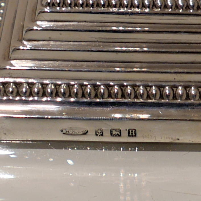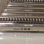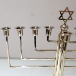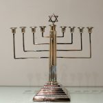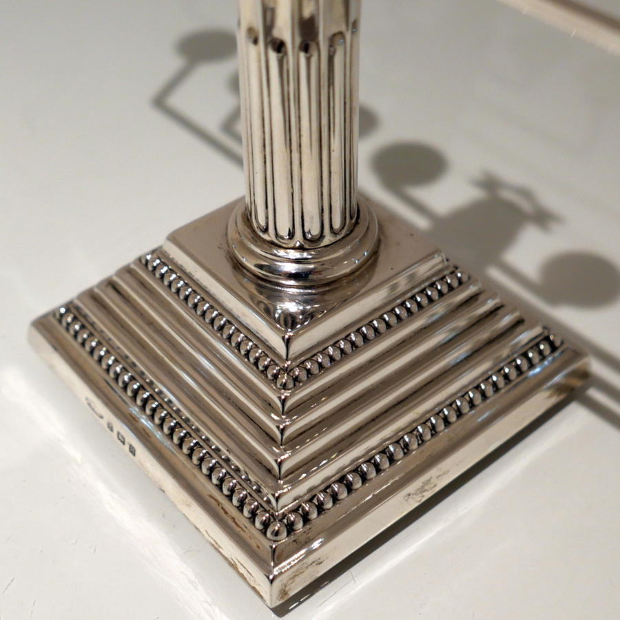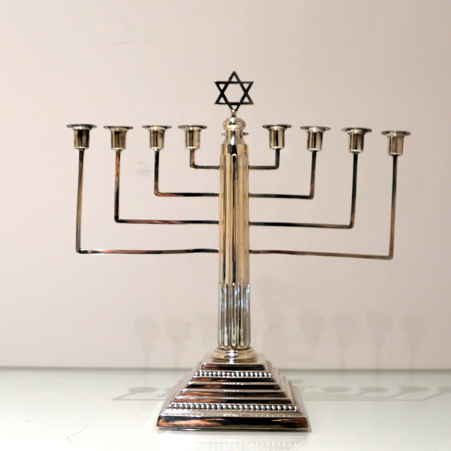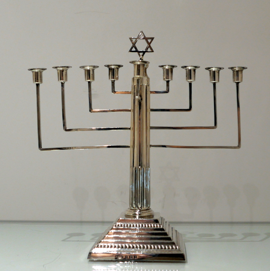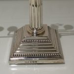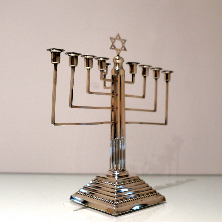 A stylish early 20th century sterling silver menorah designed with an elegant bead wire ‘stepped’ foot for lowlights. Â The rectangular ‘tubed’ plain formed wire branches create a sumptuous decorative contrast to the corinthian style stem and the shammas (servant) is fixed.