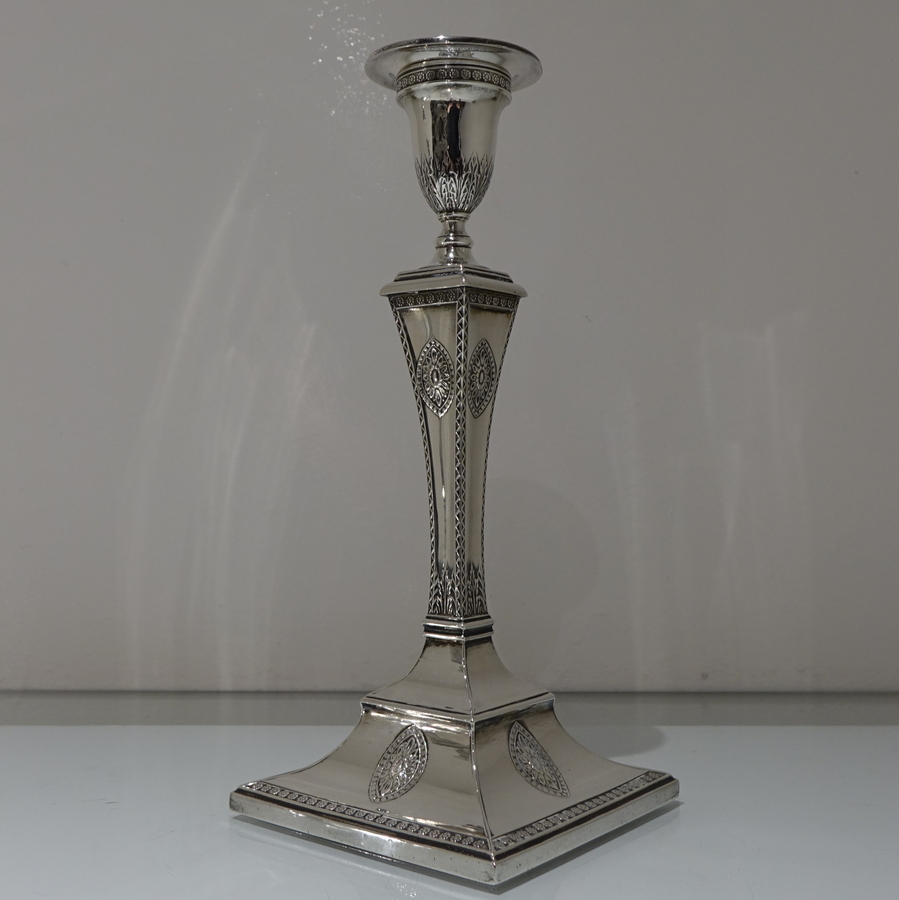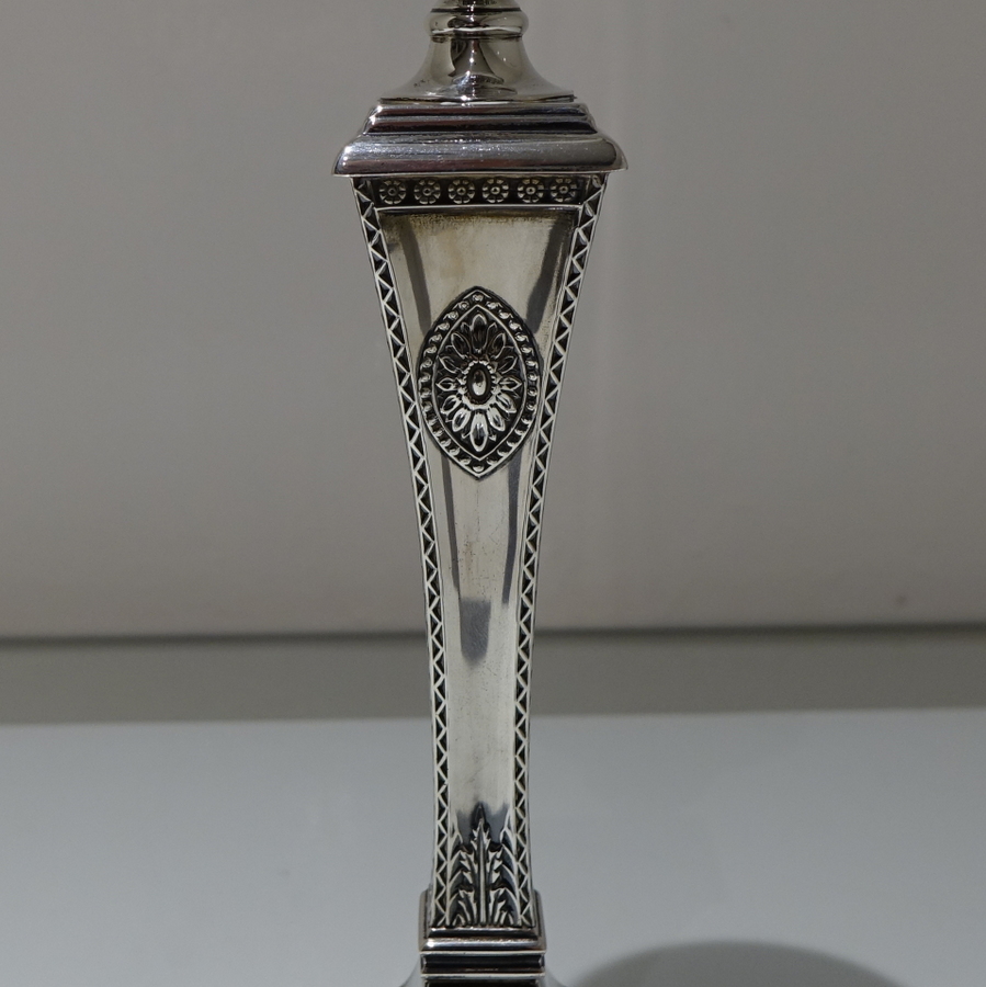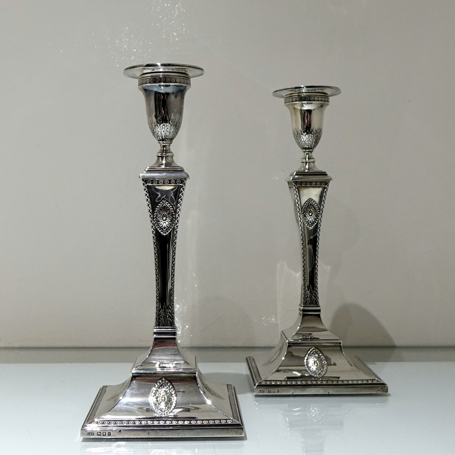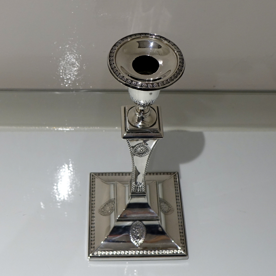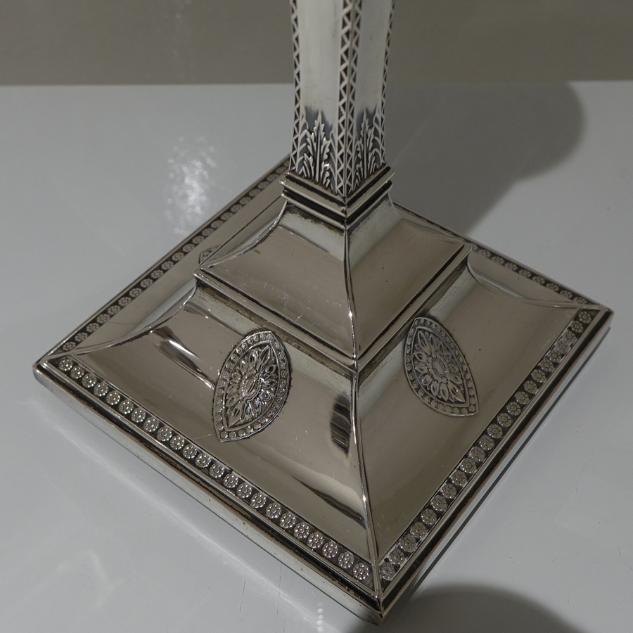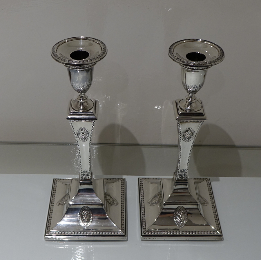 A stunning pair of square based silver candlesticks decorated with ornate framed continuing borders and asymmetrical oval floral plaques.