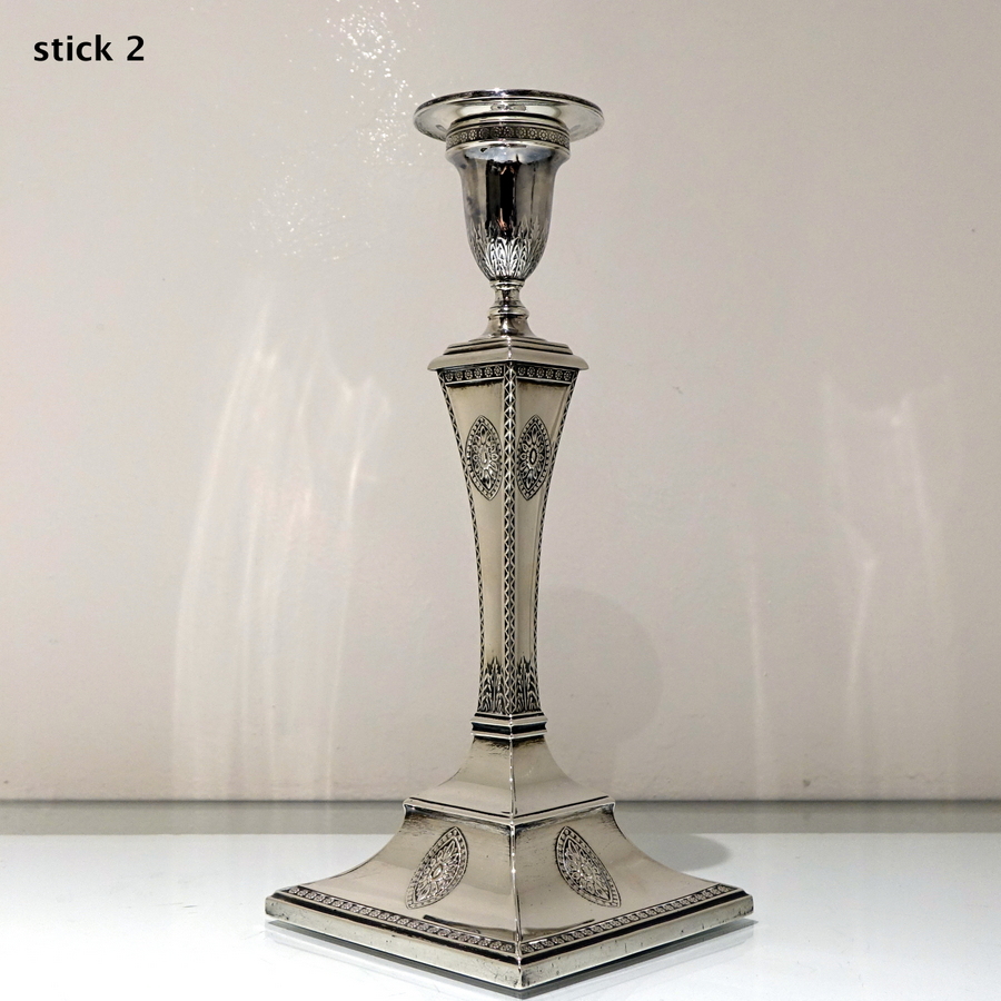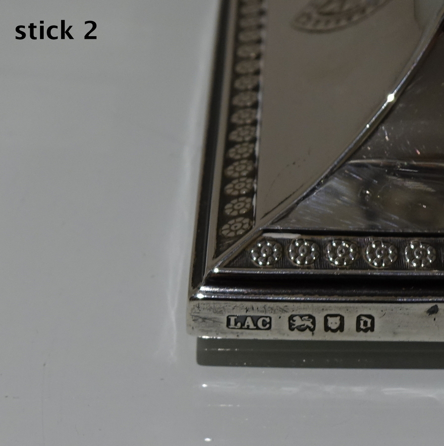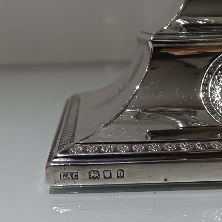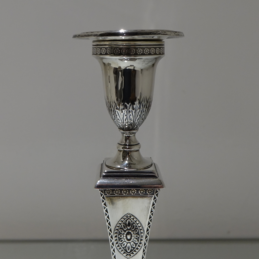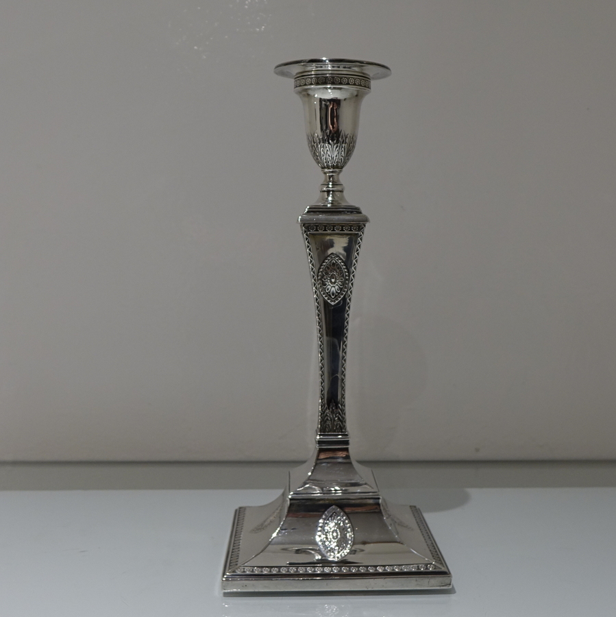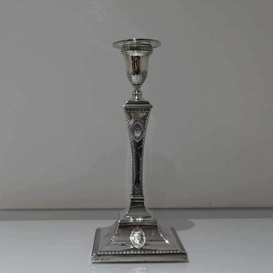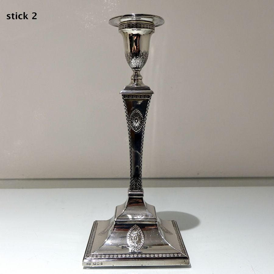 A stunning pair of square based silver candlesticks decorated with ornate framed continuing borders and asymmetrical oval floral plaques.