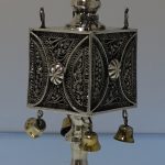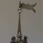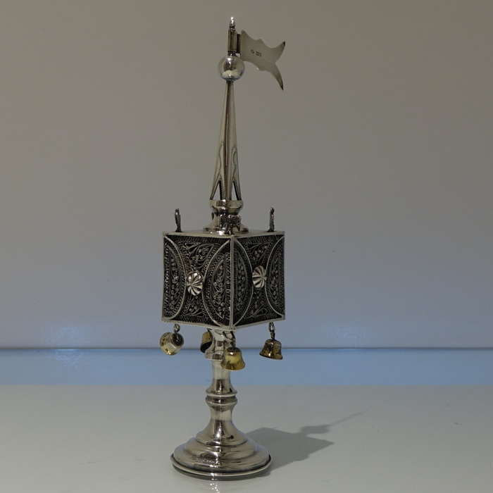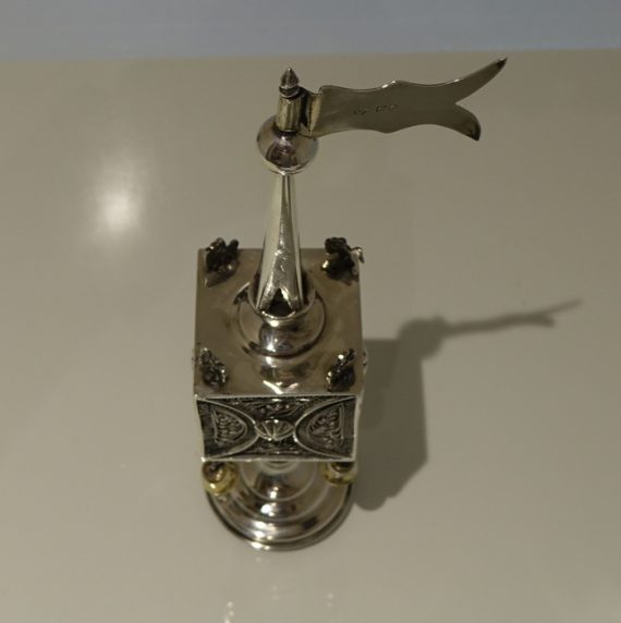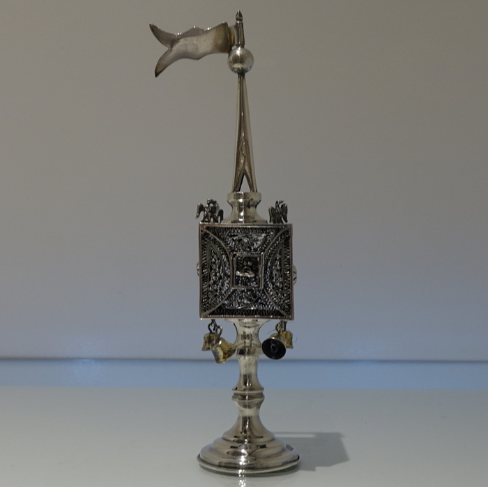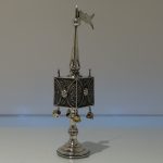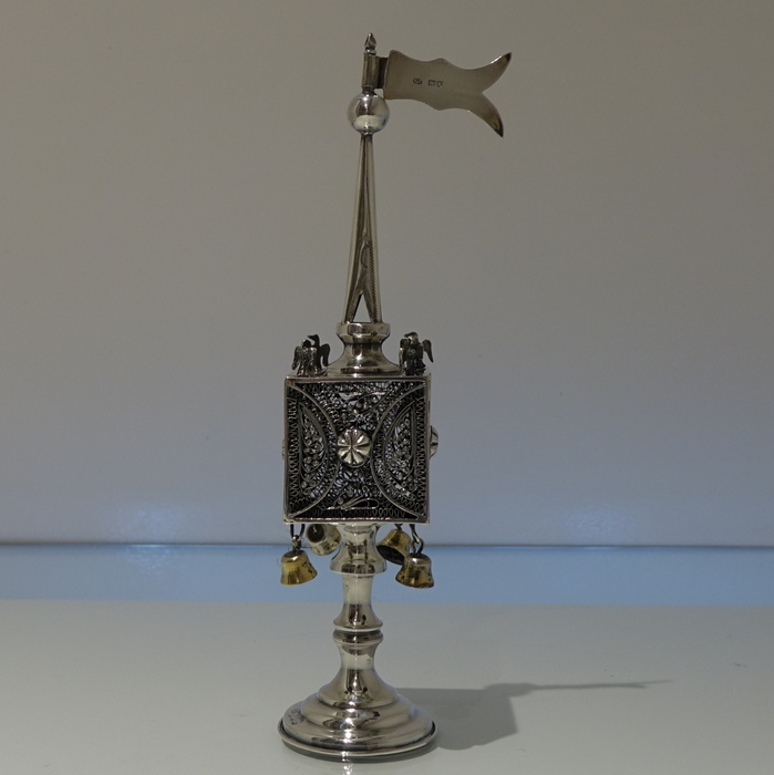 A stylish and extremely rare example of a early 20th century spice tower. Â The central spice compartment is cube designed with intricate filigree walls for decoration and has a hinged door for access. Â The foot is circular and the mast has a sheet silver flag held aloft in full flight.
