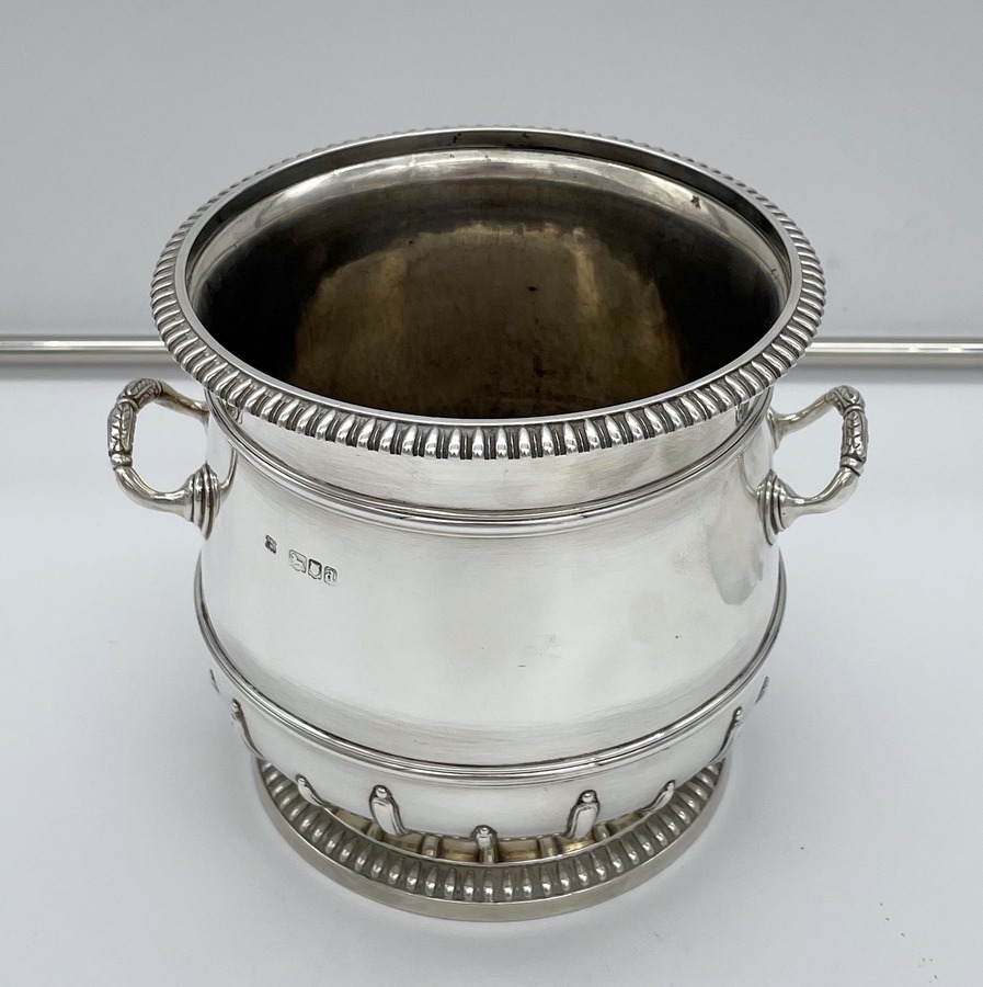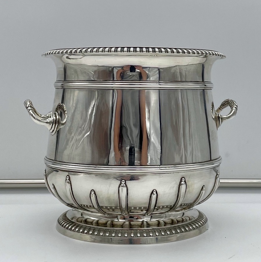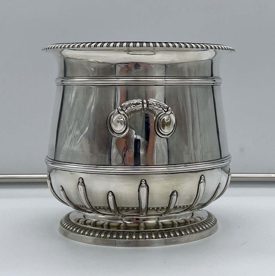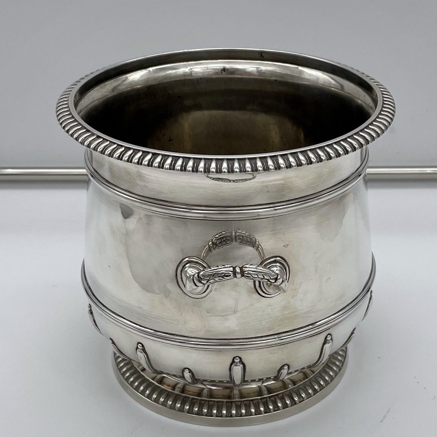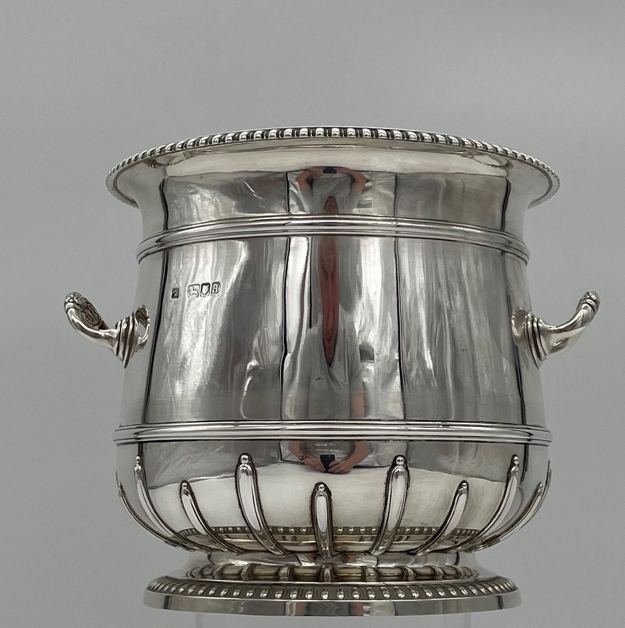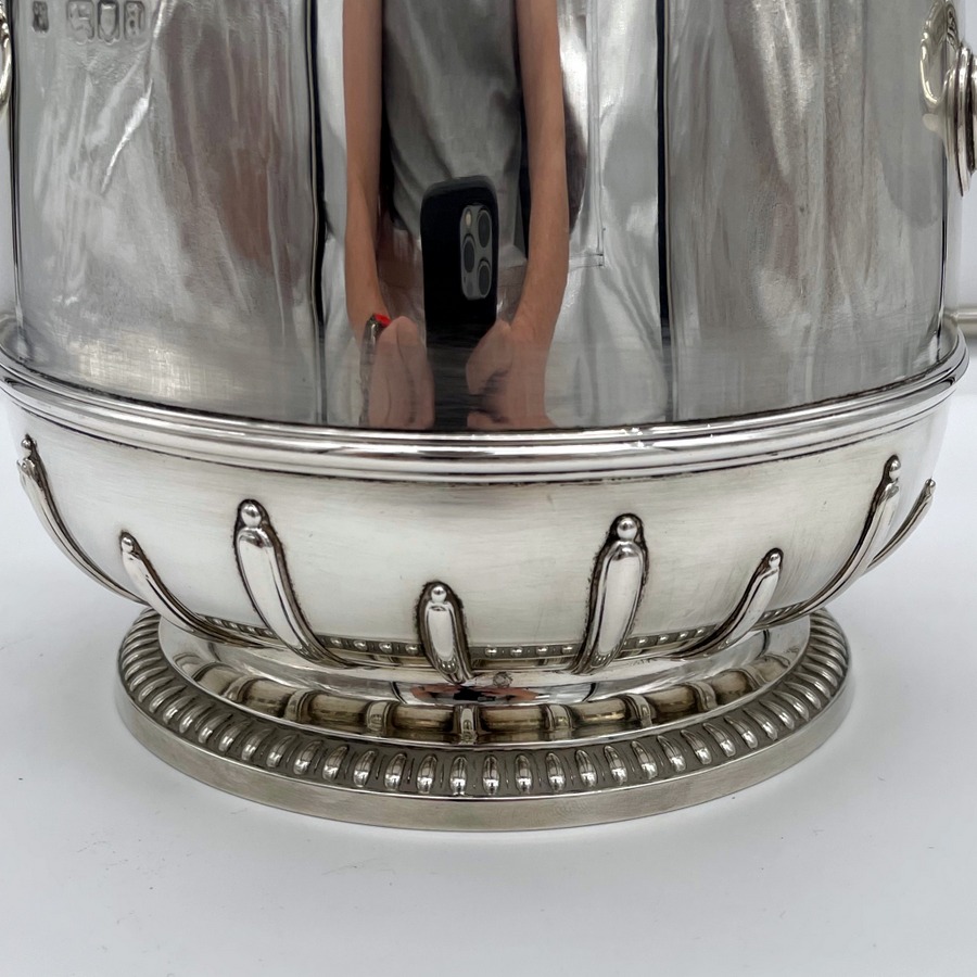 A rare and truly delightful silver wine cooler decorate with stylish strapwork bands and eye catching girdles. There are two ornate applied cast handles.