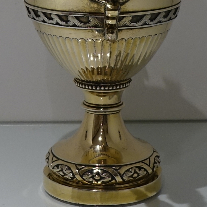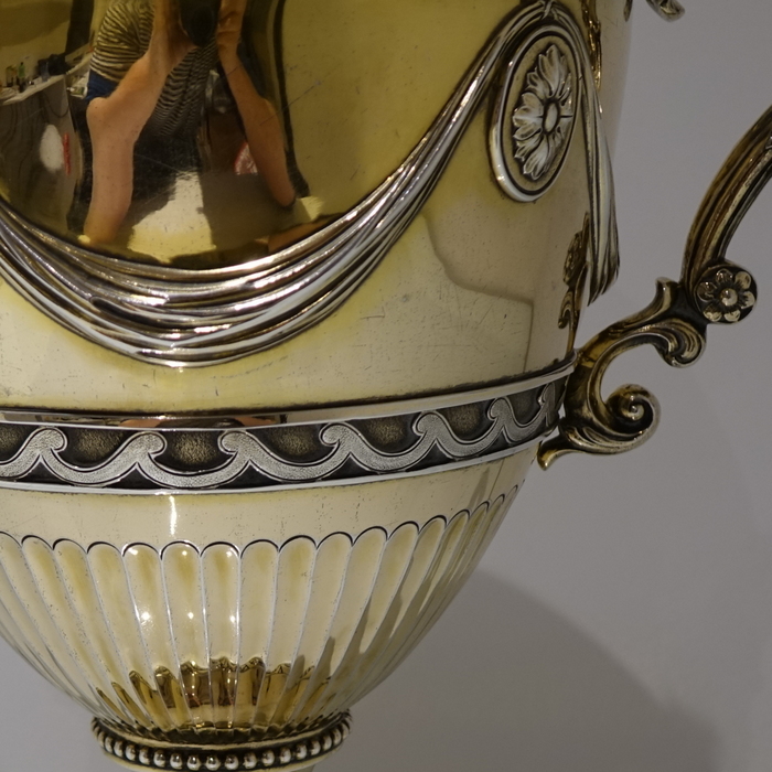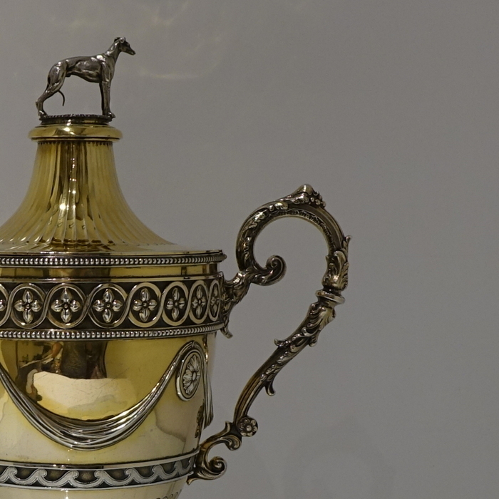 A truly spectacular large silver gilt partial fluted cup and cover with detachable lid which is crowned with a stylish grey hound finial. Â The body of the cup has bead highlights which is set between an ornate border under which sits elegant streams of ribbon entwined around rosette plaques.