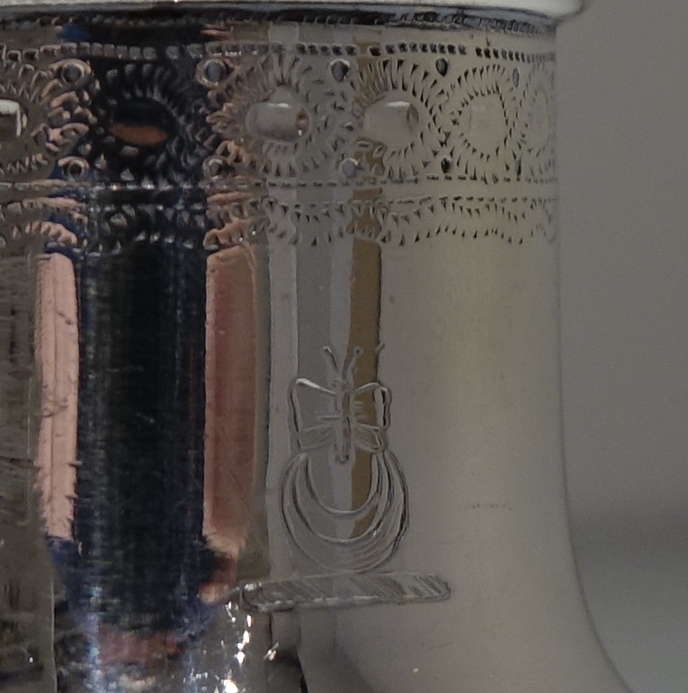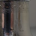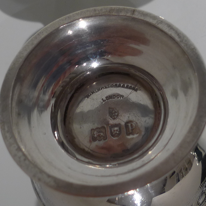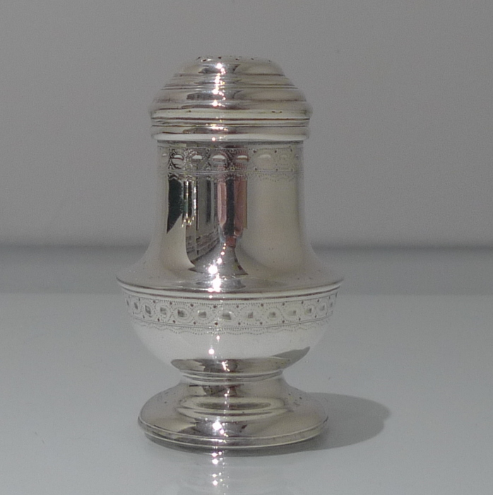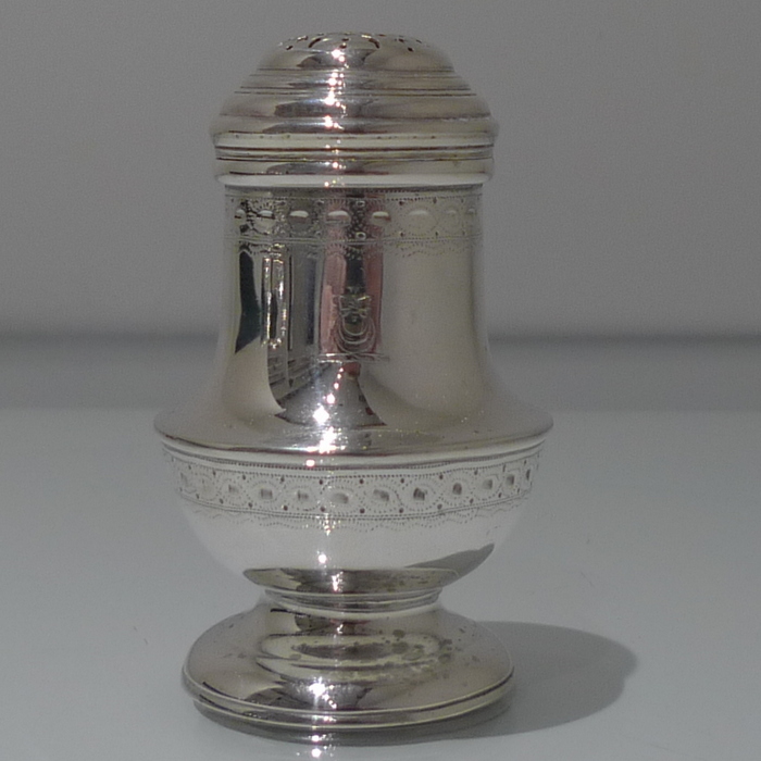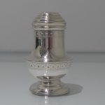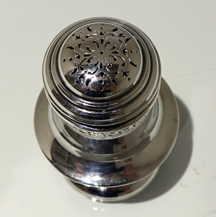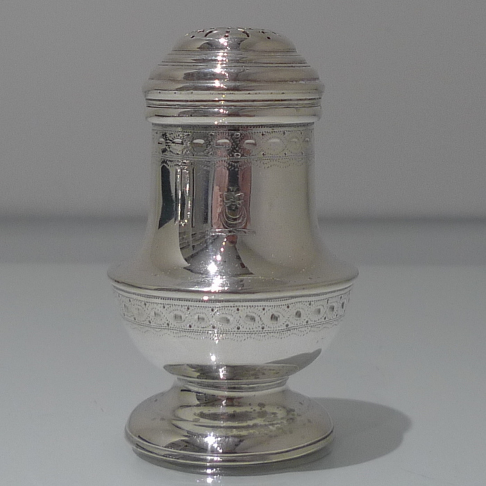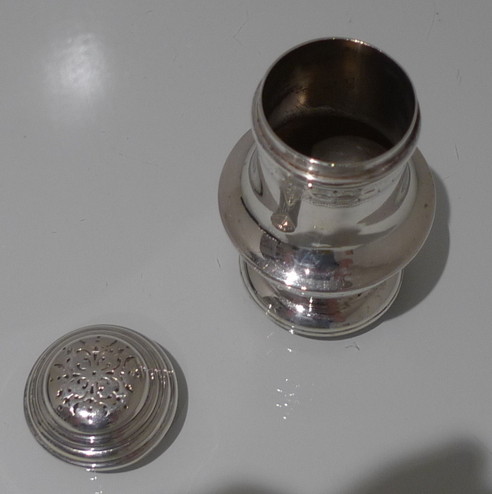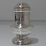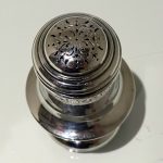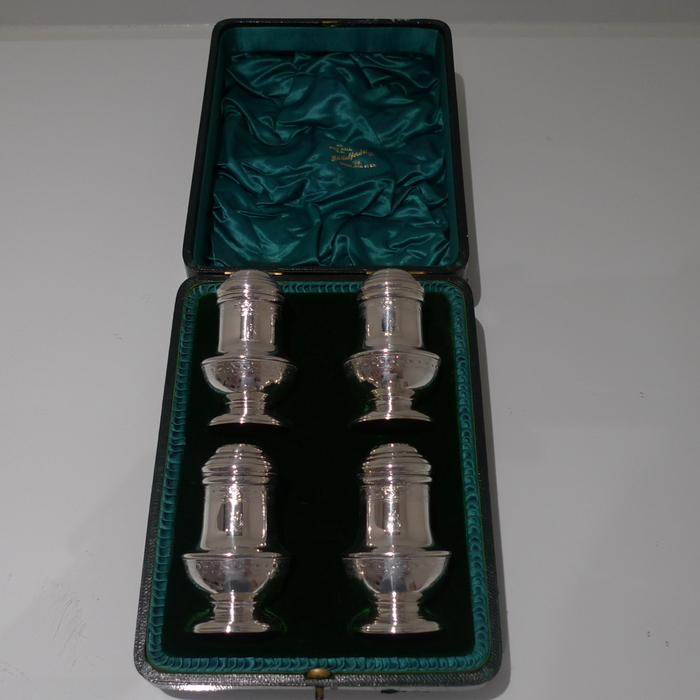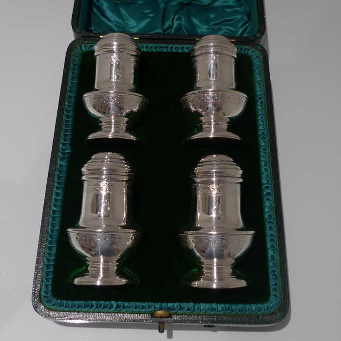 A stylish and extremely rare set of four George V suite of four peppers in velvet lined presentation case. Â The peppers have two elegant bands of engraving for decoration and there is a contemporary crest for importance. Â The “bun” lids are ornately pierced and detachable.