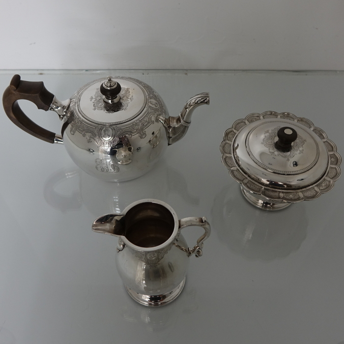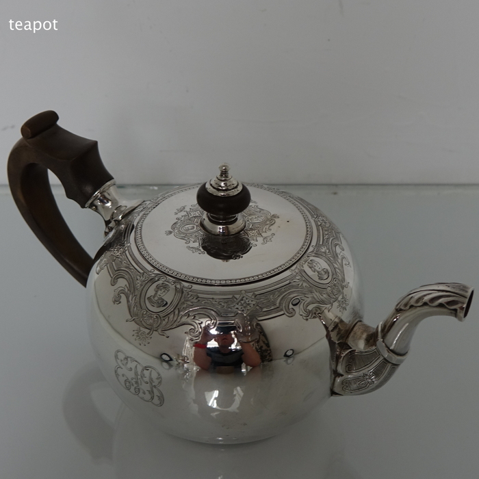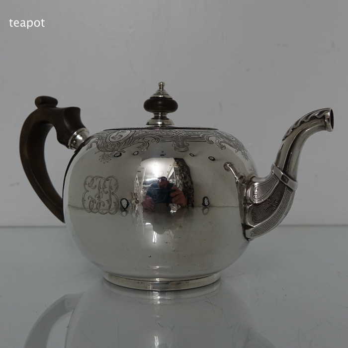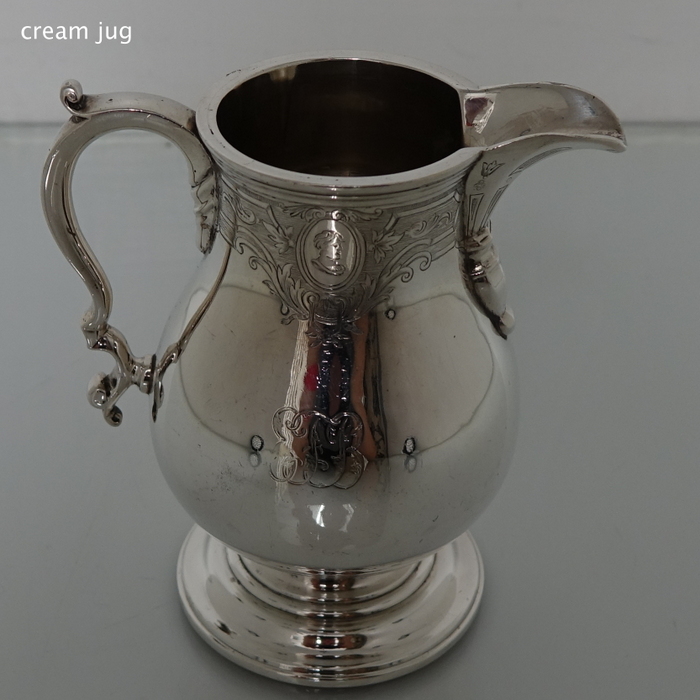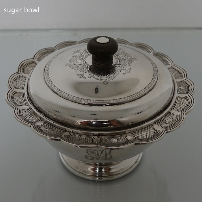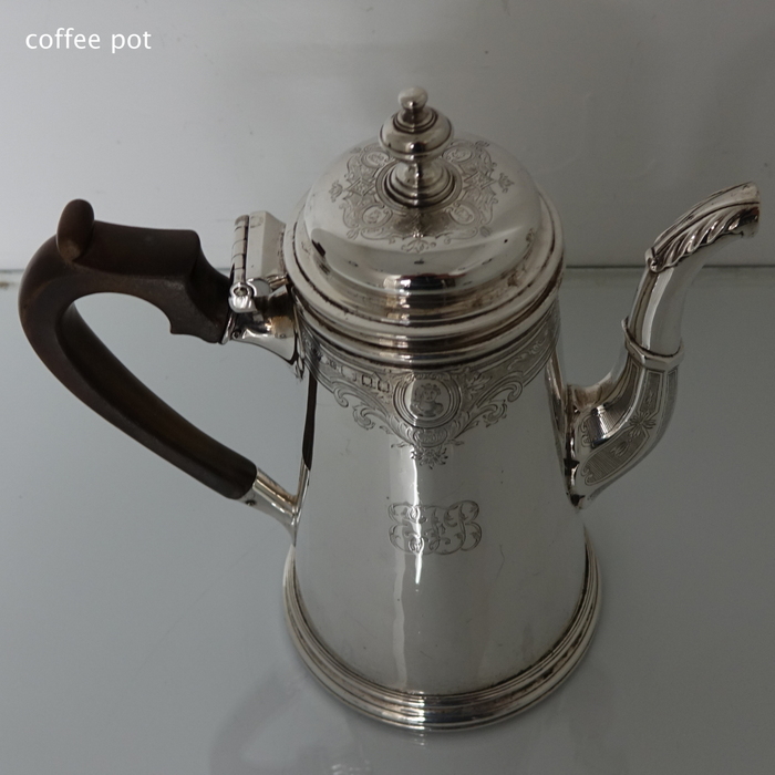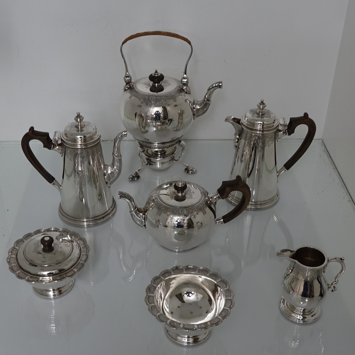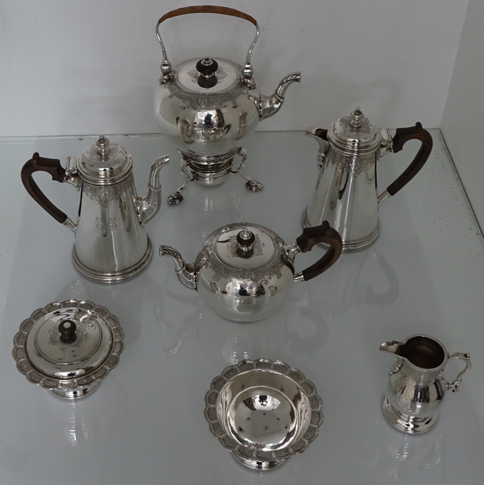 A magnificent large George V tea and coffee set, compromising of kettle on stand, teapot, coffee pot, hot water jug, covered sugar bowl, slot bowl and cream jug. Â All pieces have a stylish intricate bright cut engraved border for highlights. Â There is a single entwined contemporary initial for importance.