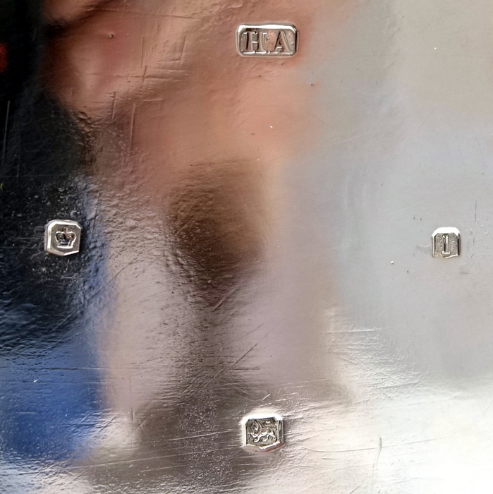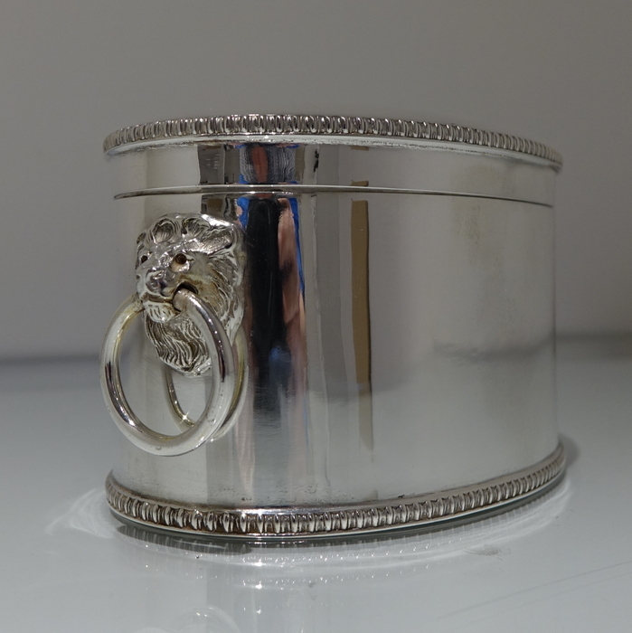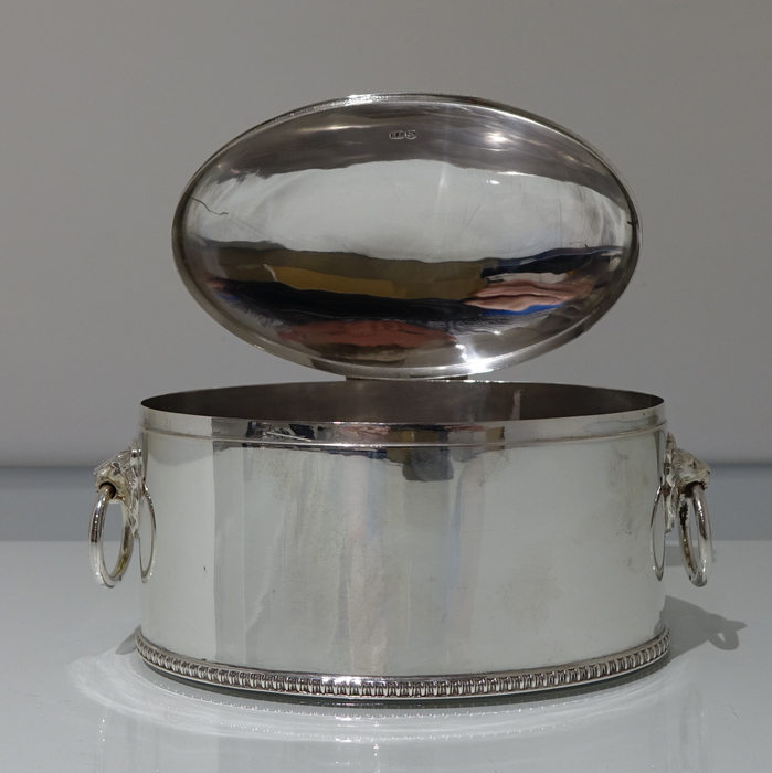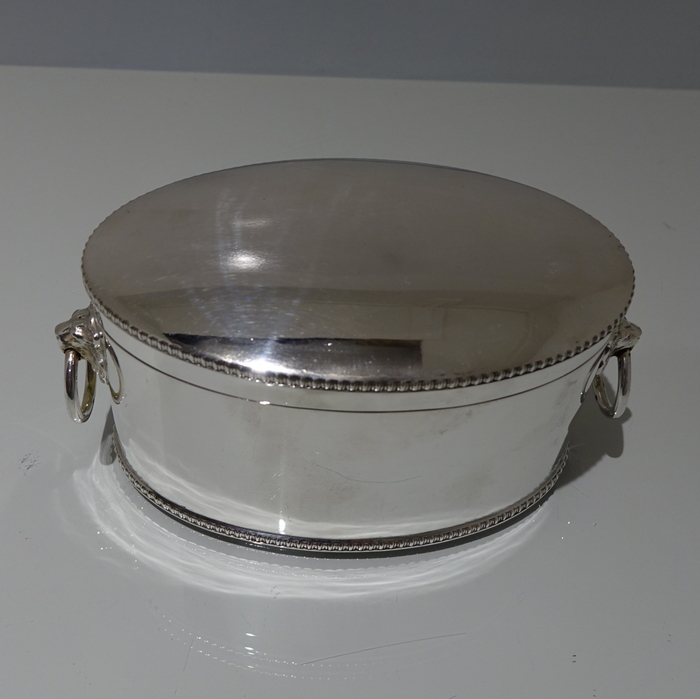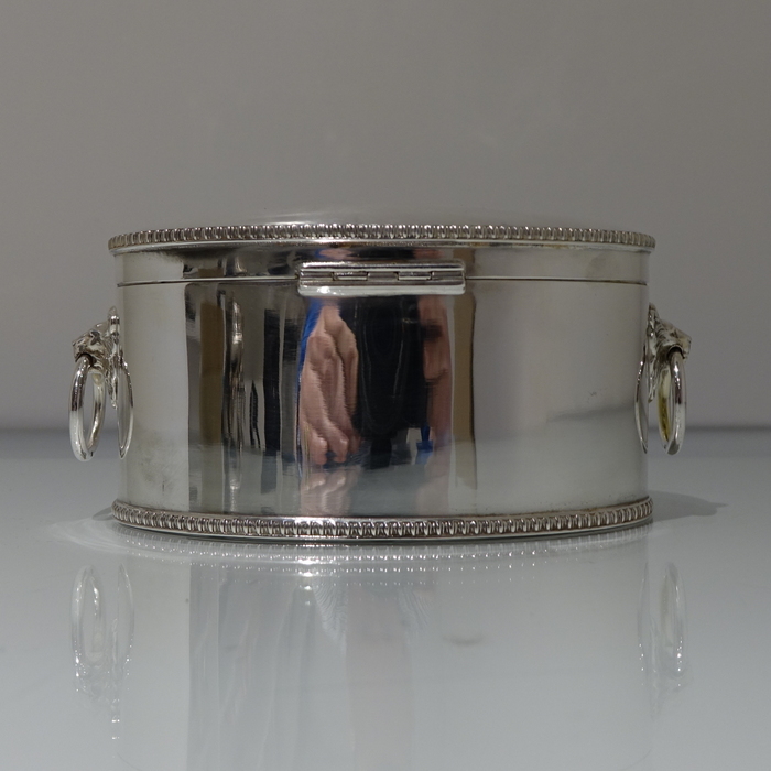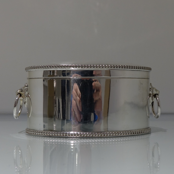 A stylish plain formed oval silver biscuit box with hinged lid. Â The sides of the body have elegant drop ring lion mask handles and there is an upper and lower gadroon border for decoration.