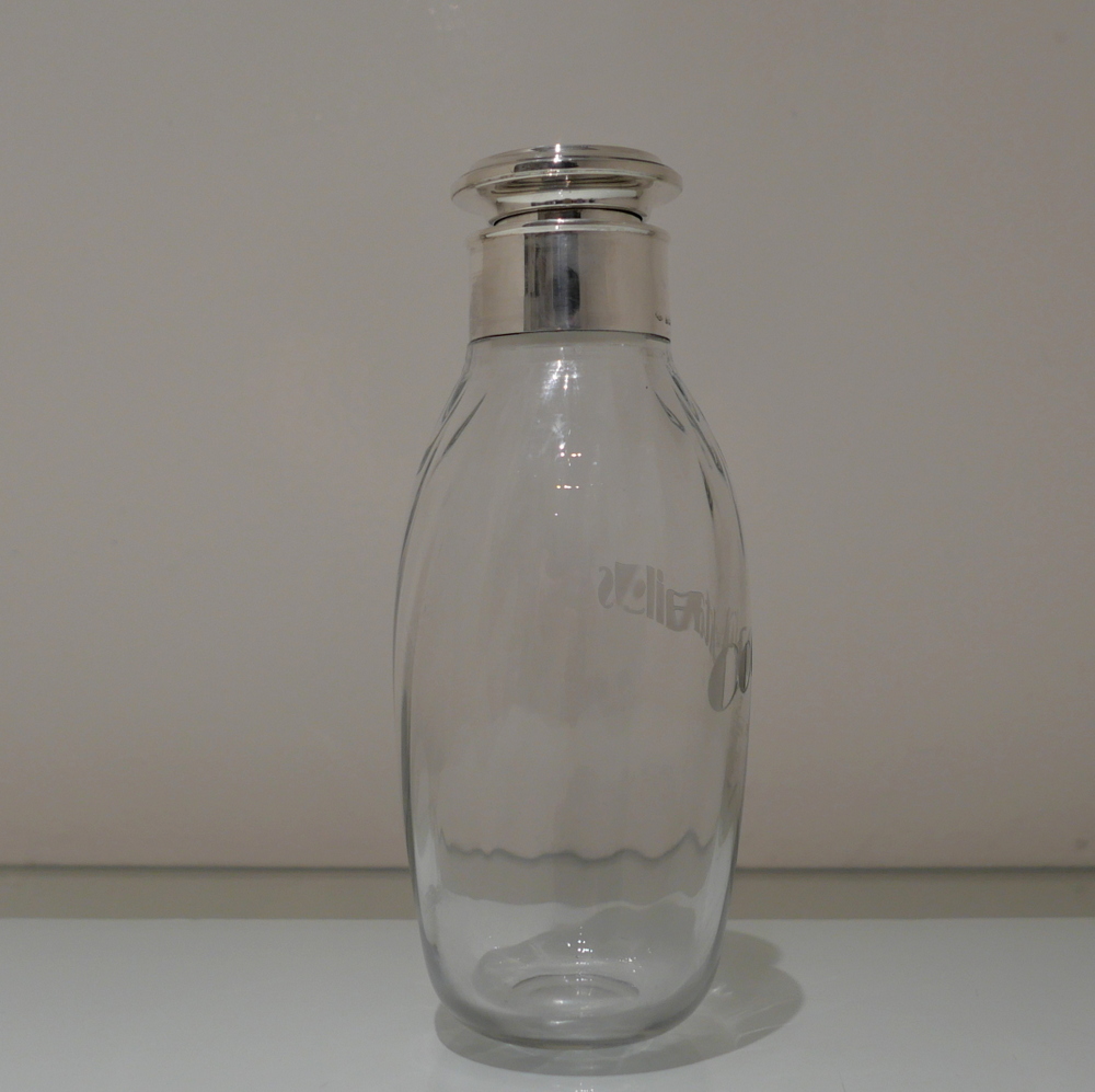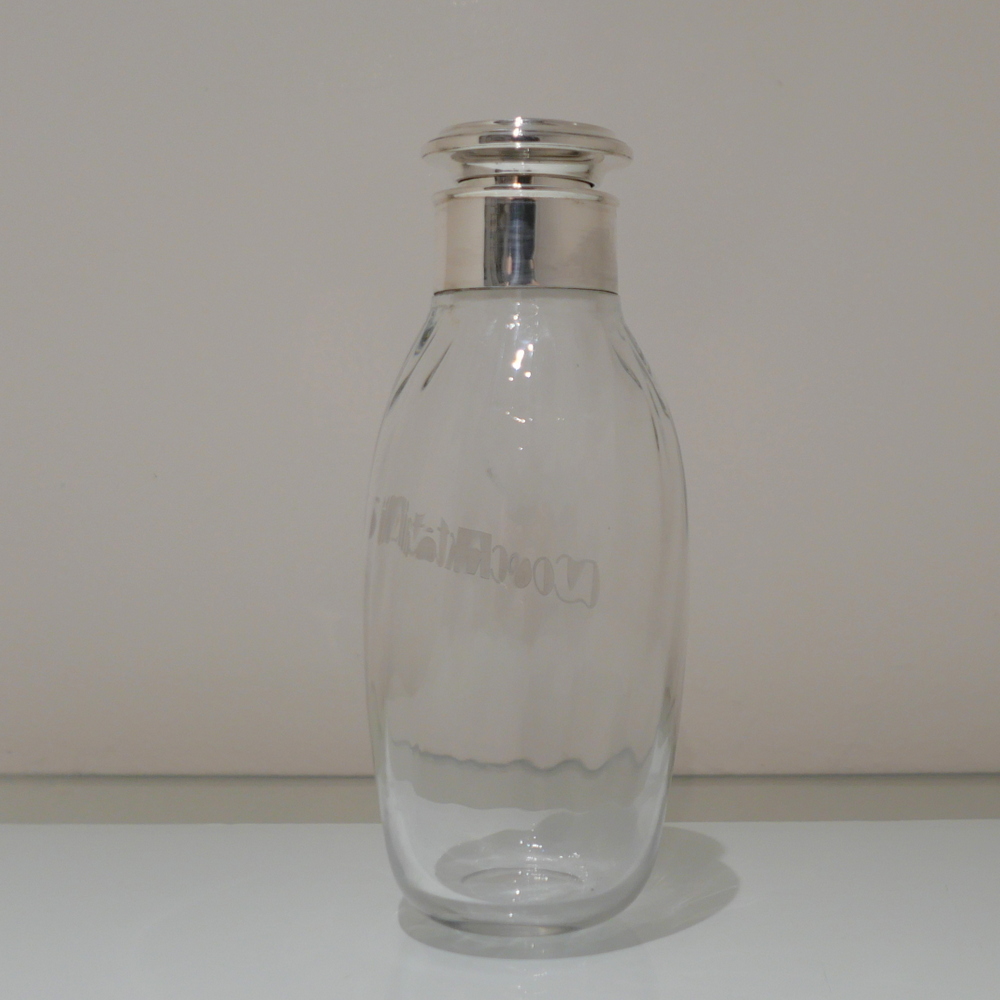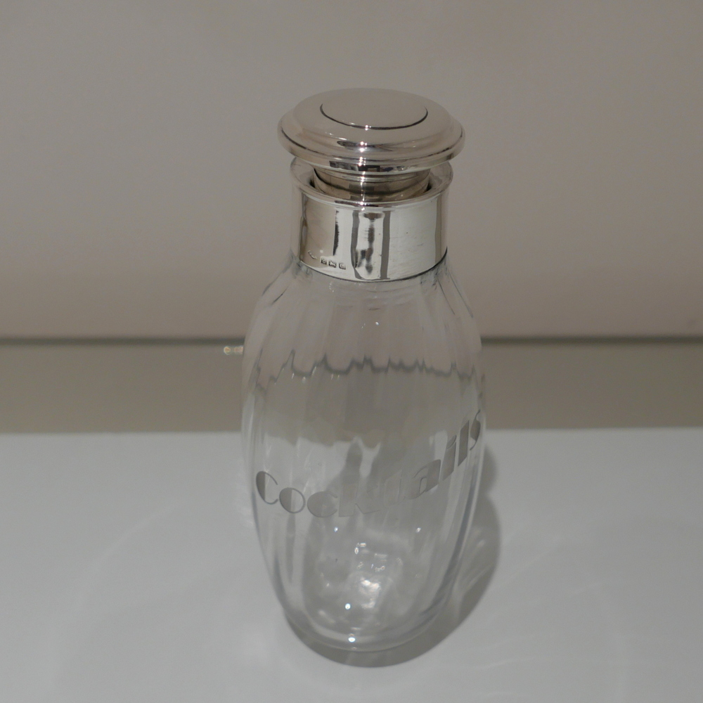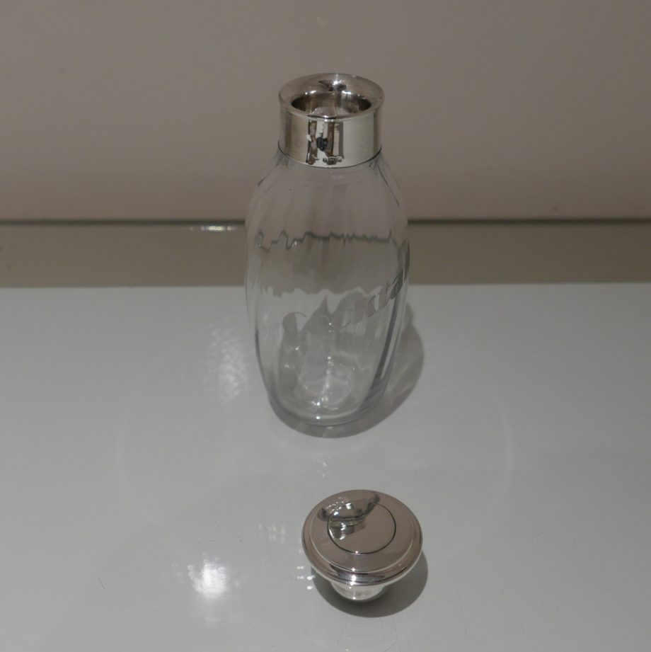 A stylish early 20th century art deco silver and glass cocktails shaker. Â The silver neck is plain formed in design and has a “pull off” deco style stopper. Â The clear blown glass bowl has “cocktails” elegantly etched into the centre front.