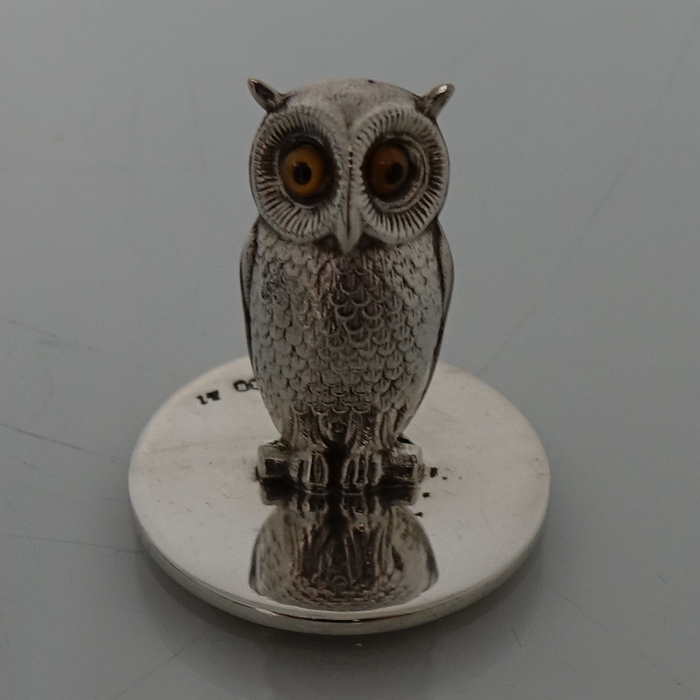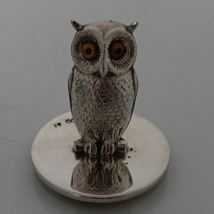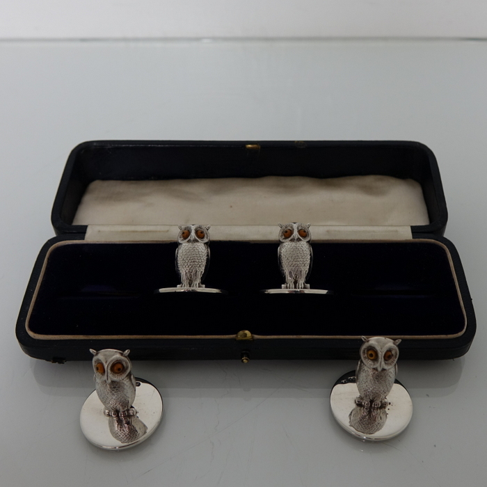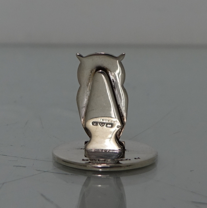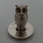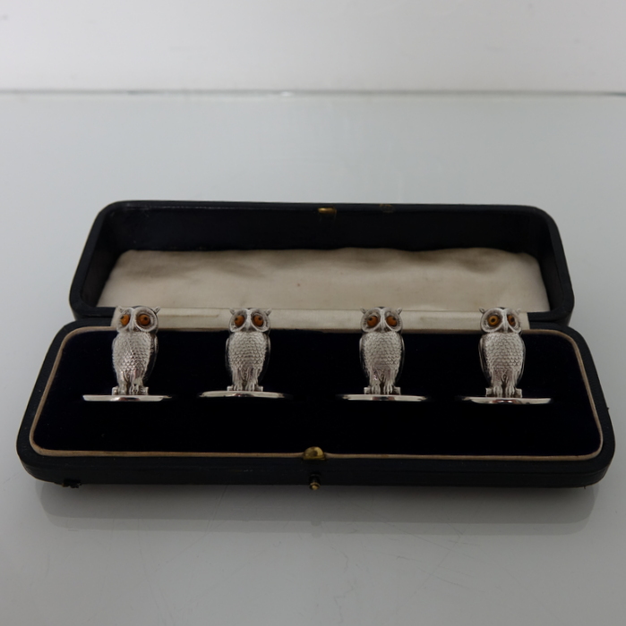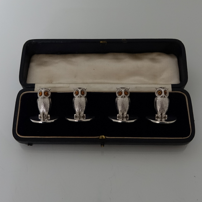 A highly collectable set of four owl themed novelty menu holders in black leather presentation box. Â The menu holders are life like in design with feather etched wings and naturalistic eyes and sit on a stylish plain circular disc.