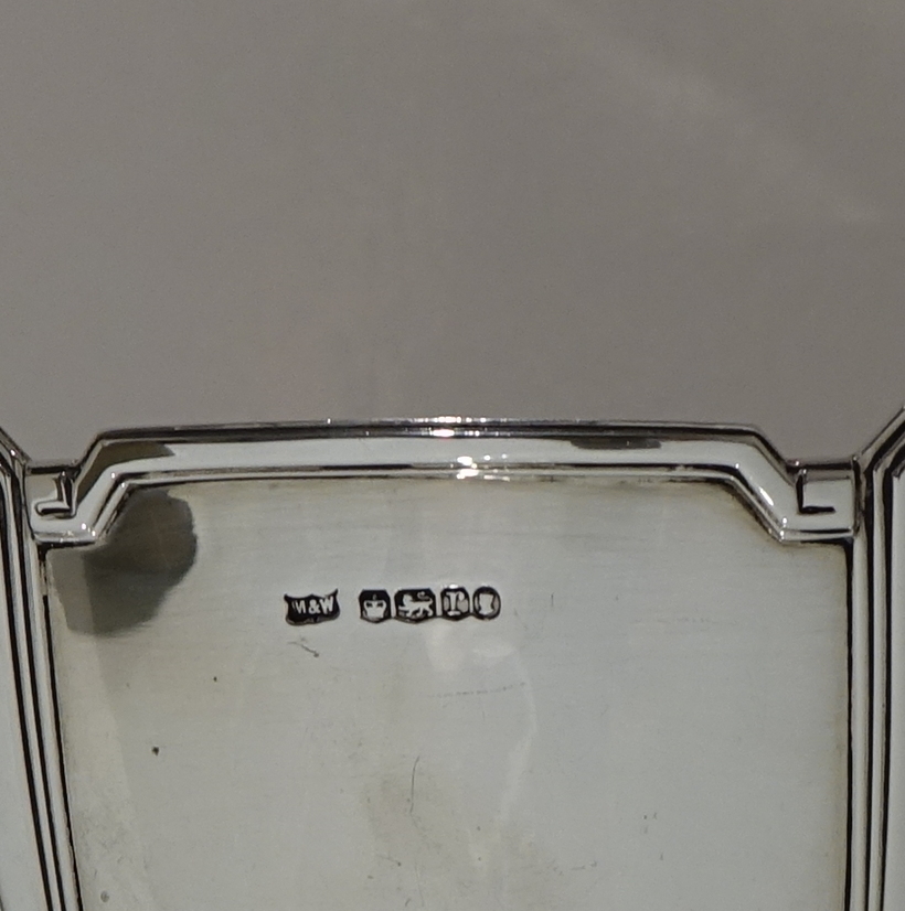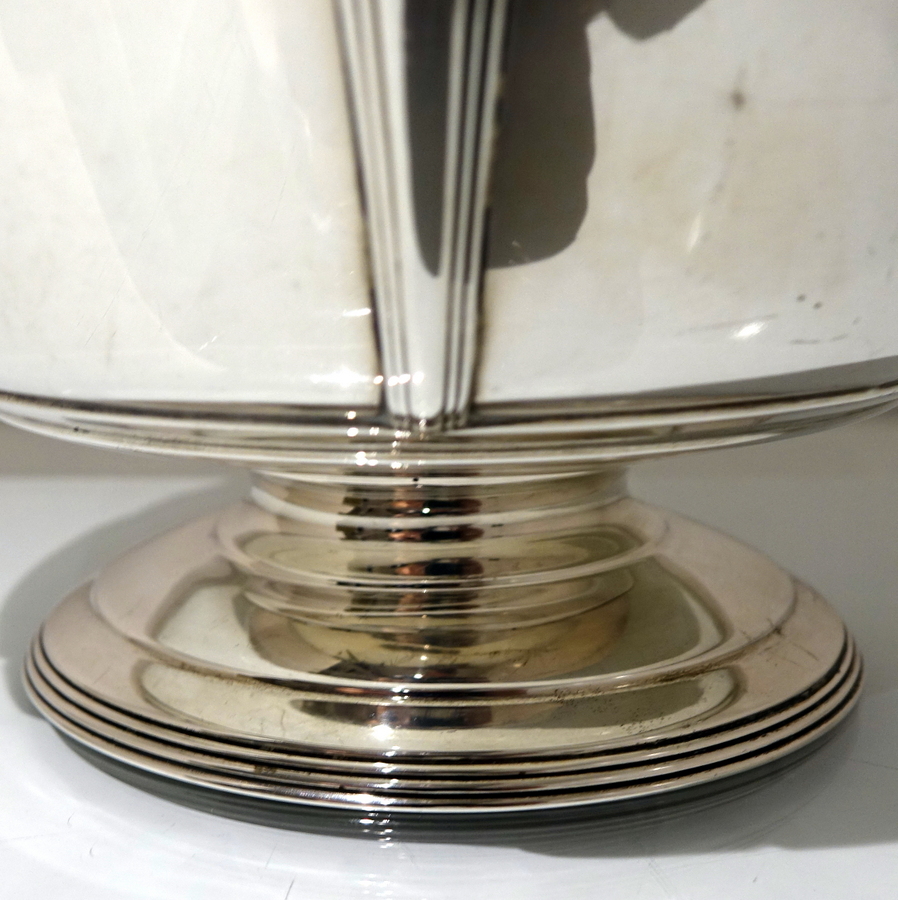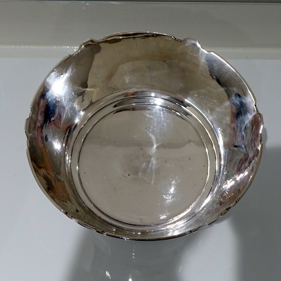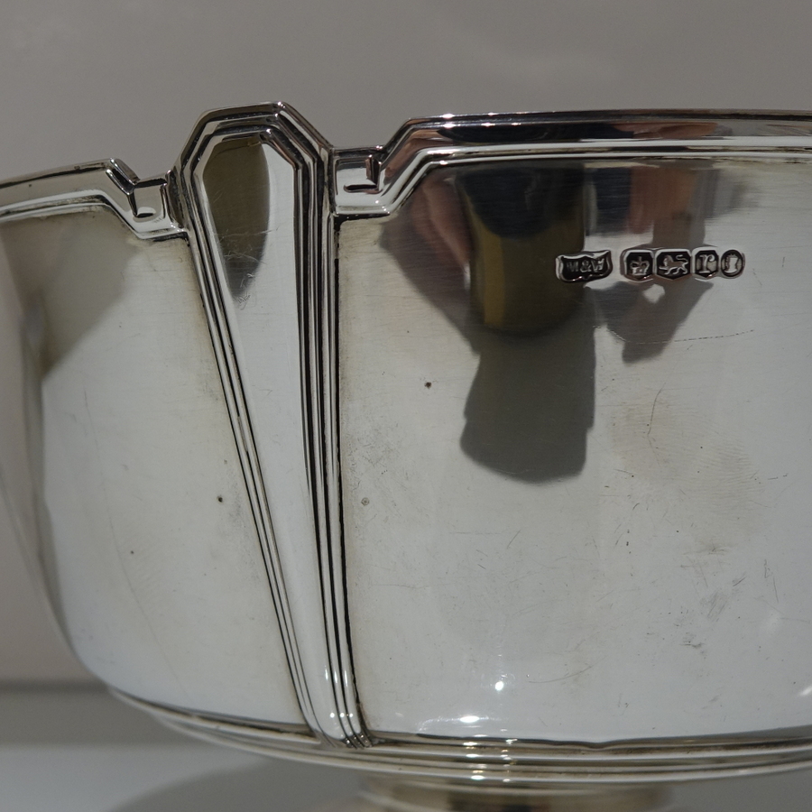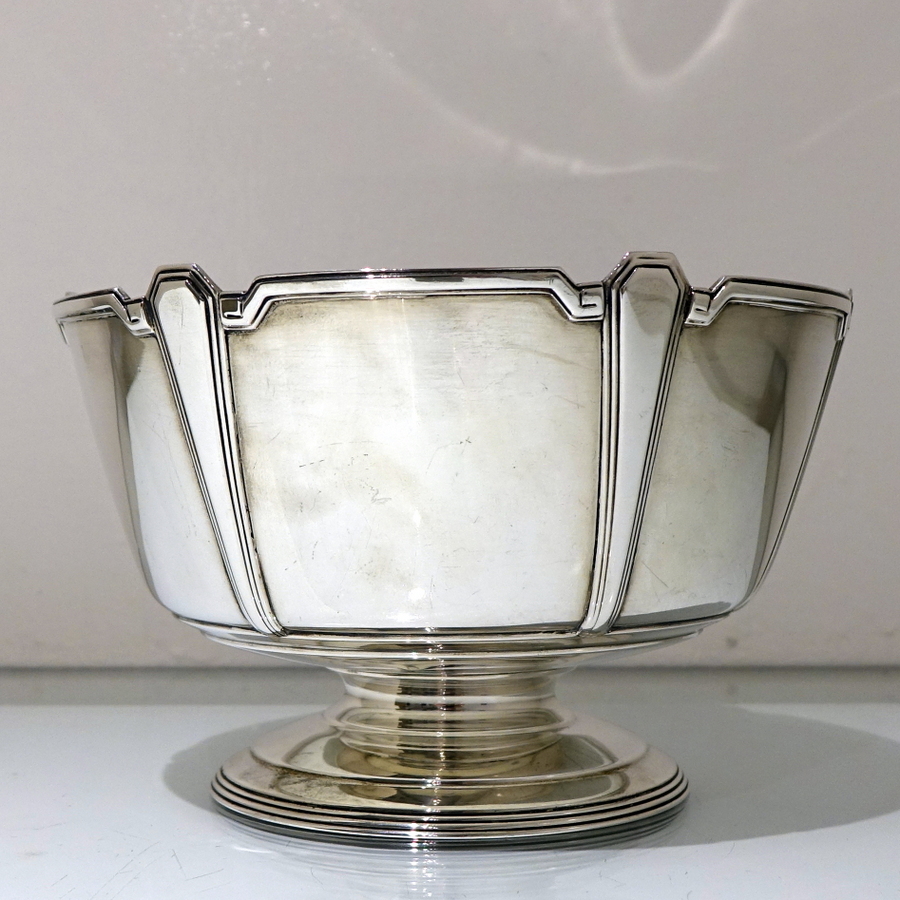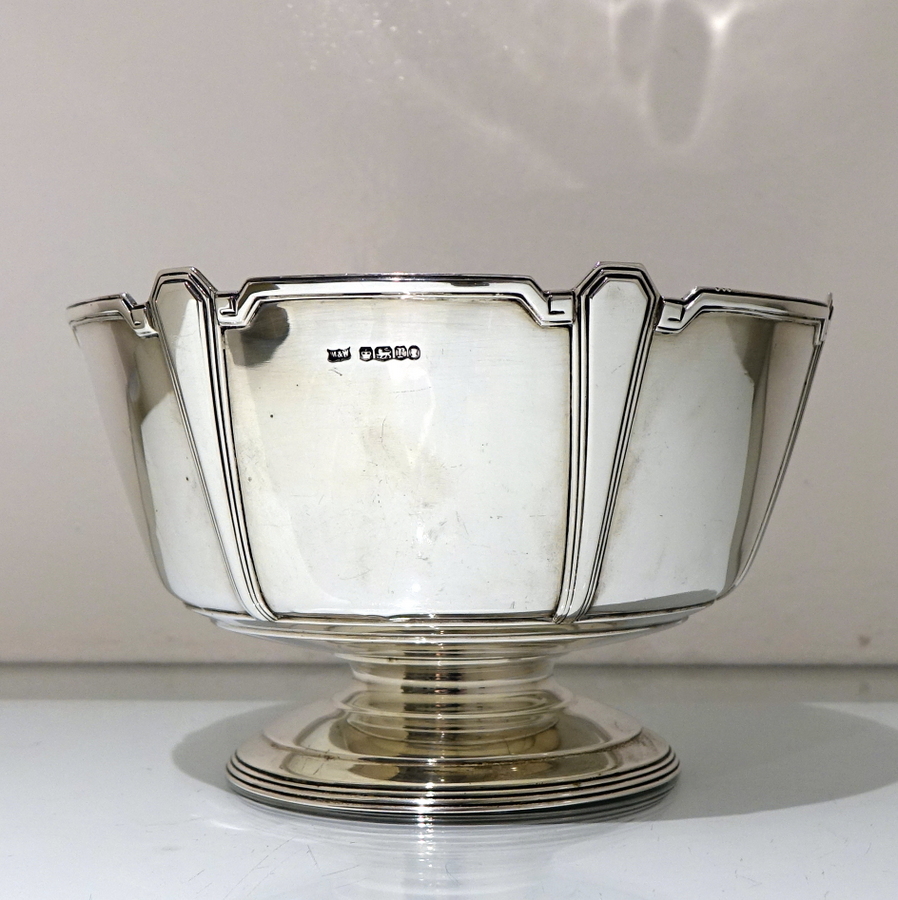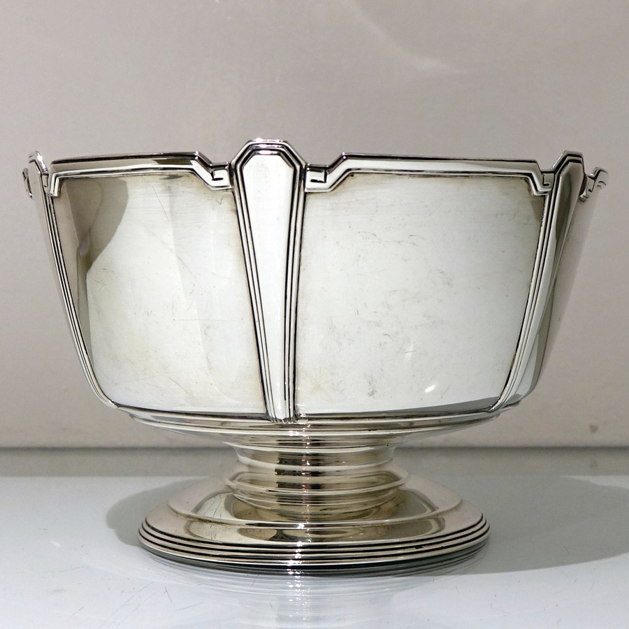 A very stylish mid-sized circular art deco silver rose bowl decorated with elegant strap work framed panels to the body of the bowl which then sits on a reed bordered raised pedestal foot.