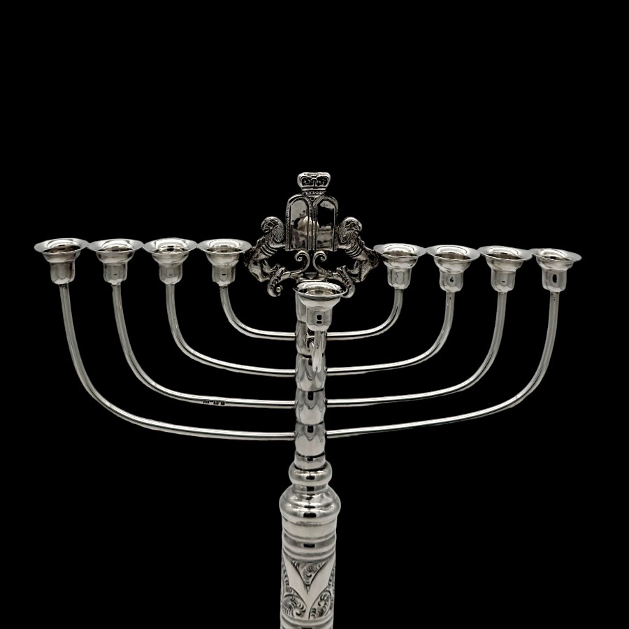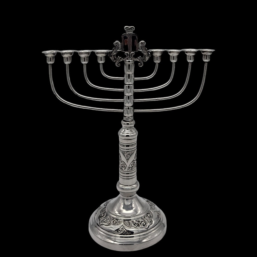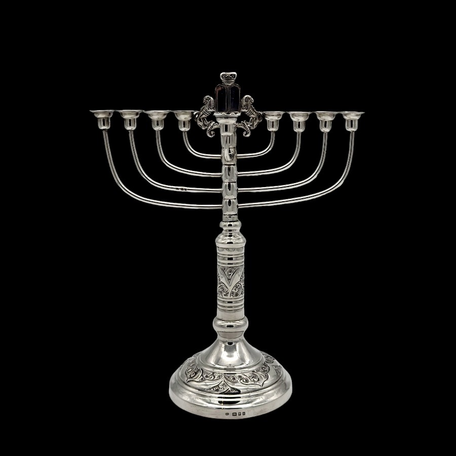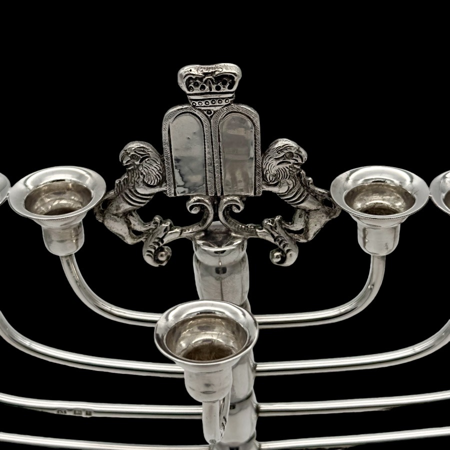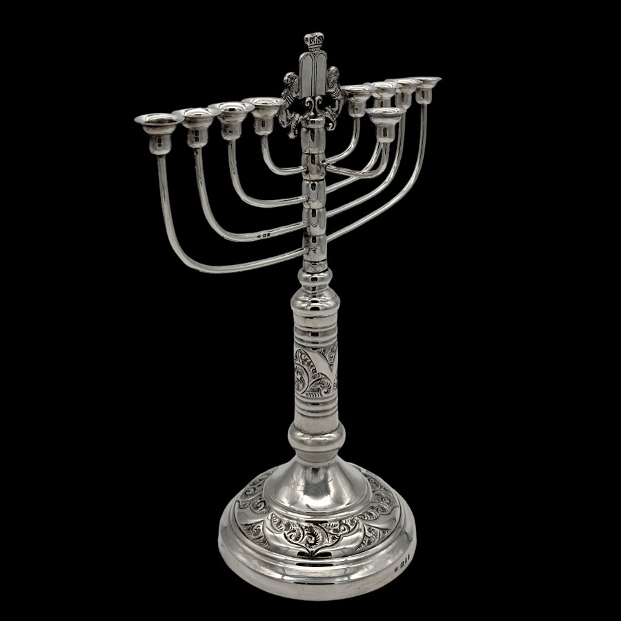 Stylish and incredibly unusual sterling silver Menorah decorated with elegant floral embossing and crowned with the blank Stone tablet that Moses brought down form mount Sinai.
