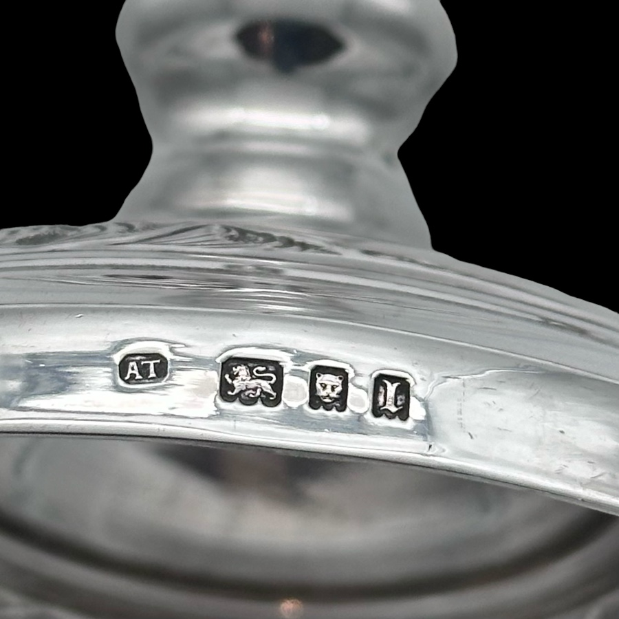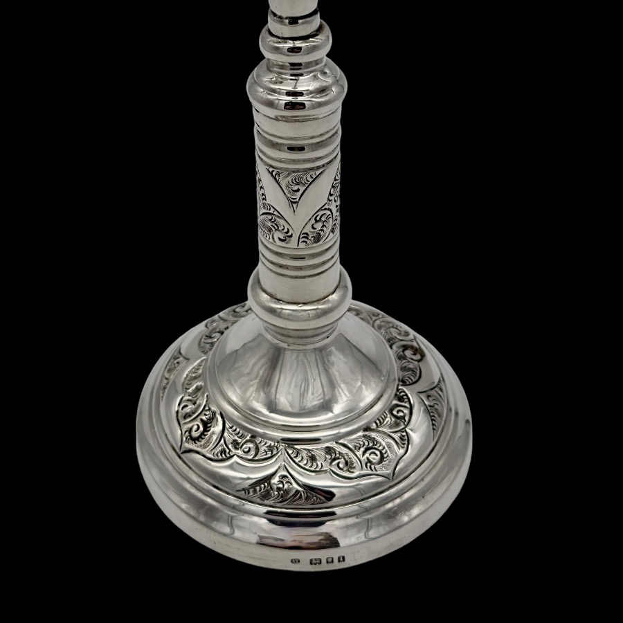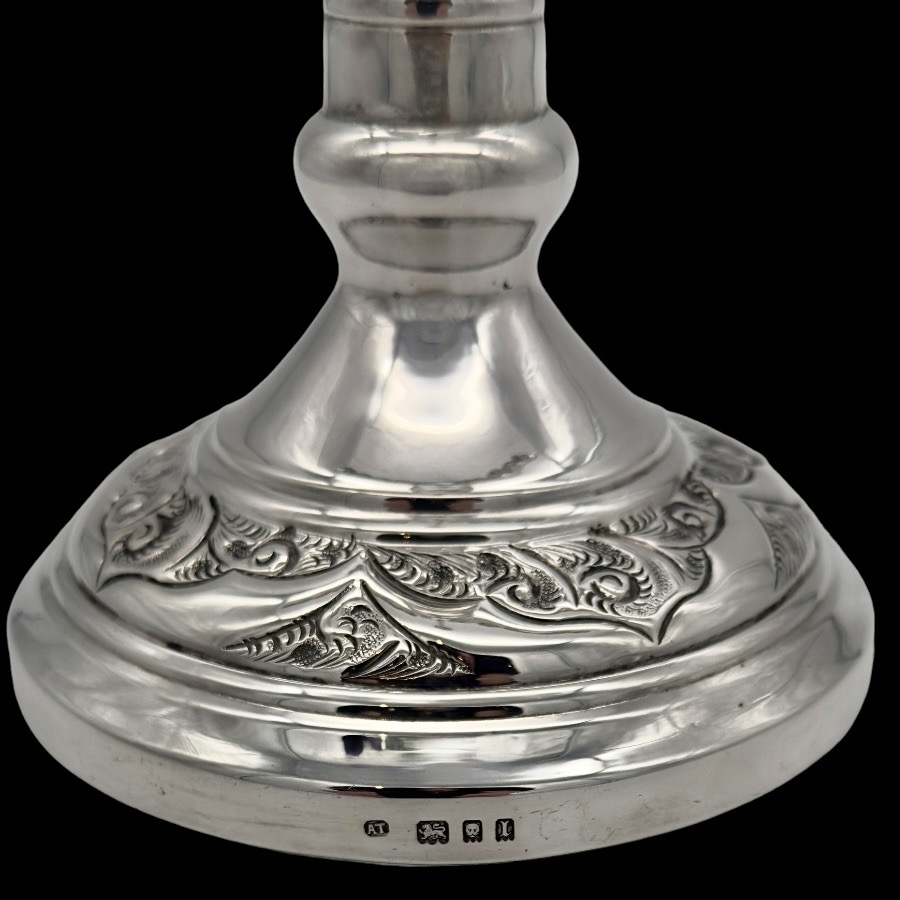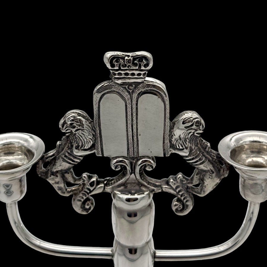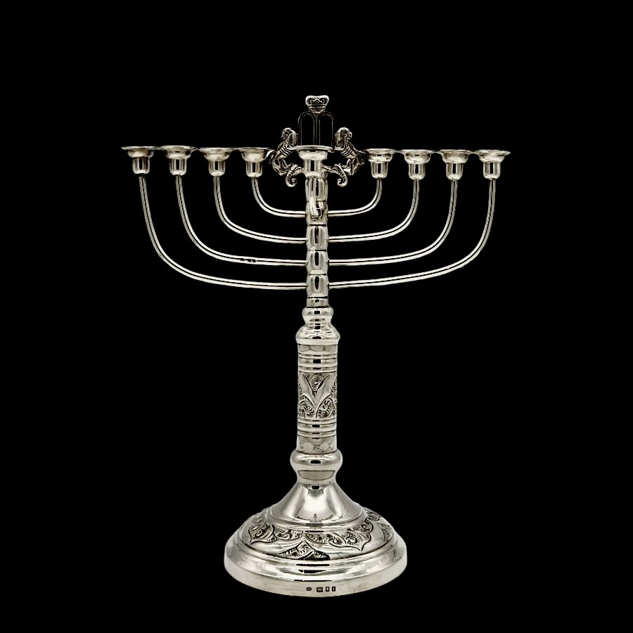 Stylish and incredibly unusual sterling silver Menorah decorated with elegant floral embossing and crowned with the blank Stone tablet that Moses brought down form mount Sinai.