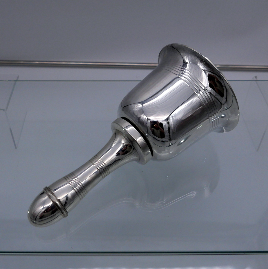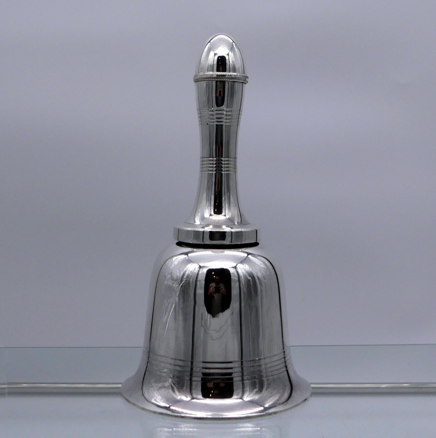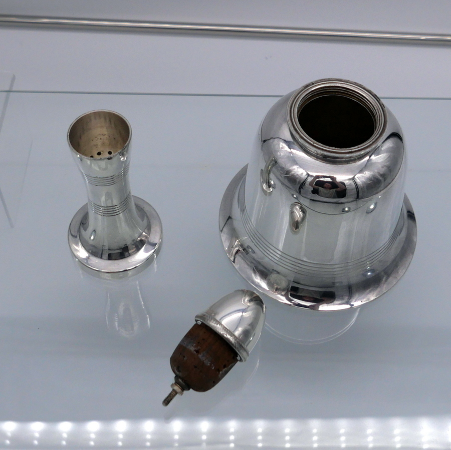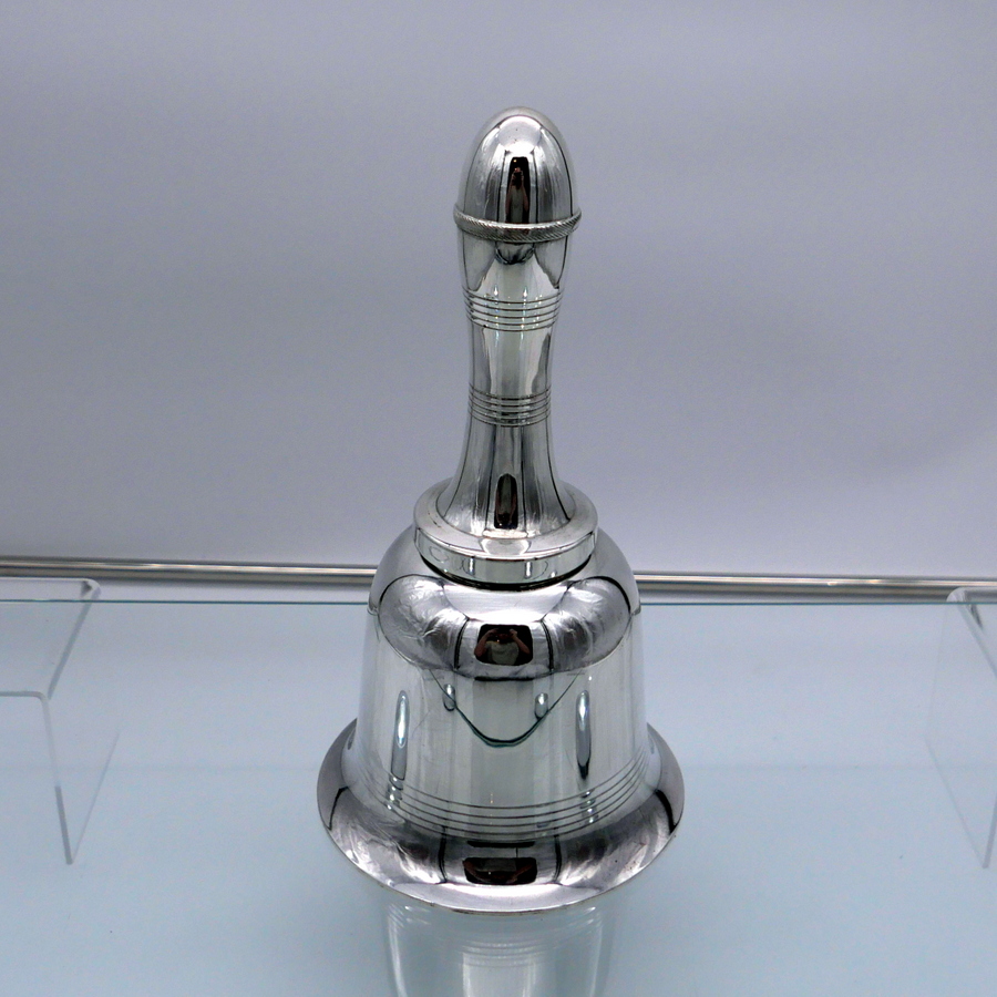 A highly desirable EPNS marked bell formed silverplated cocktail shaker decorated with stylish turnings alternating plain formed bands. Â The detachable fittings have screw formed actions.