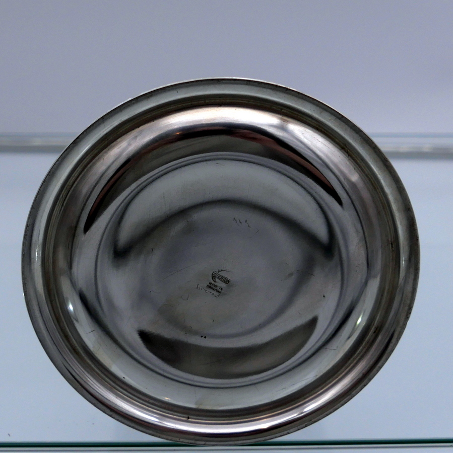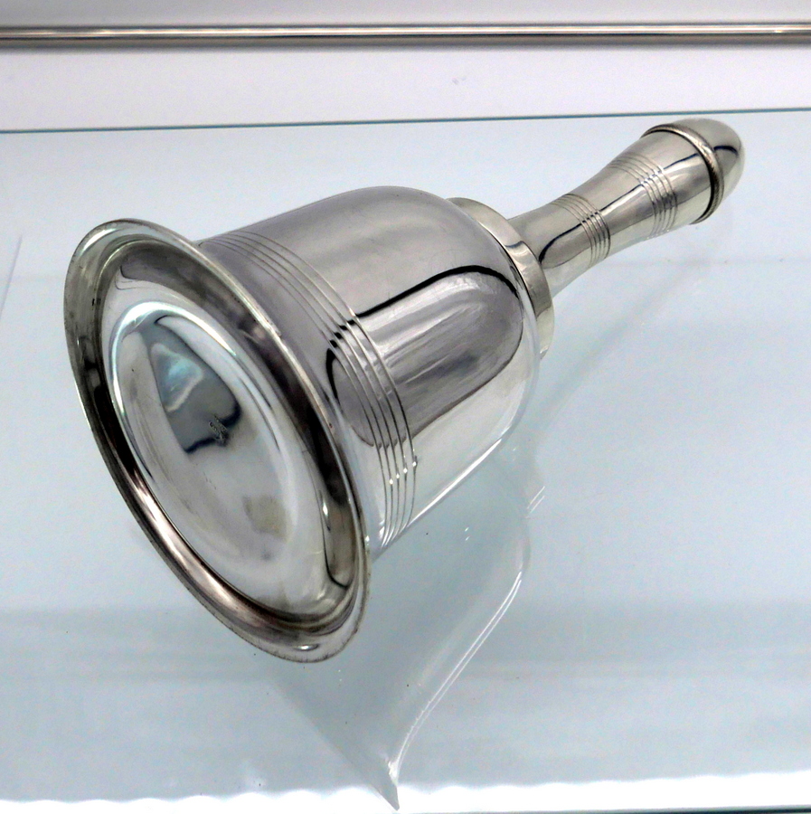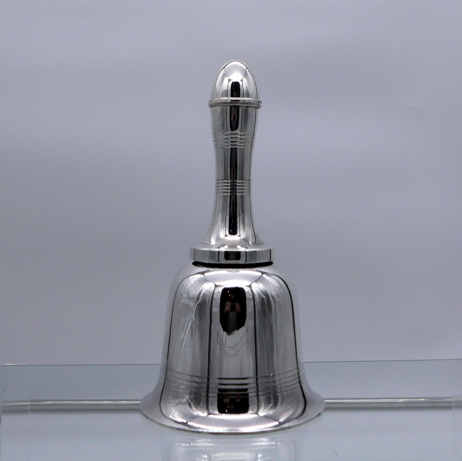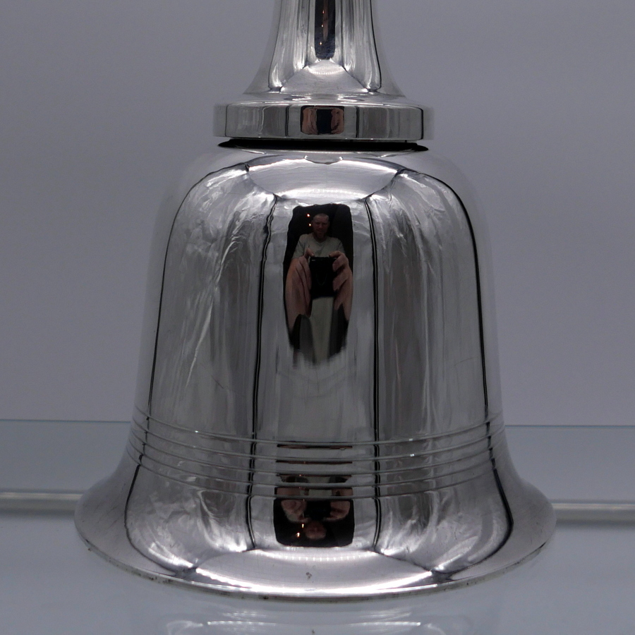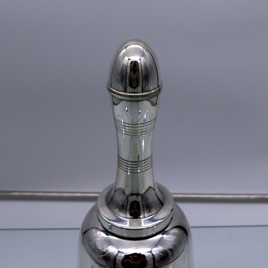 A highly desirable EPNS marked bell formed silverplated cocktail shaker decorated with stylish turnings alternating plain formed bands. Â The detachable fittings have screw formed actions.