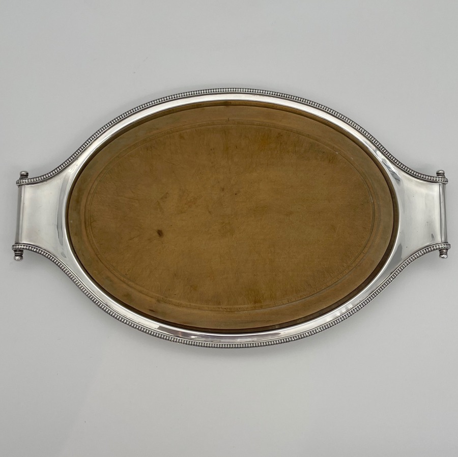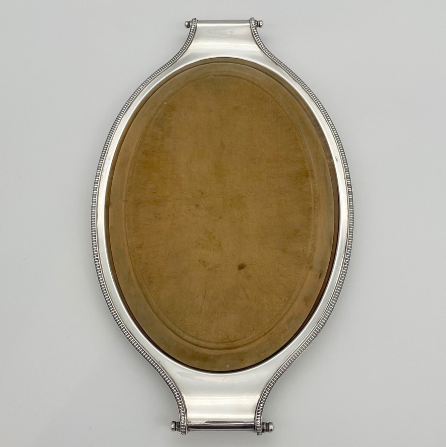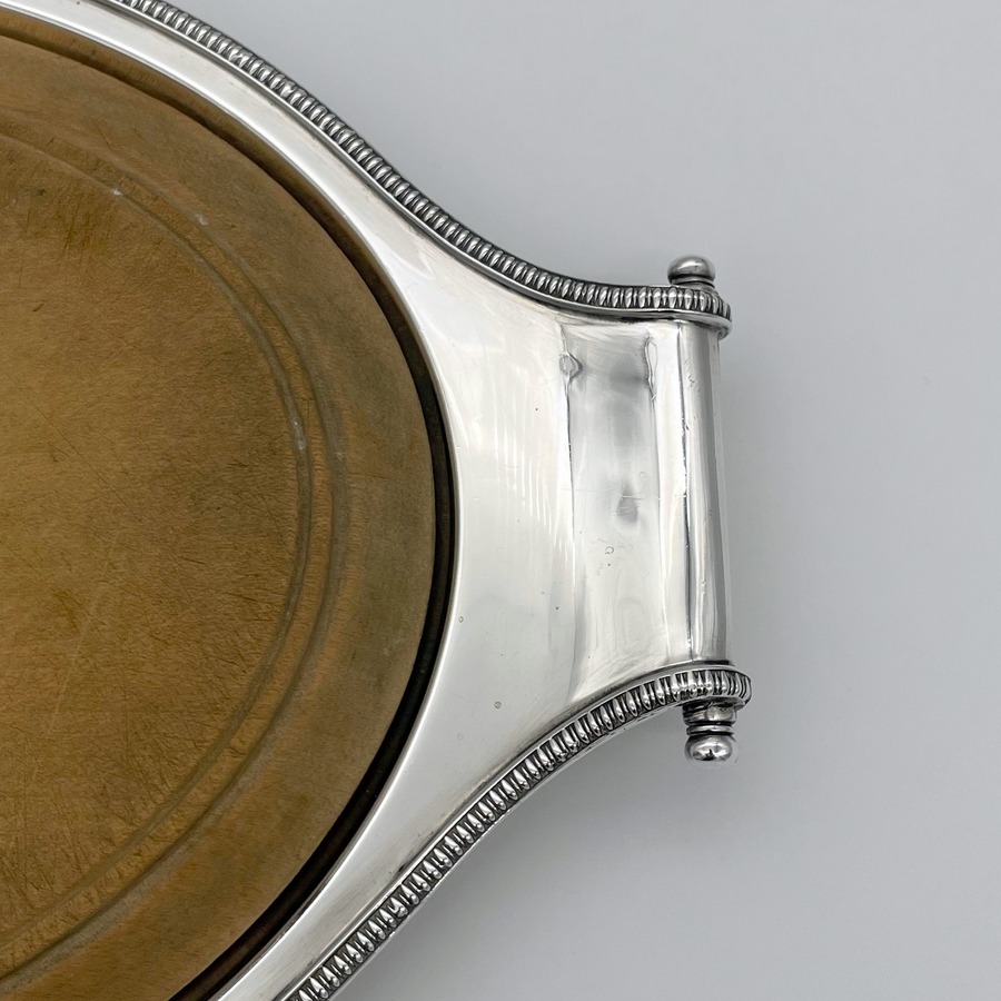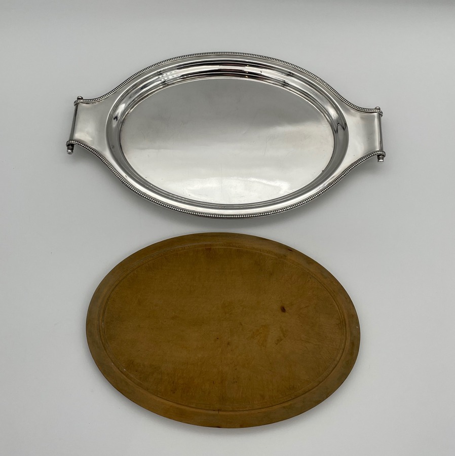 A very fine elongated sterling silver bread board decorated with an outer gadroon wire border and designed with fabulous scrolling handles.