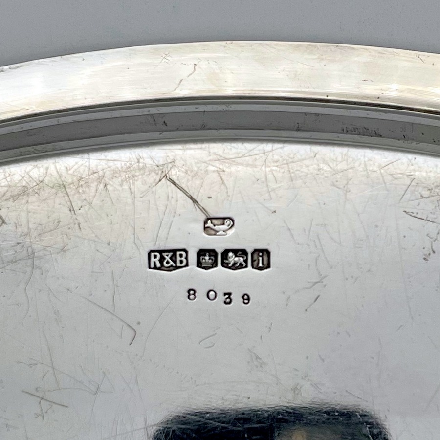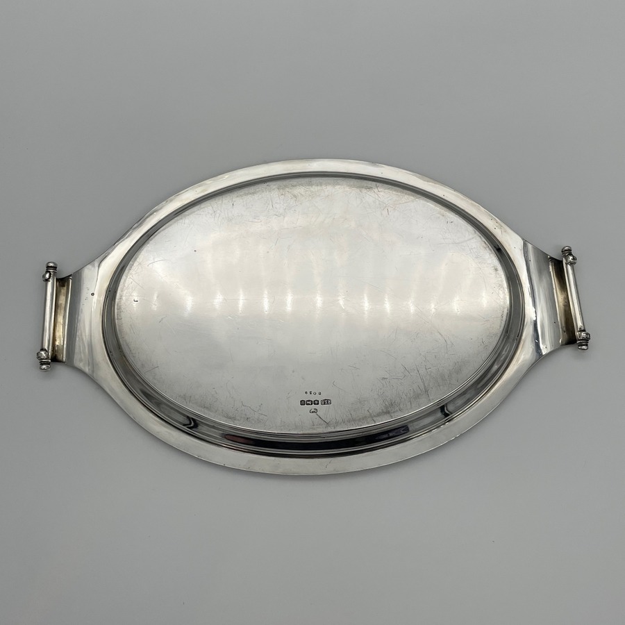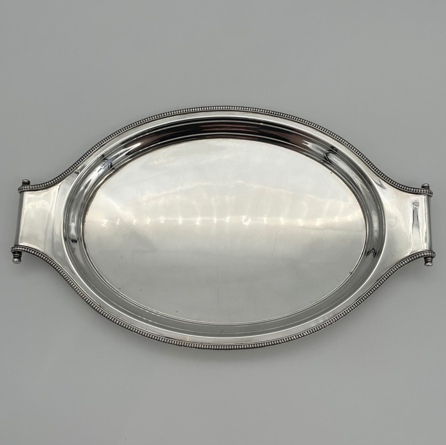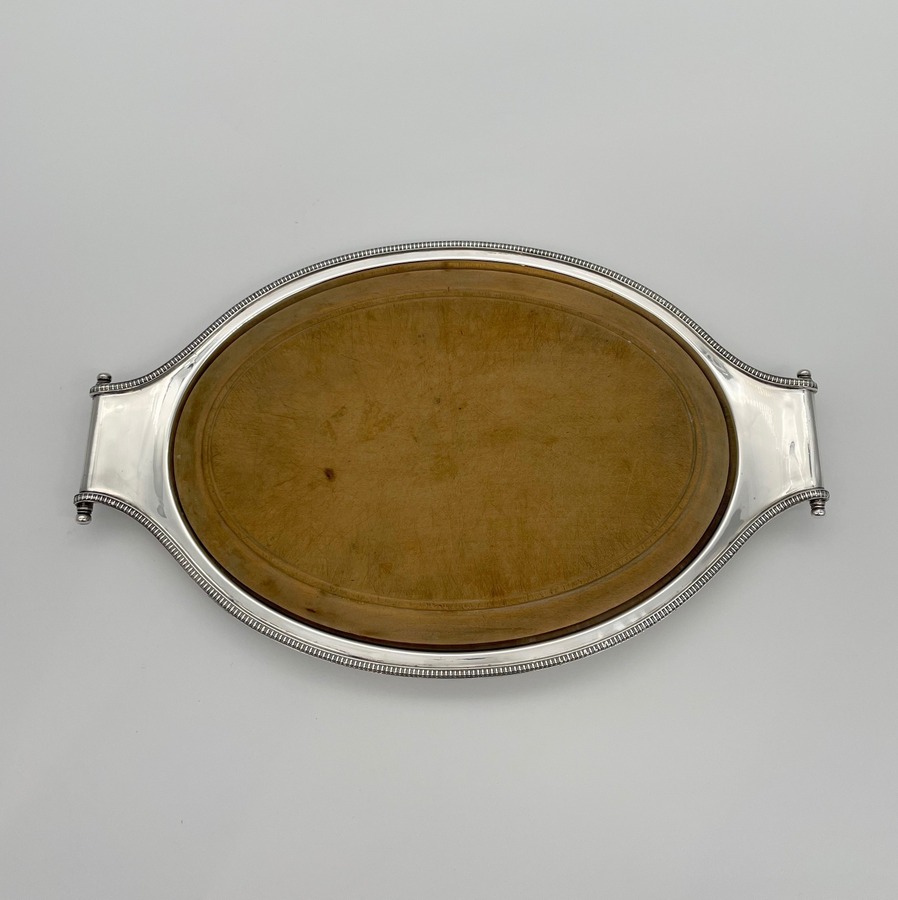 A very fine elongated sterling silver bread board decorated with an outer gadroon wire border and designed with fabulous scrolling handles.