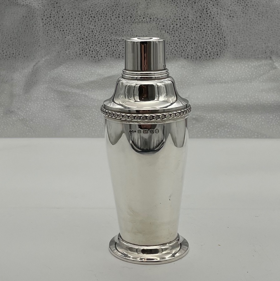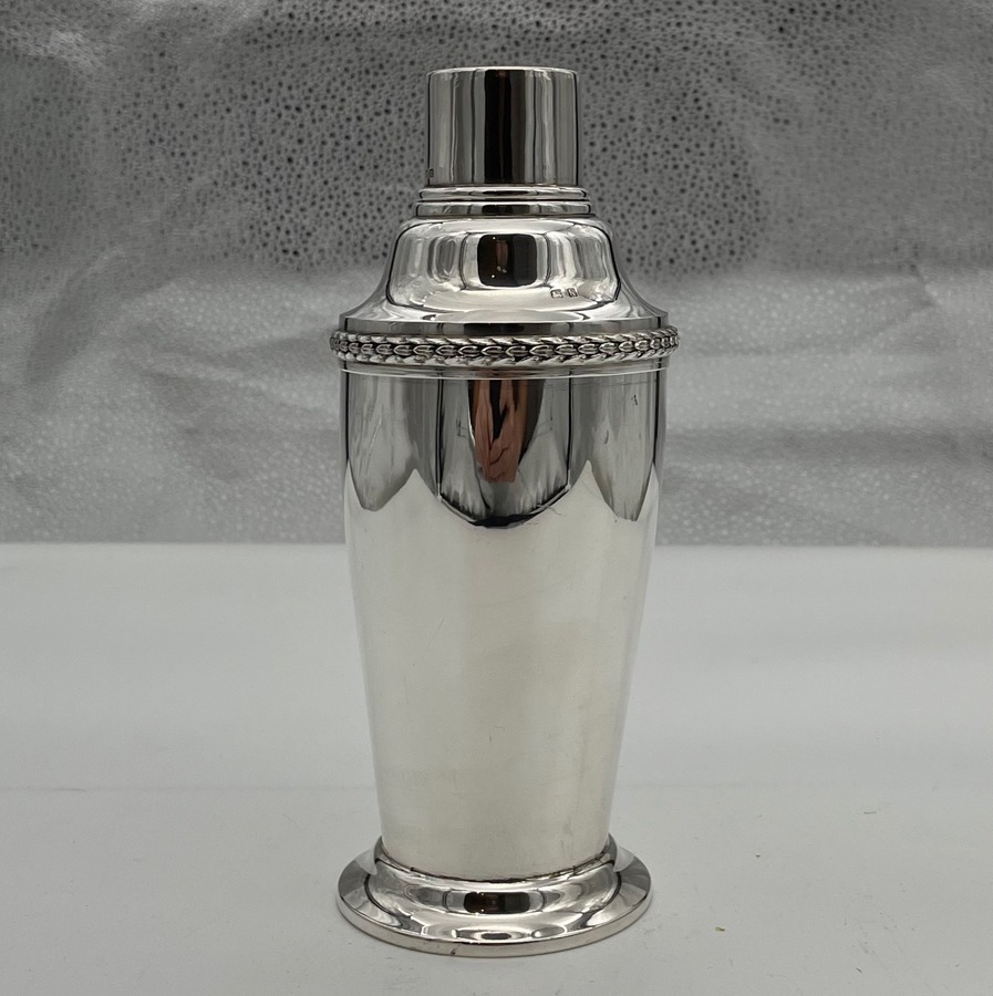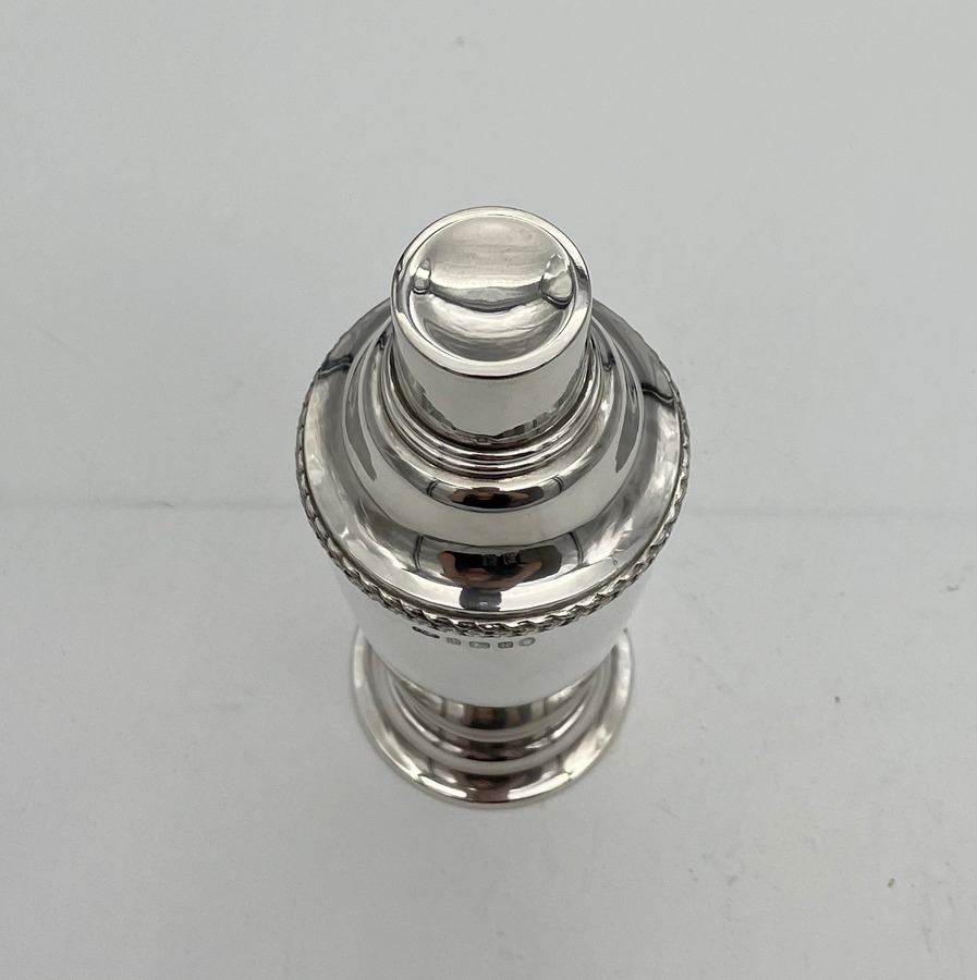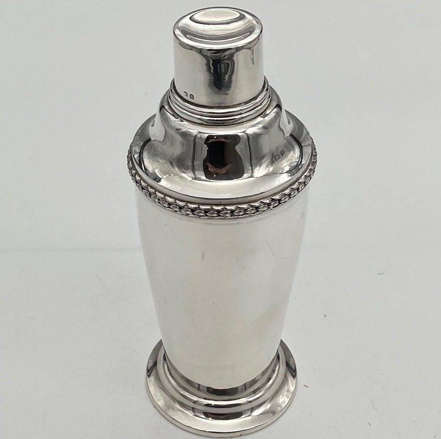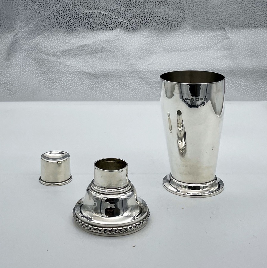 A highly collectable Art Deco period plain formed sterling silver cocktail shaker designed with a tapering bowl and decorated with a stylish contrasting cast border. Â The cocktail shaker separates into three sections.