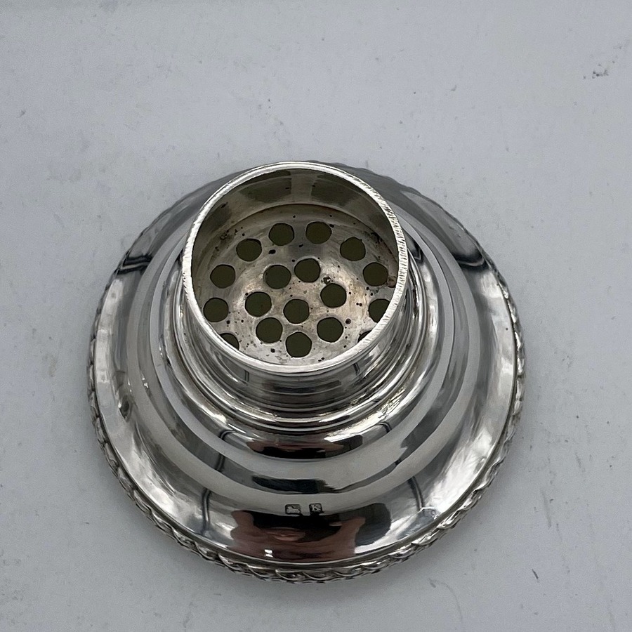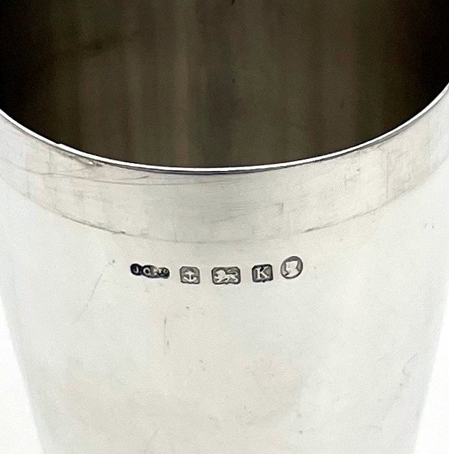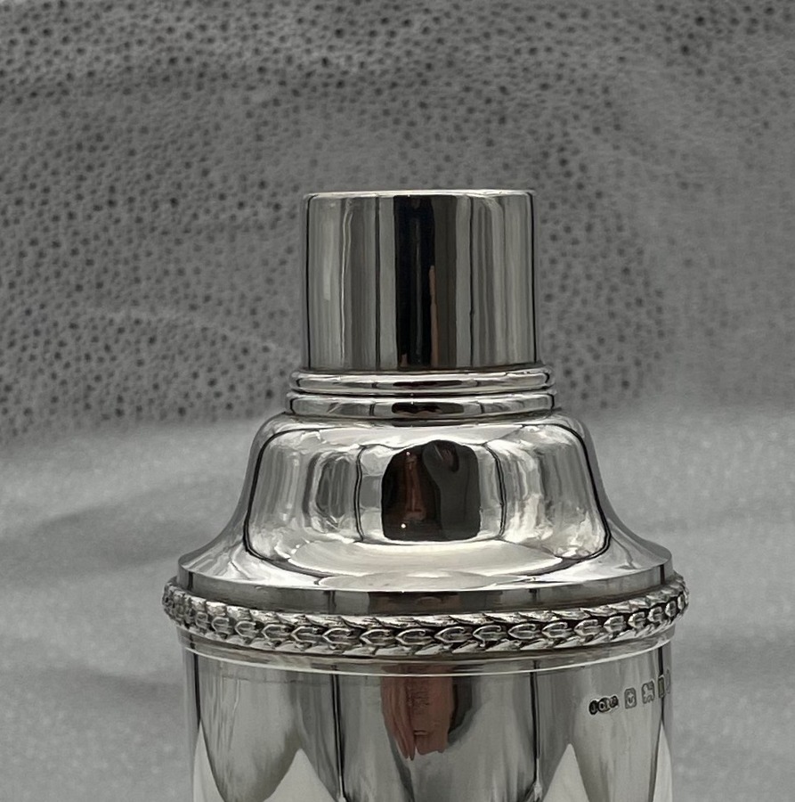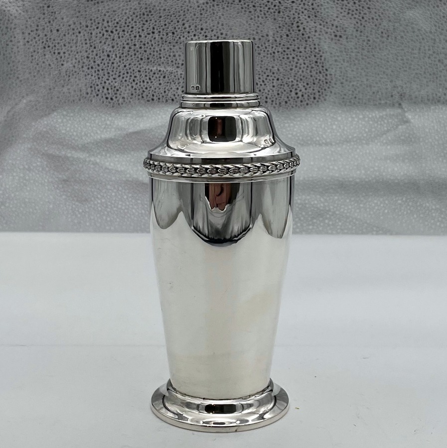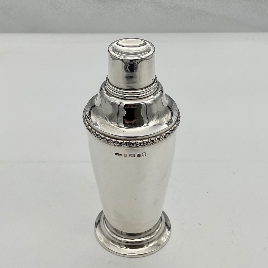 A highly collectable Art Deco period plain formed sterling silver cocktail shaker designed with a tapering bowl and decorated with a stylish contrasting cast border. Â The cocktail shaker separates into three sections.