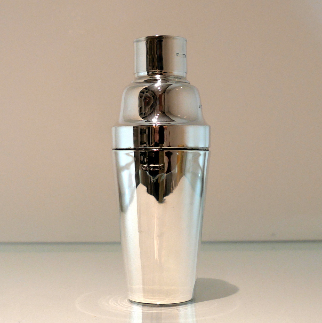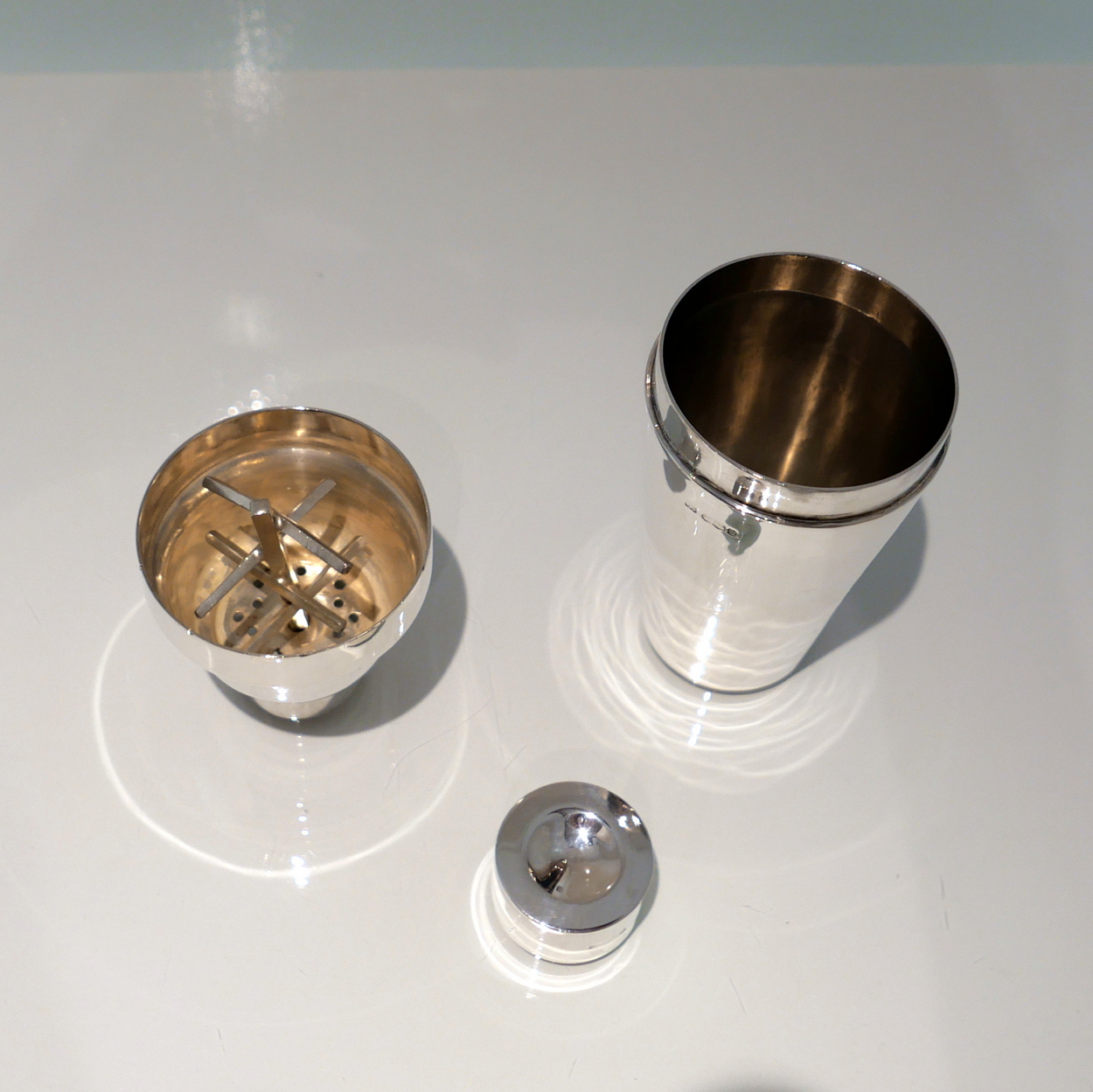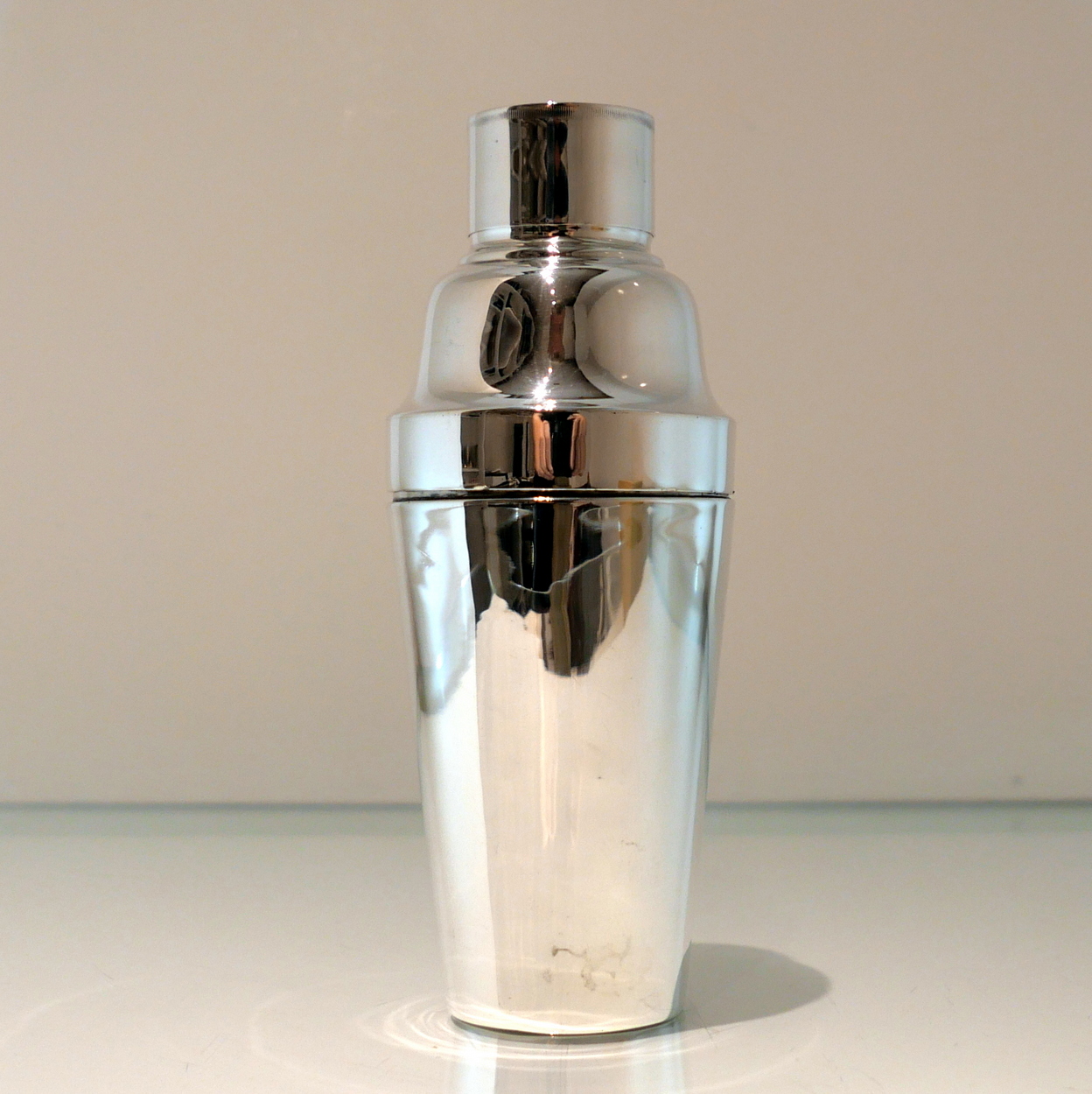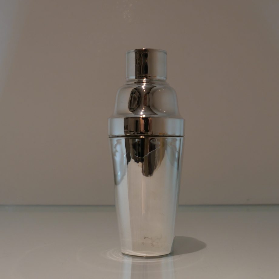 A stylish and highly desirable George V silver three sectioned plain formed cocktail shaker. Â There is a very unusual silver wire strainer insert in order for easy pouring.
