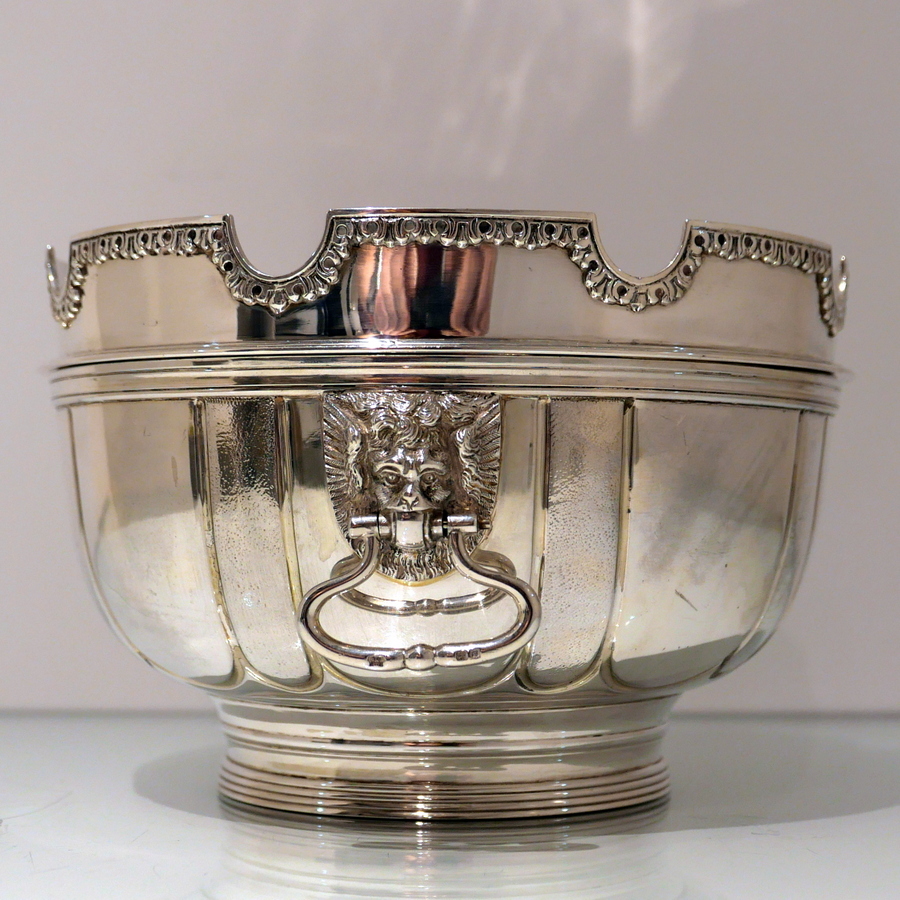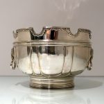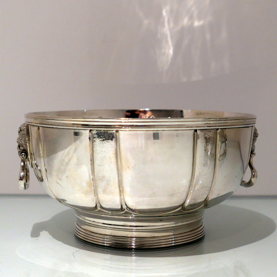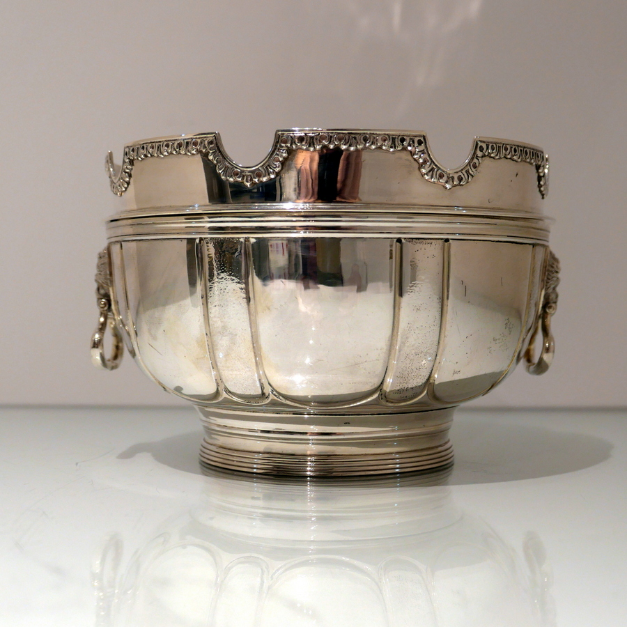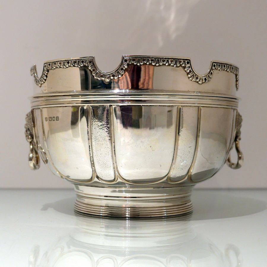 A fine and incredibly good quality early 20th century sterling silver Monteith bowl designed with drop hinged lion mask handles and elegant plain form alternating hammered panels. Â The notched detachable rim has an elegant applied foliate border.