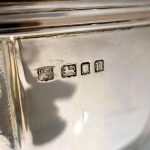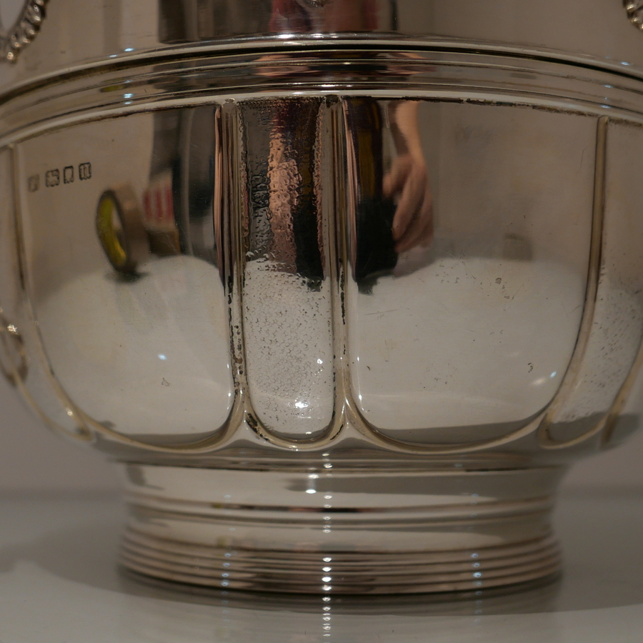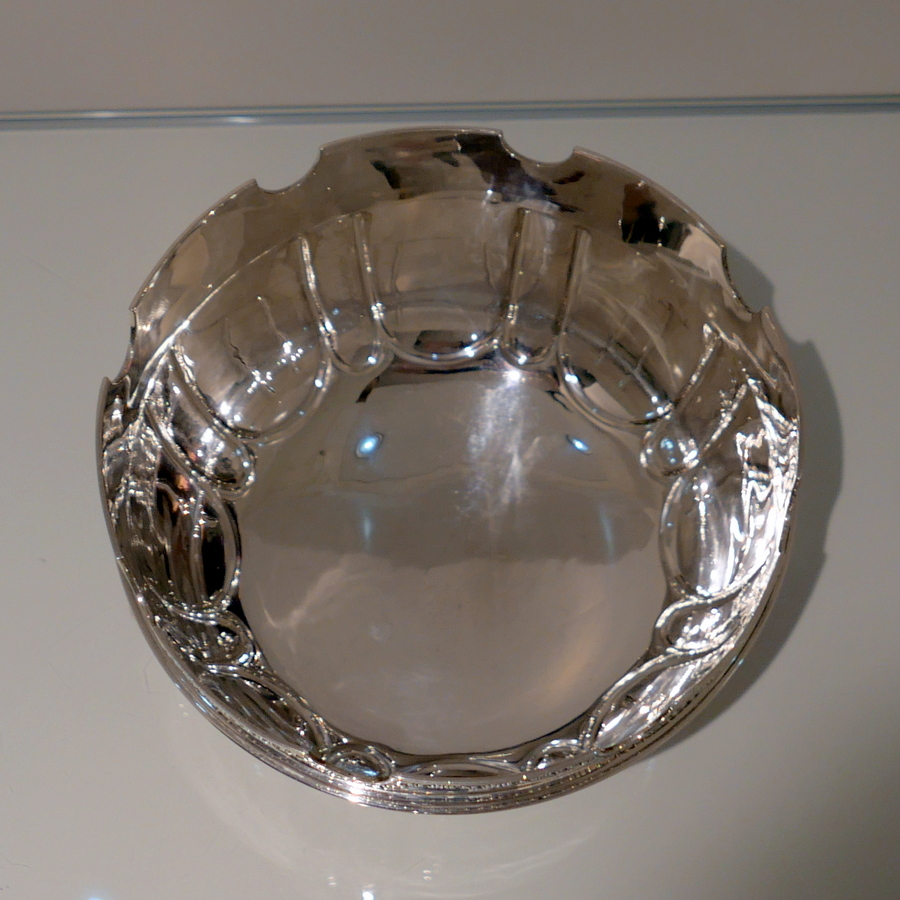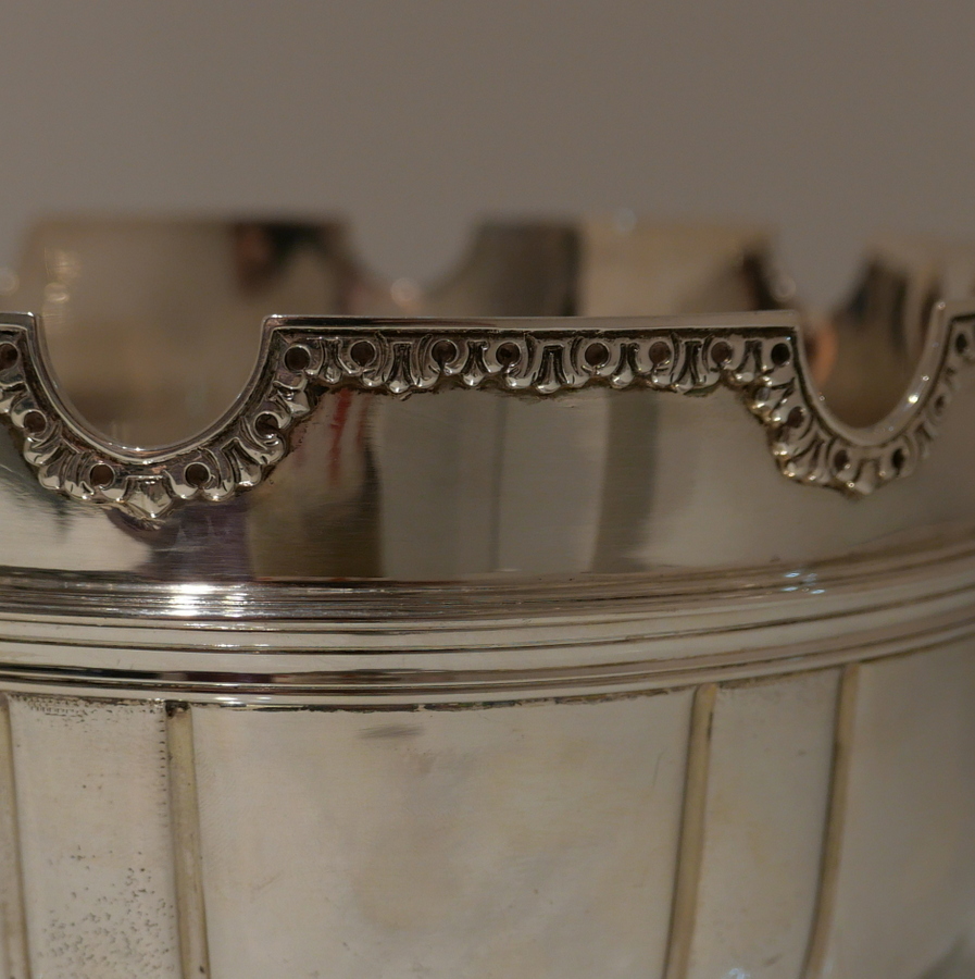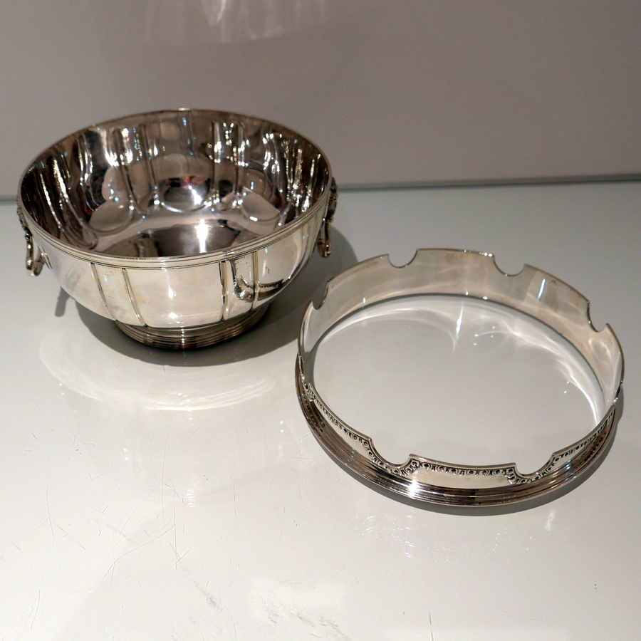 A fine and incredibly good quality early 20th century sterling silver Monteith bowl designed with drop hinged lion mask handles and elegant plain form alternating hammered panels. Â The notched detachable rim has an elegant applied foliate border.