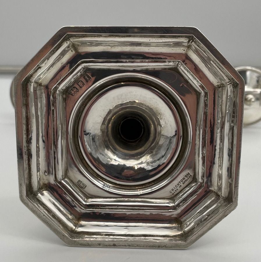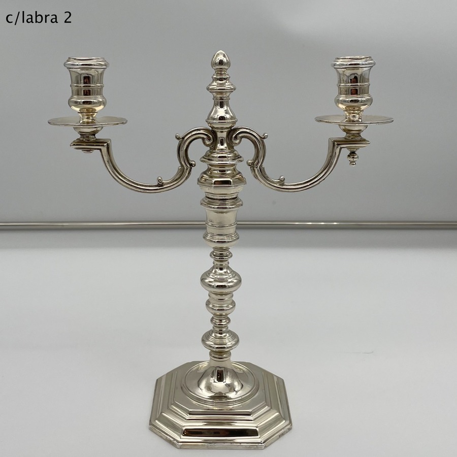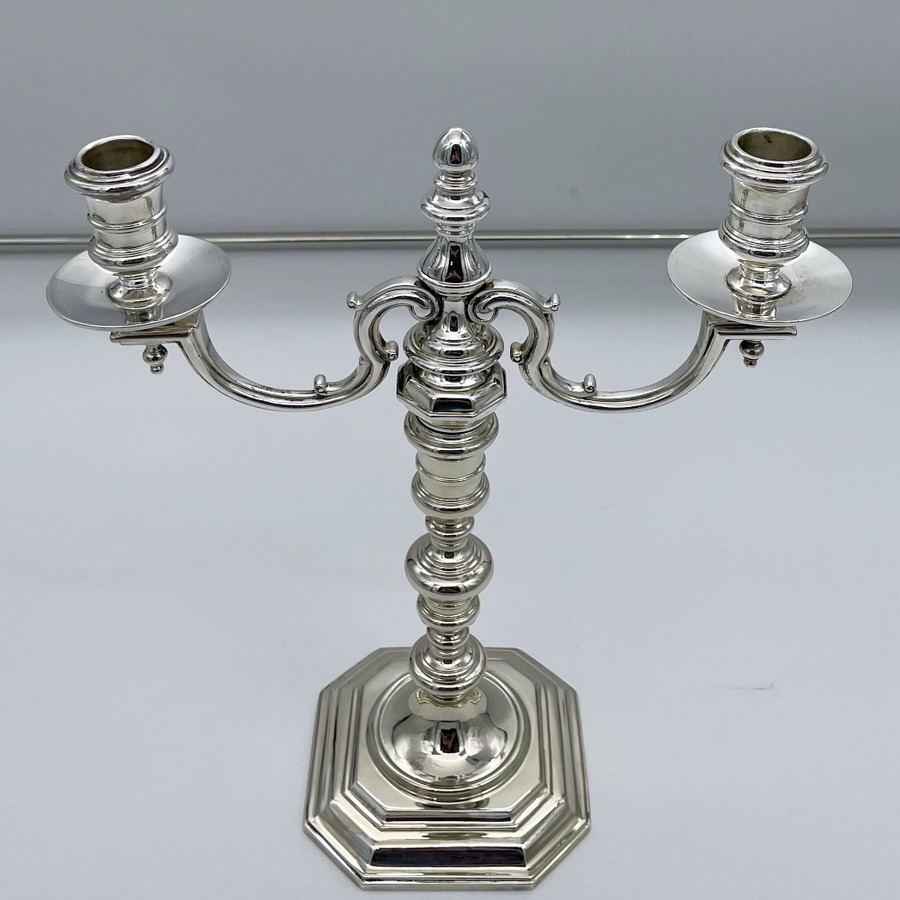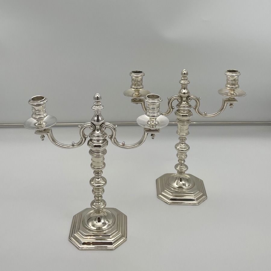 A fabulous pair of sterling silver candelabra designed with elegant square cut cornered candlesticks with sunken in wells and beautiful detachable scrolling branches with stylish strapwork decorated capitials (candle holders).