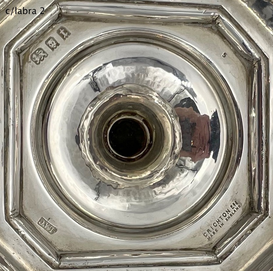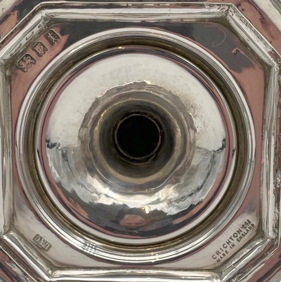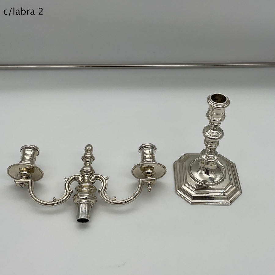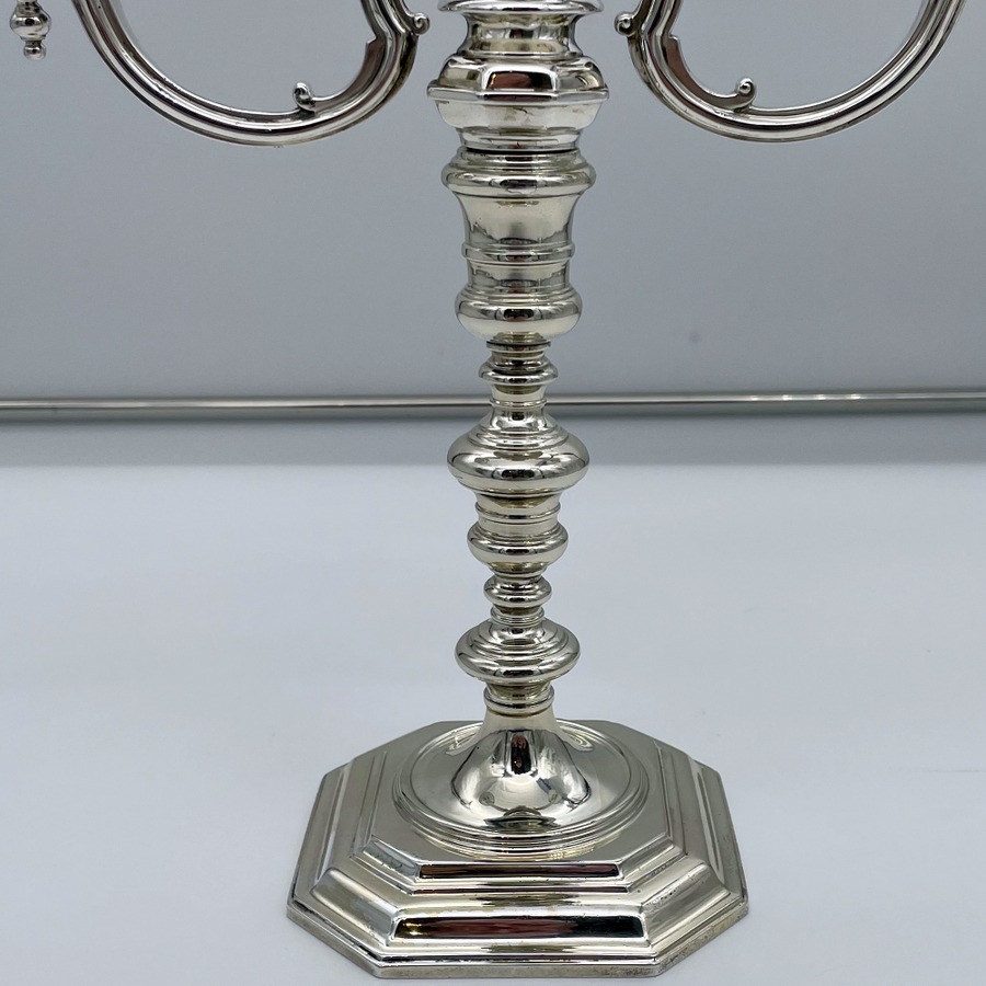 A fabulous pair of sterling silver candelabra designed with elegant square cut cornered candlesticks with sunken in wells and beautiful detachable scrolling branches with stylish strapwork decorated capitials (candle holders).