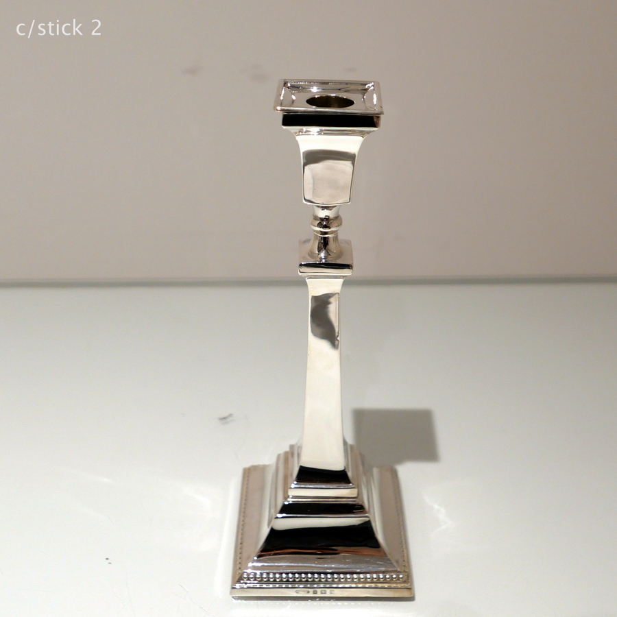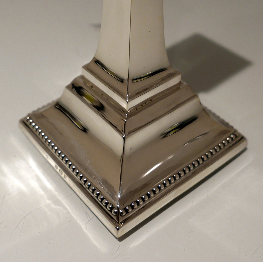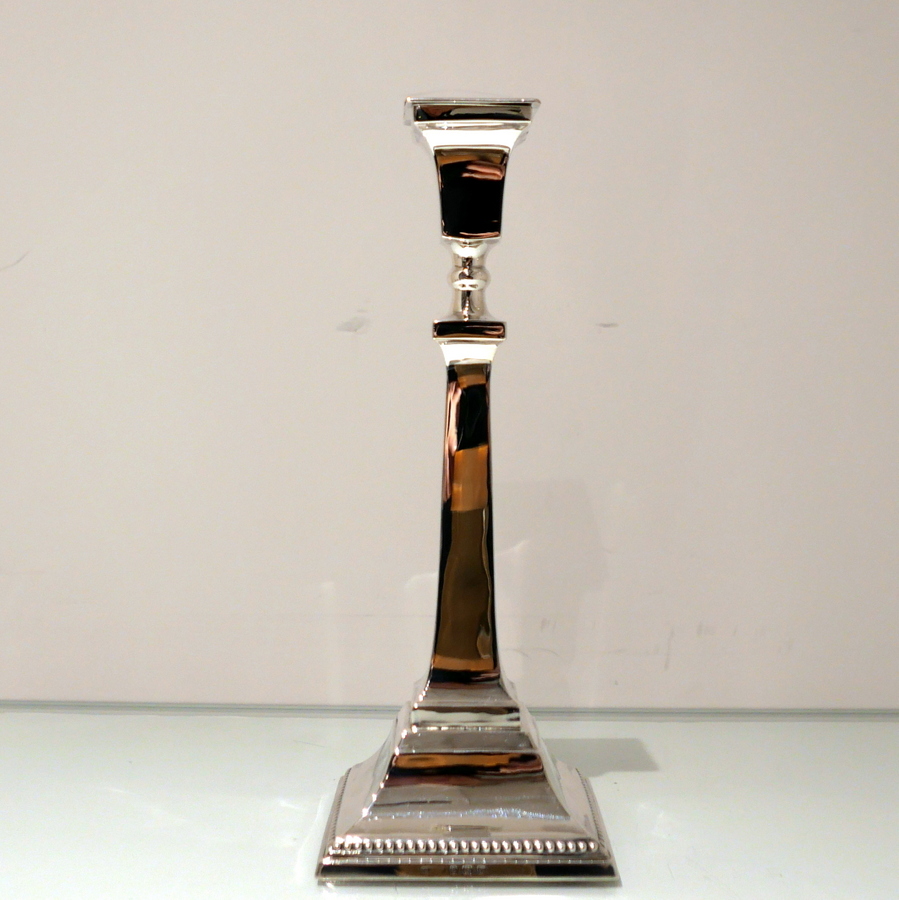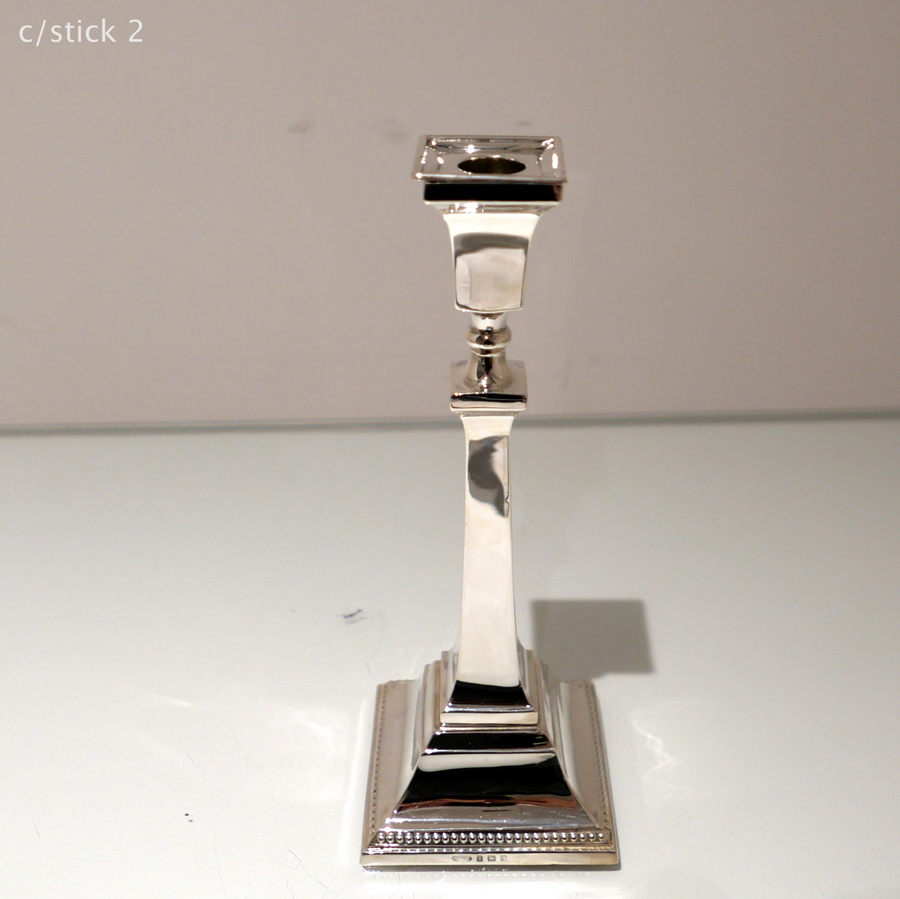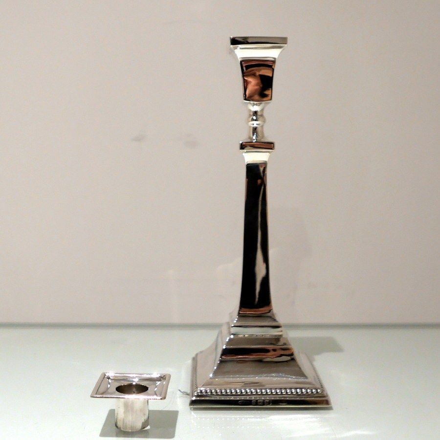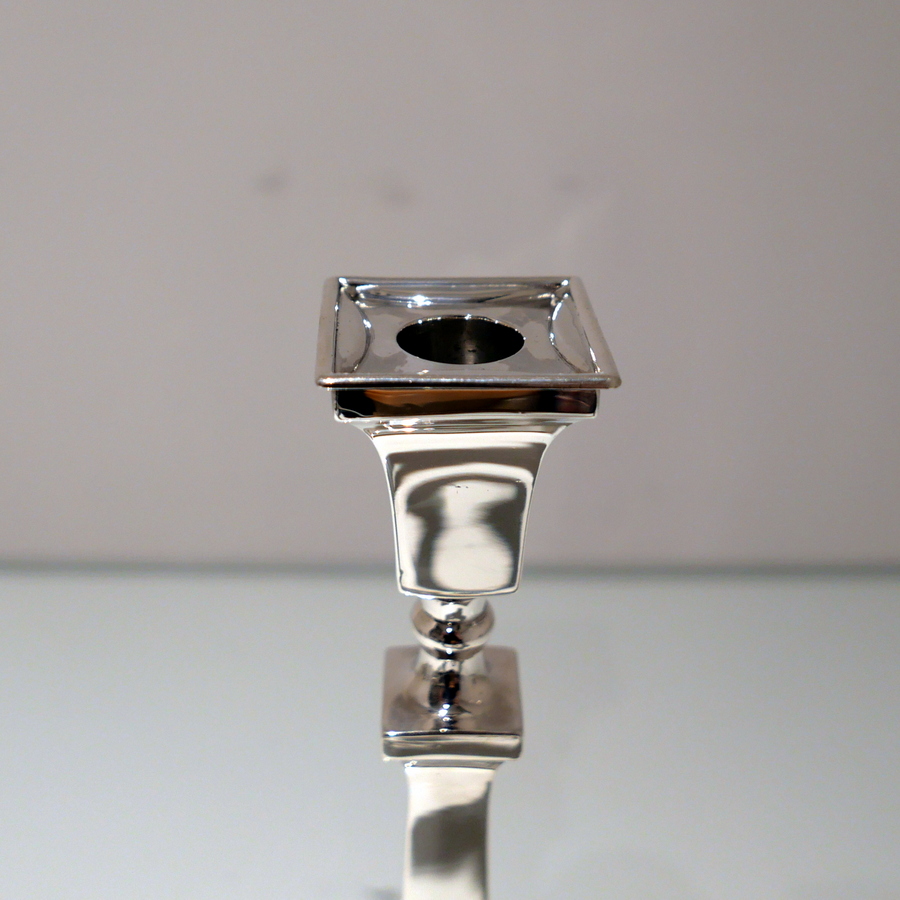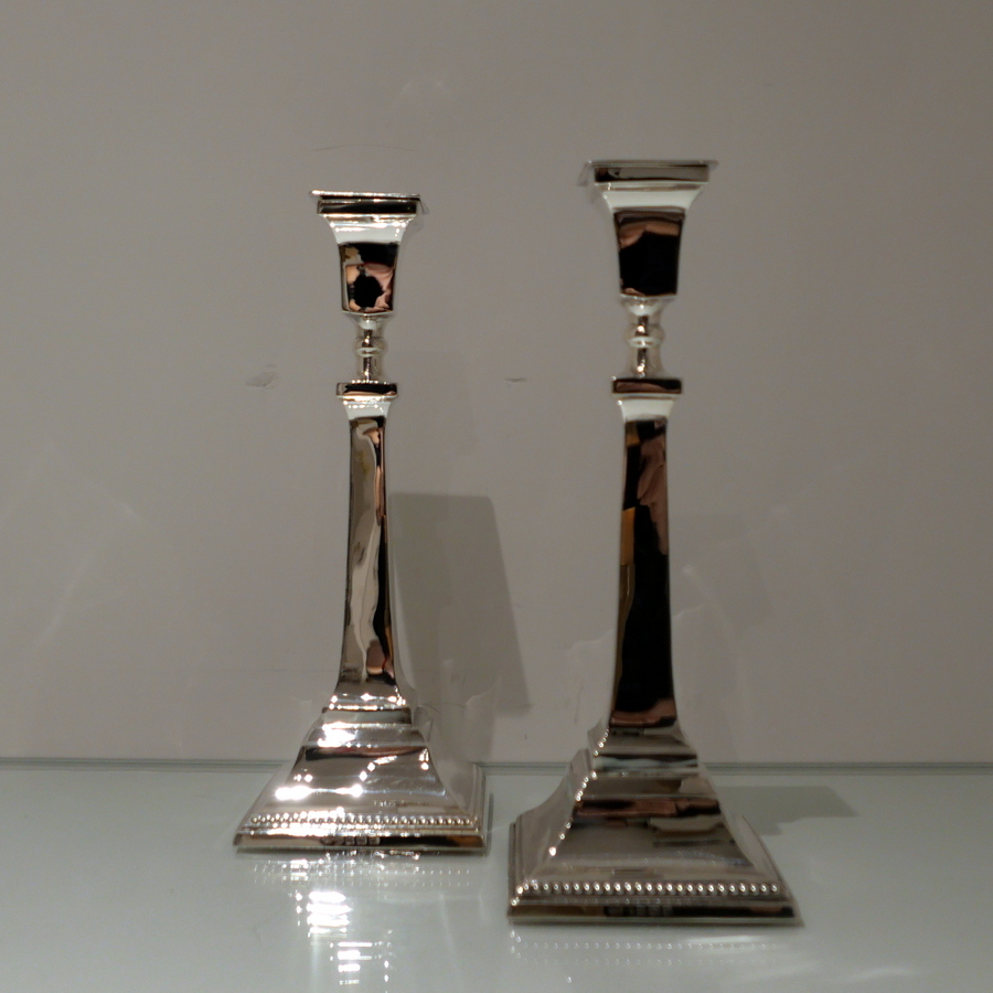 A highly desirable pair of early 20th century sheet silver sabbath candlesticks designed with elegant tapering stems and a delightful gadroon decorated square base.