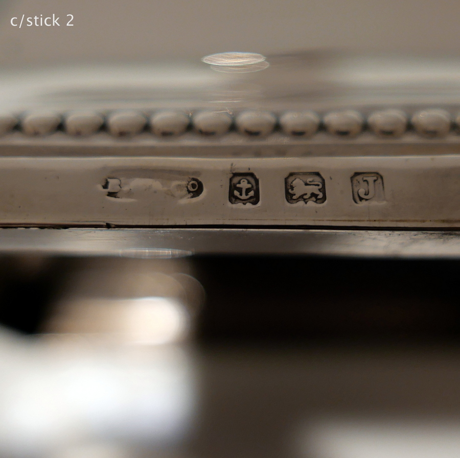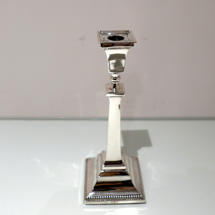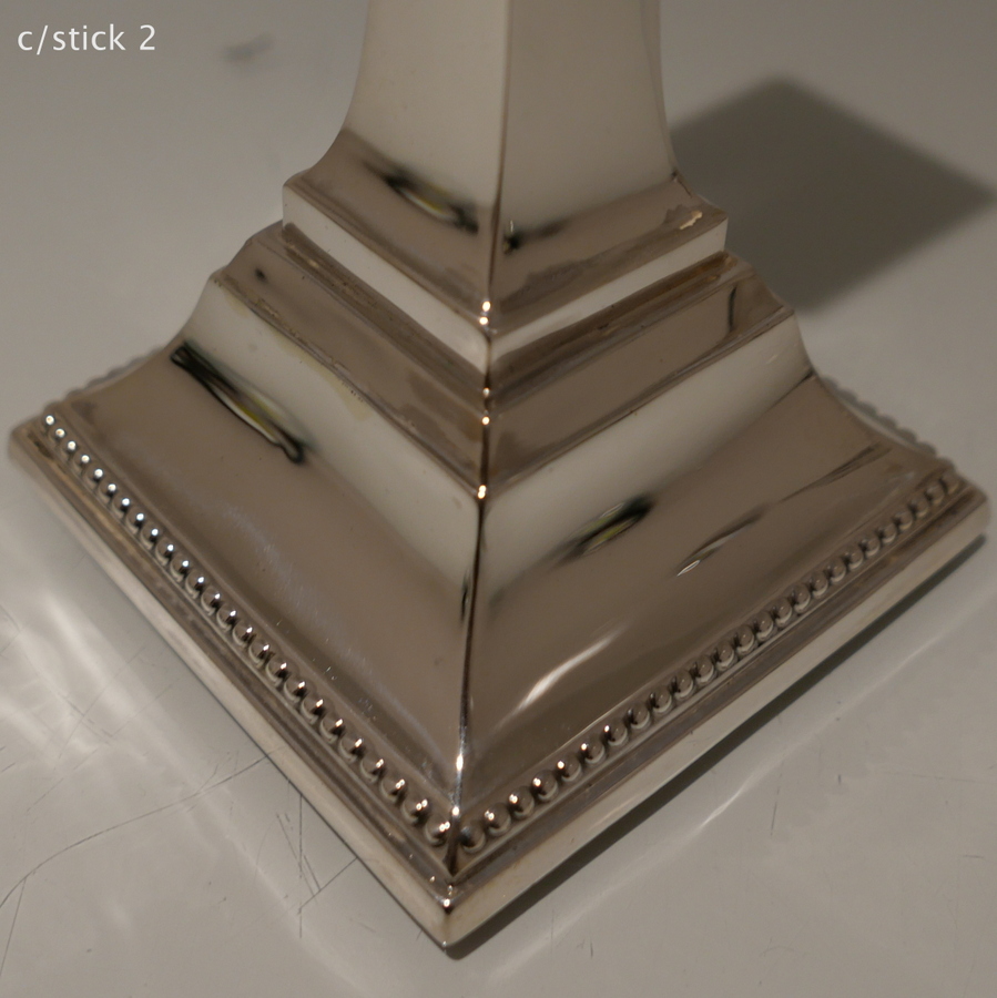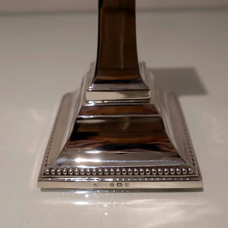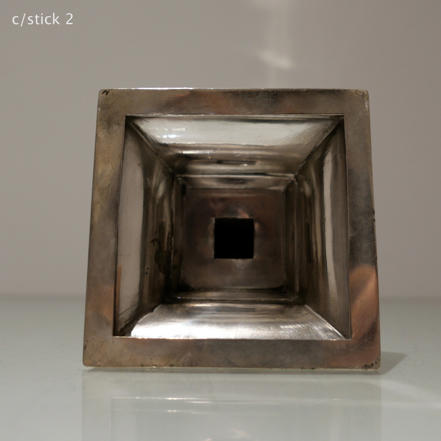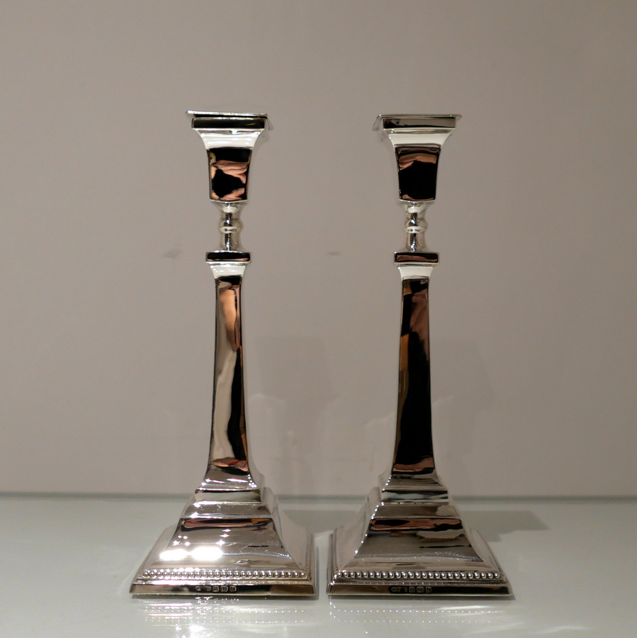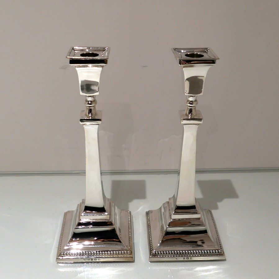 A highly desirable pair of early 20th century sheet silver sabbath candlesticks designed with elegant tapering stems and a delightful gadroon decorated square base.