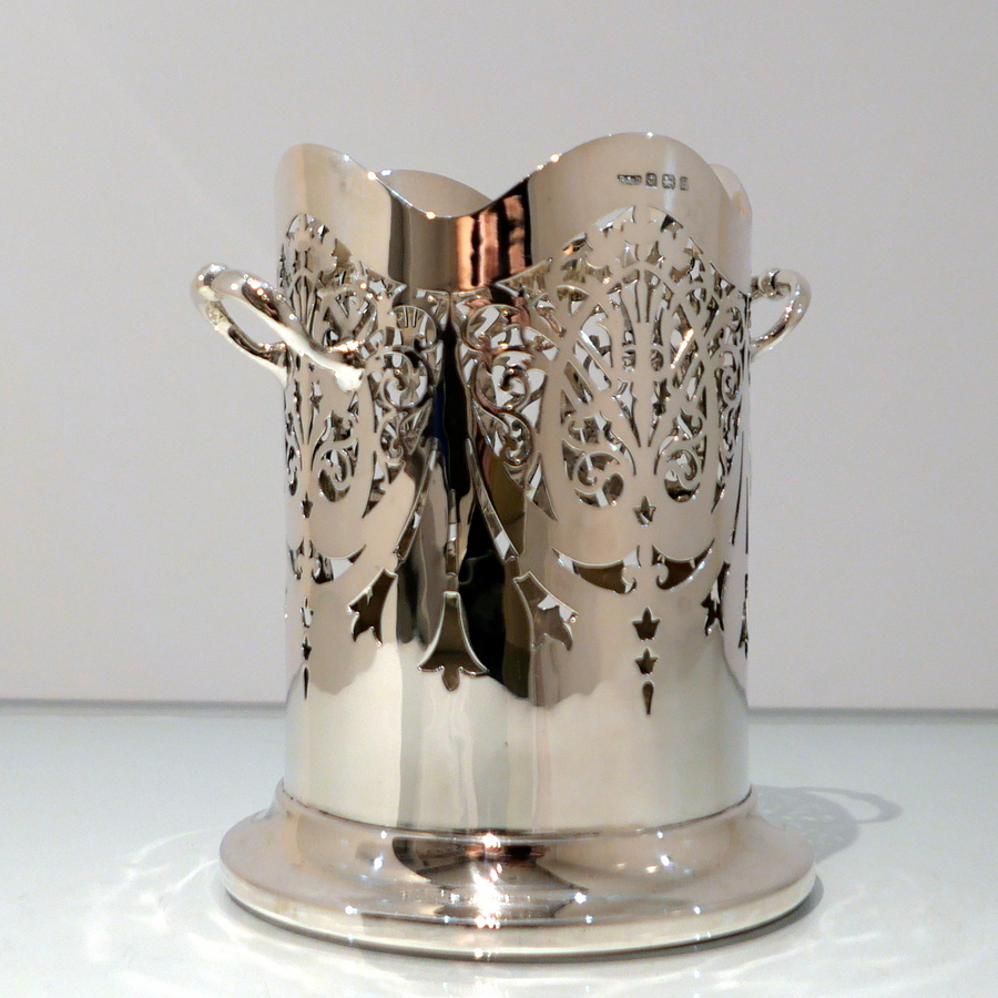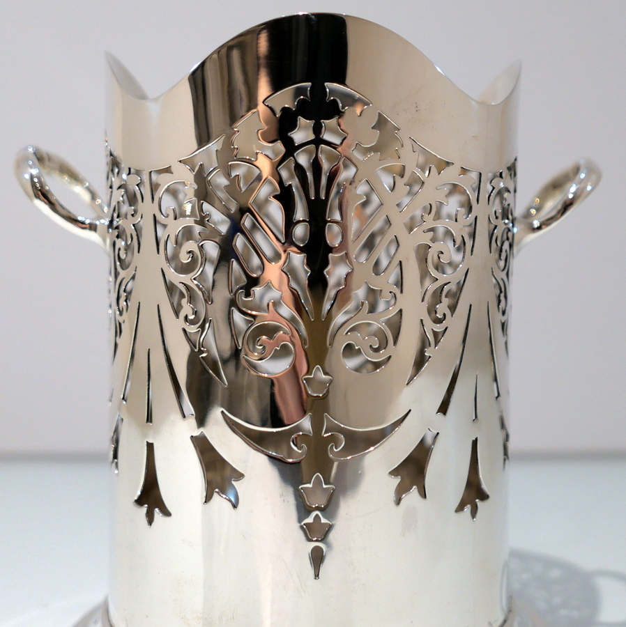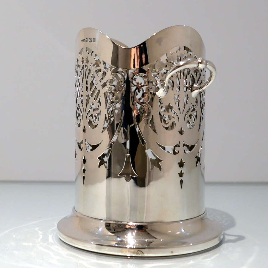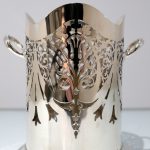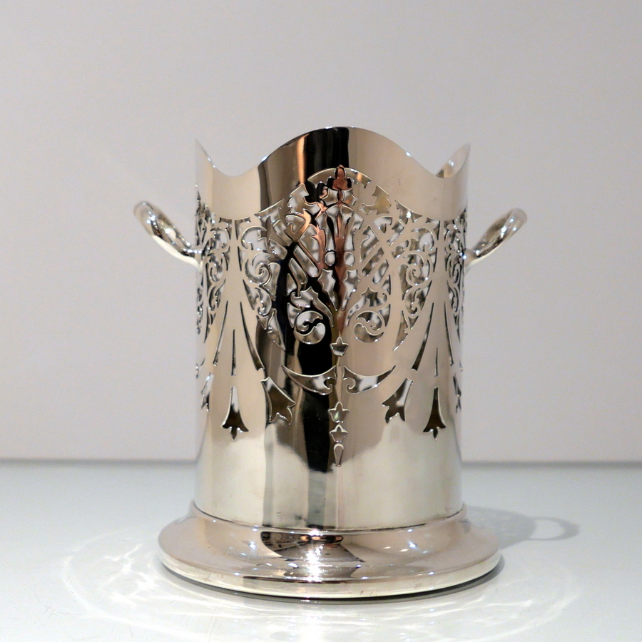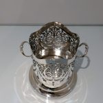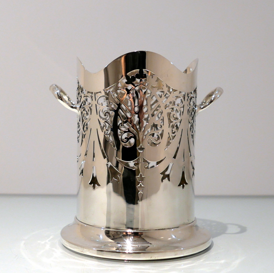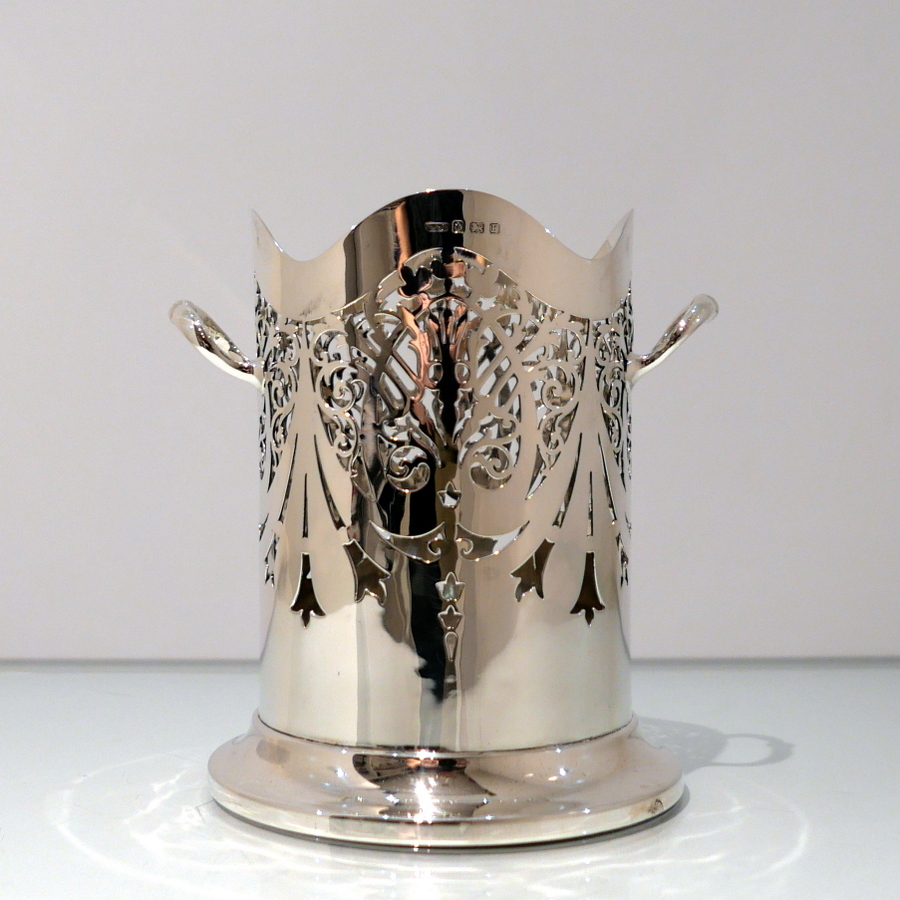 A beautiful silver cylindrical ‘wavy’ edged siphon stand decorated with elegant hand piercing designs and two applied cast wire handles.