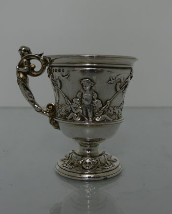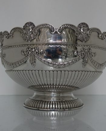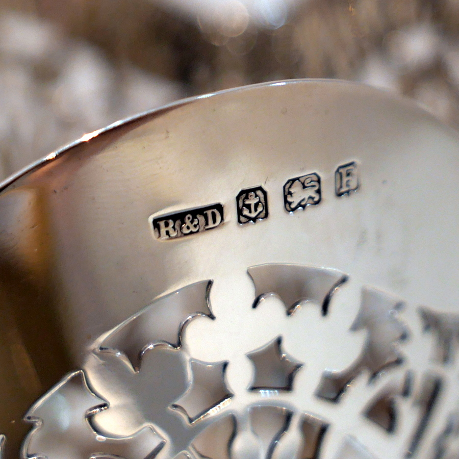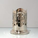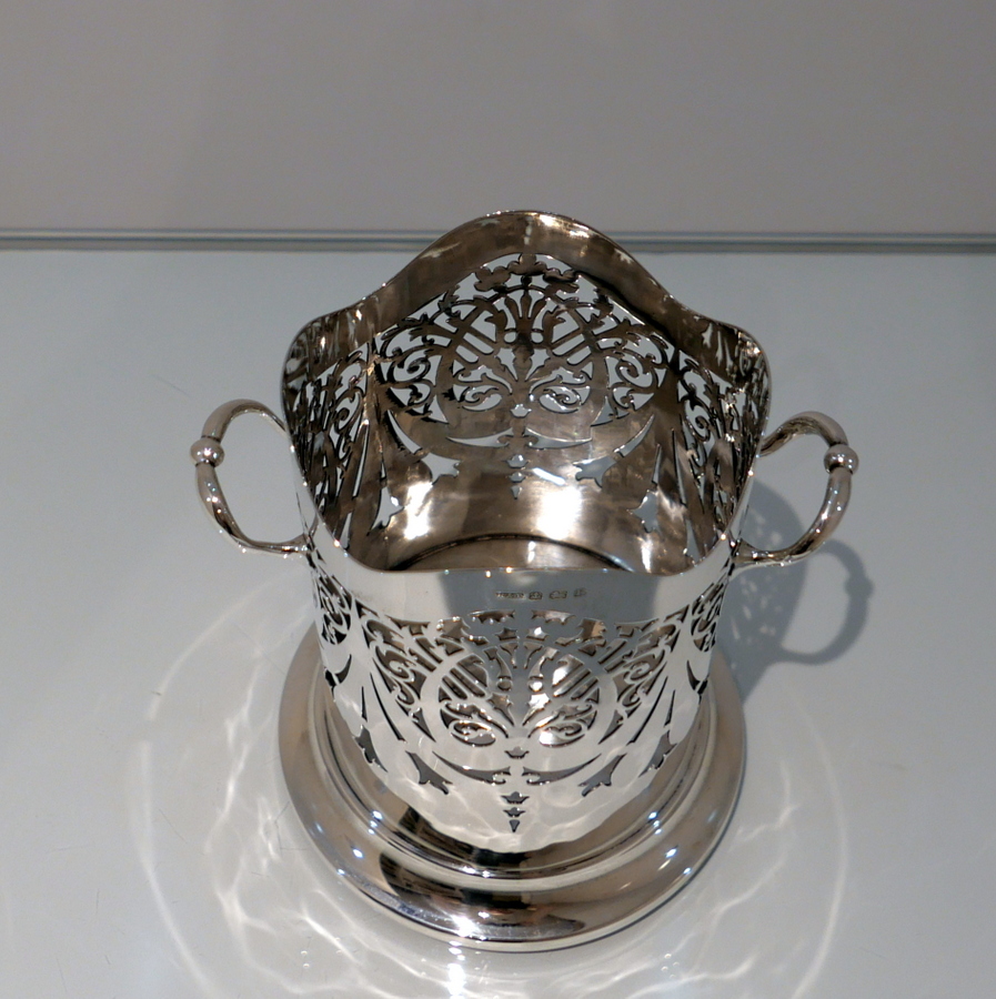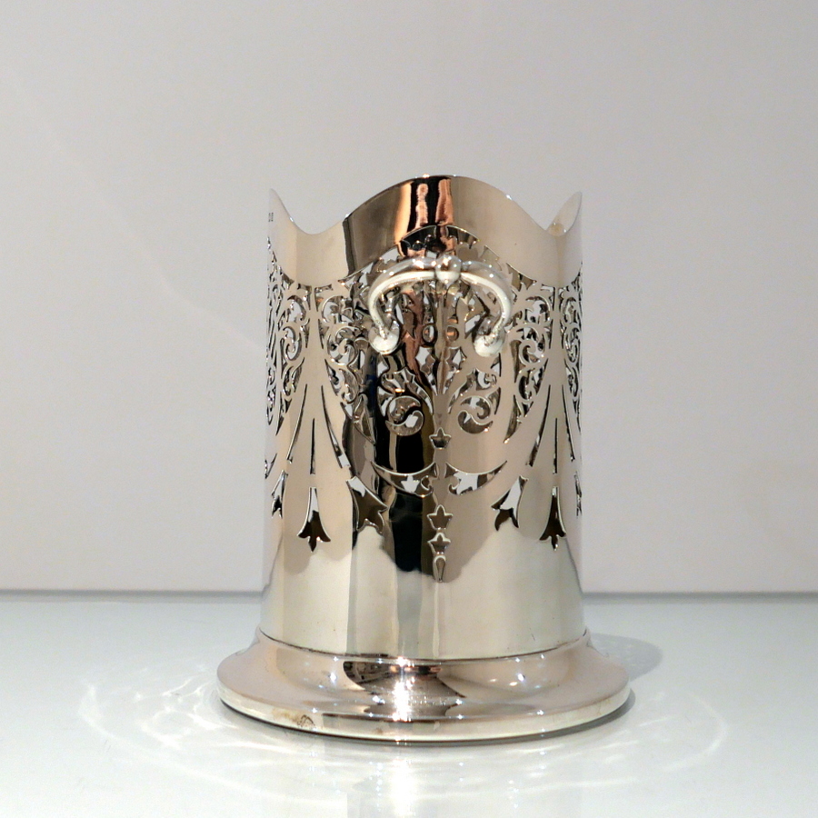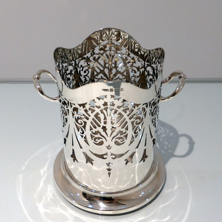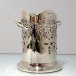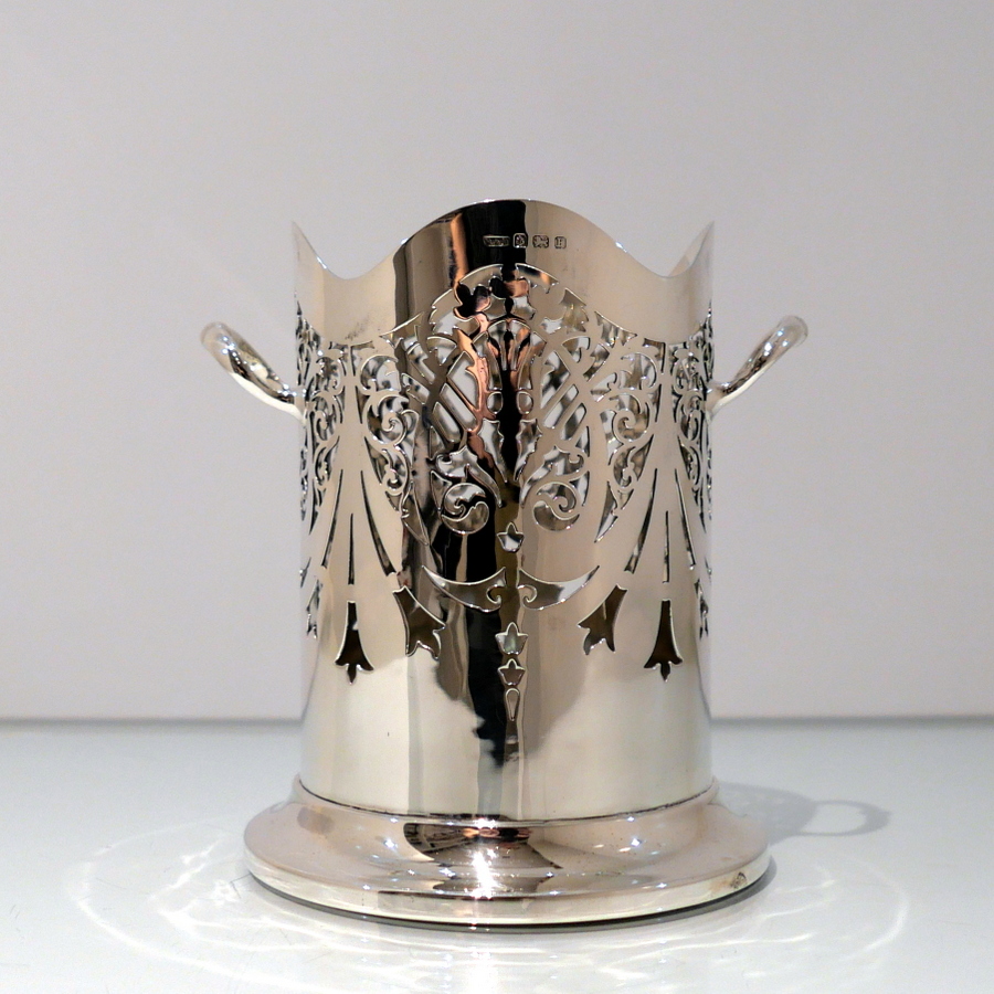 A beautiful silver cylindrical ‘wavy’ edged siphon stand decorated with elegant hand piercing designs and two applied cast wire handles.