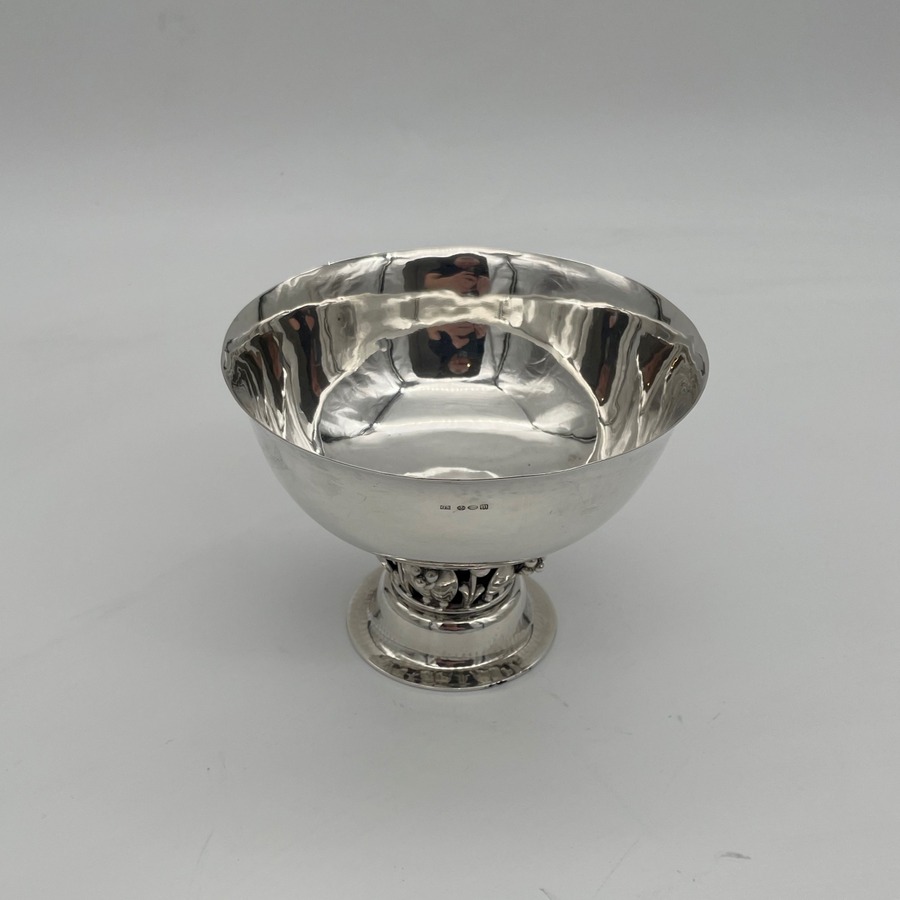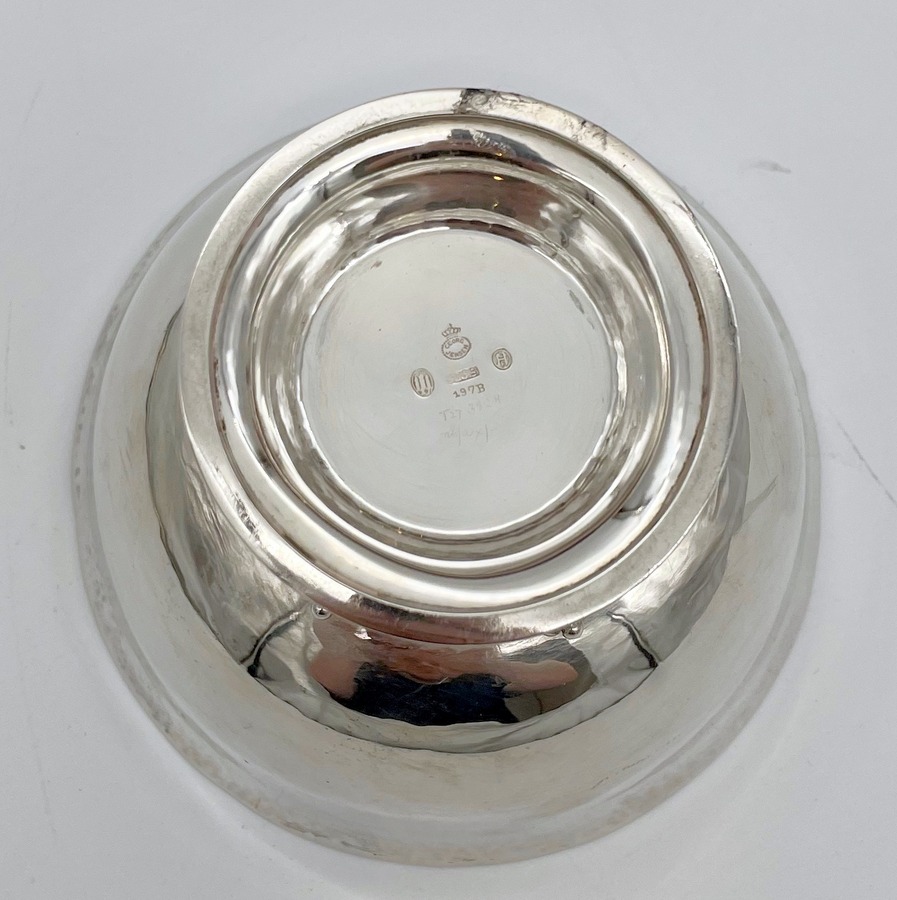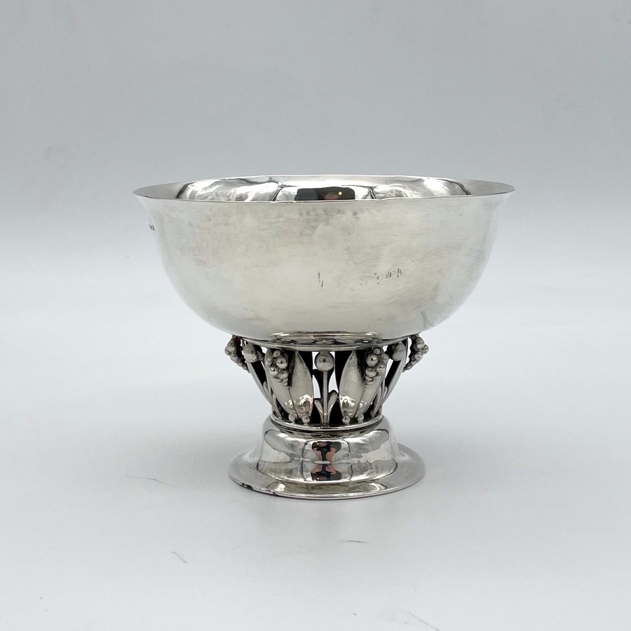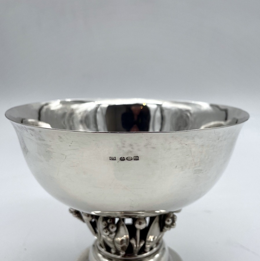Highly collectable small Georg Jensen sterling silver plain formed bowl designed with a wonderful hammered patina and a stylish cast grape and vine leaf stem.