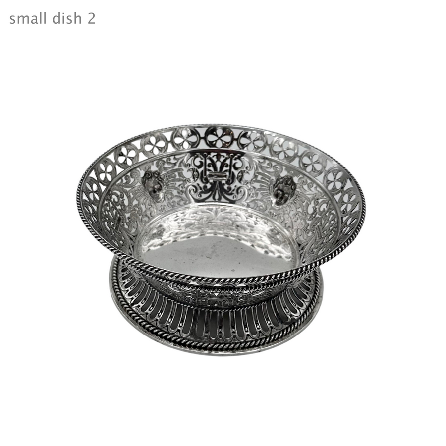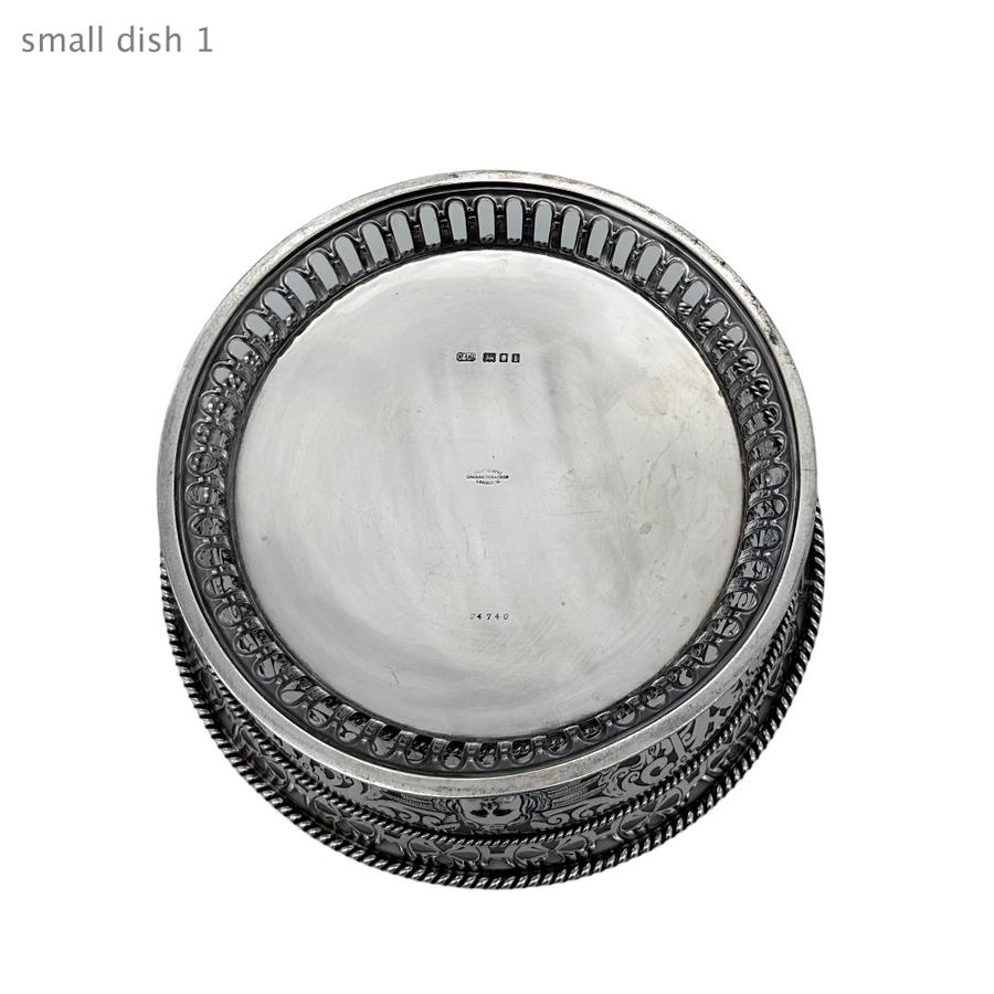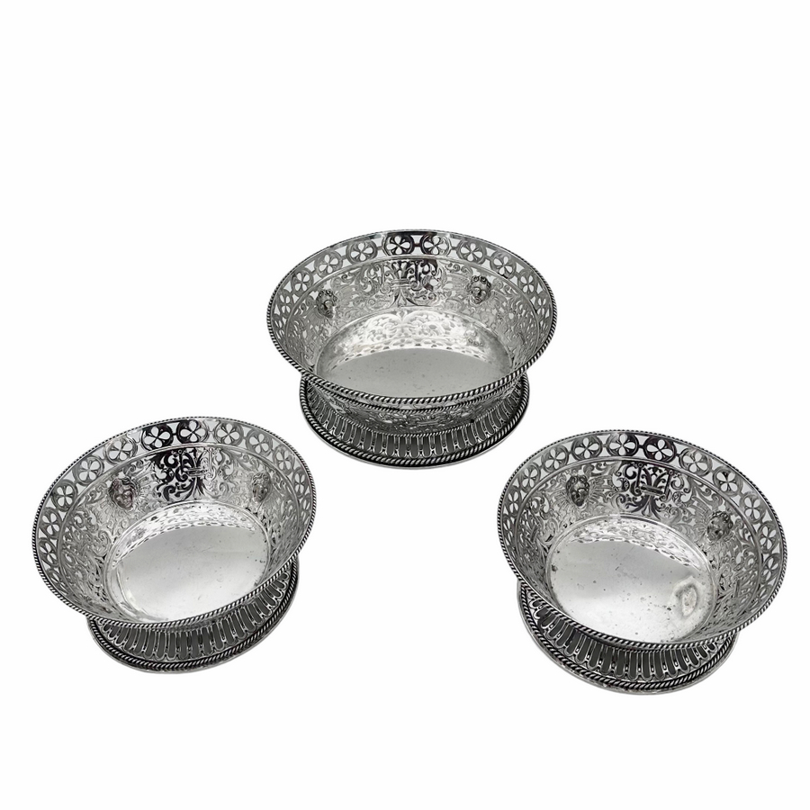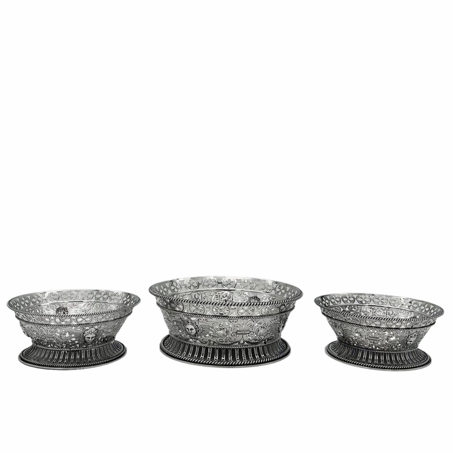 Truly spectacular suite three tapering circular silver dishes designed with faboulous piercings which are beautiful highlighted by rope borders. The suite has a large central dish and two smaller accompanying dishes.