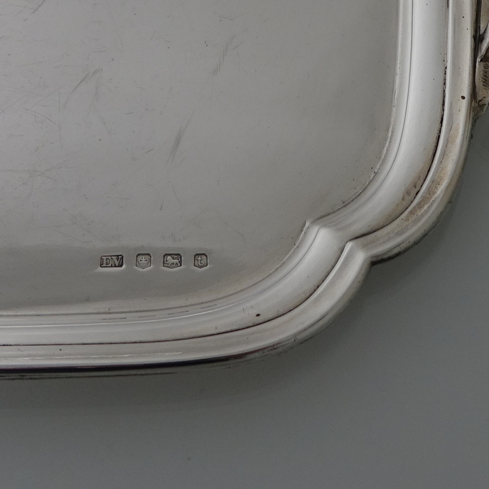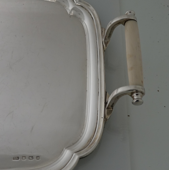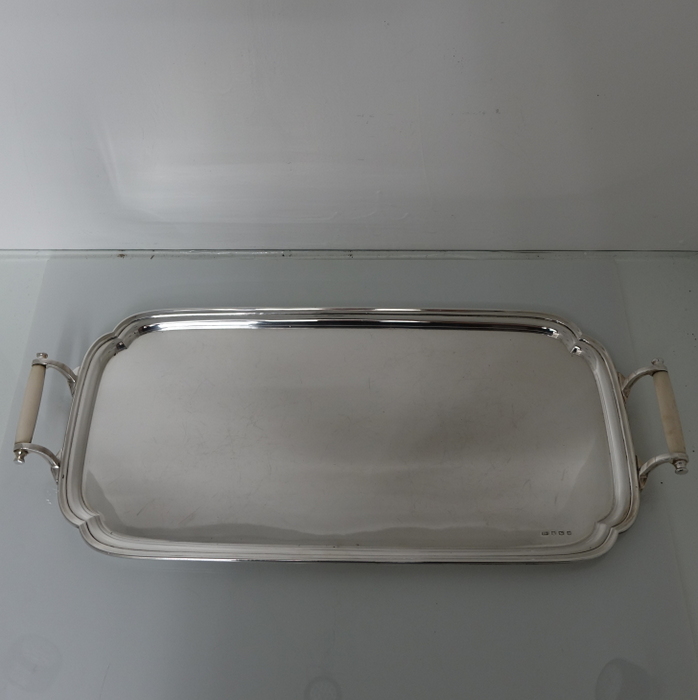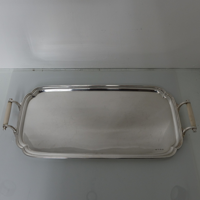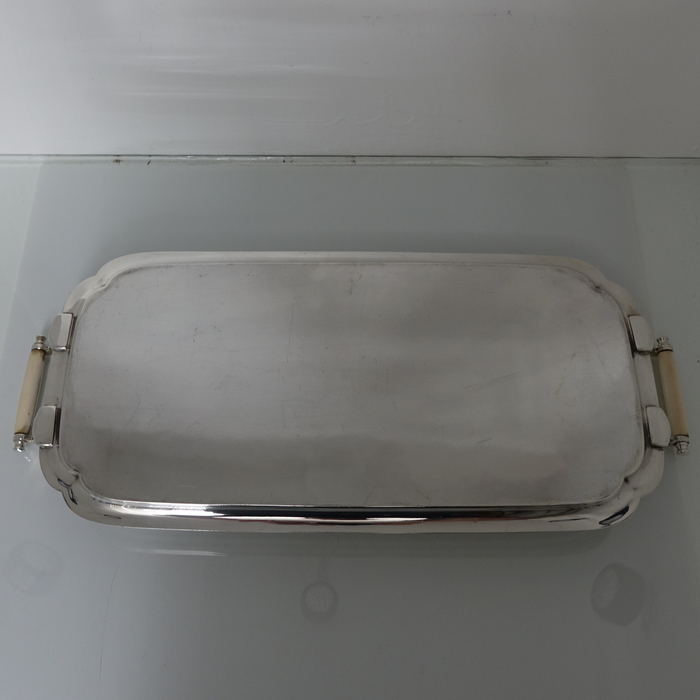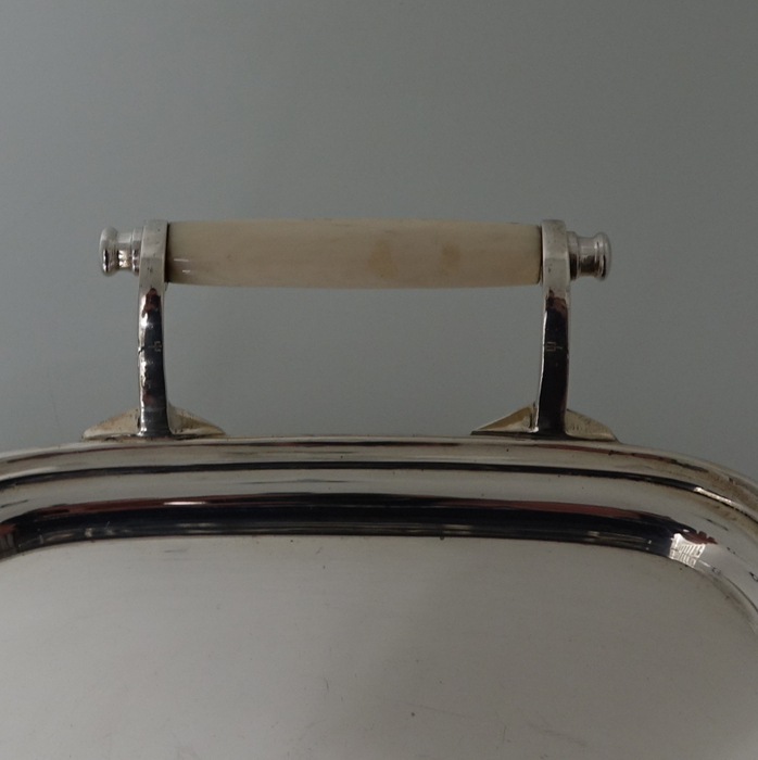 A very rare and highly collectable art deco rectangular tea tray with raised ivory handles for easy use. The tray is plain formed in design with elegant curved shape edges for overall highlights.