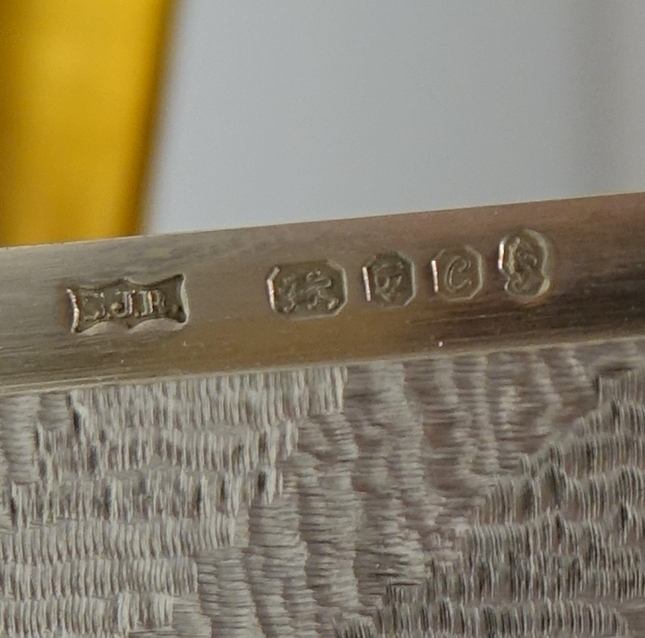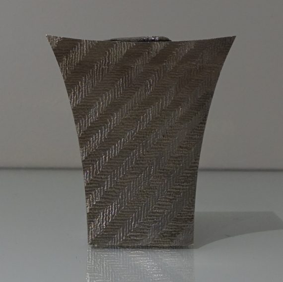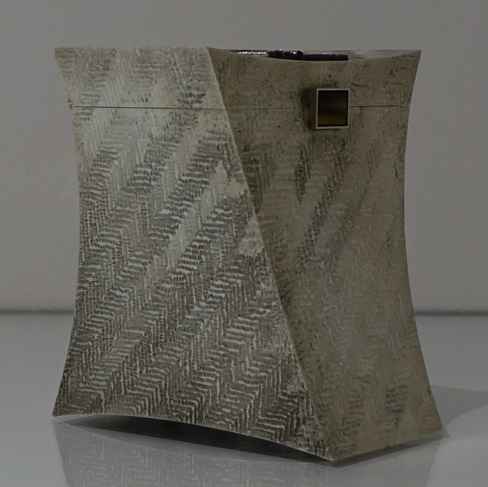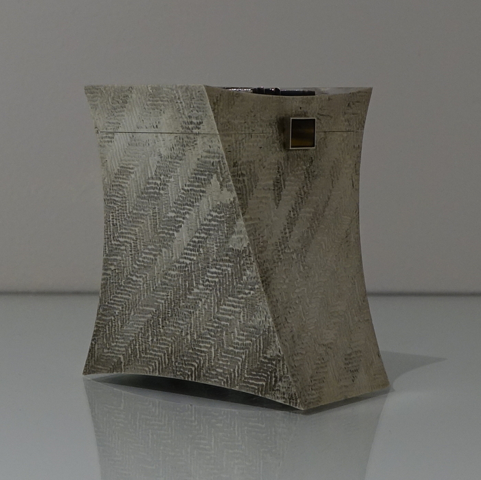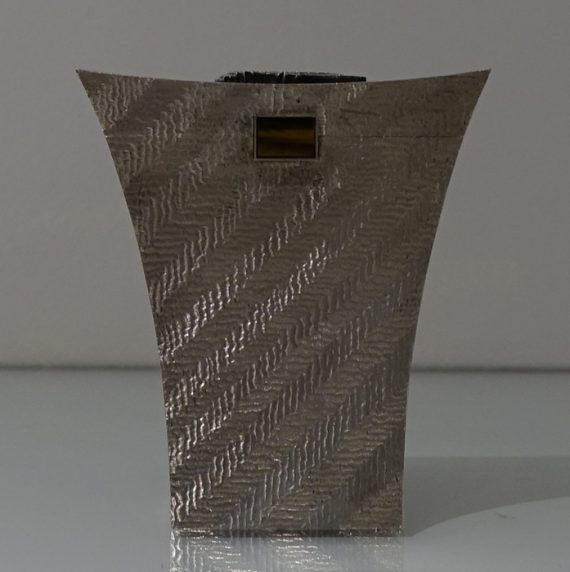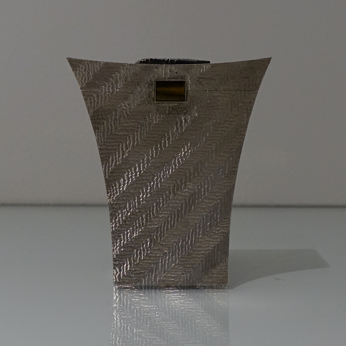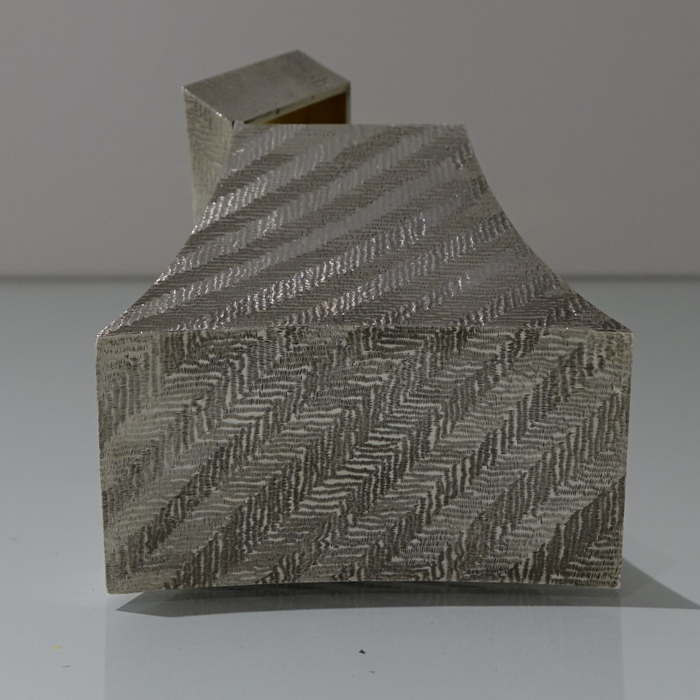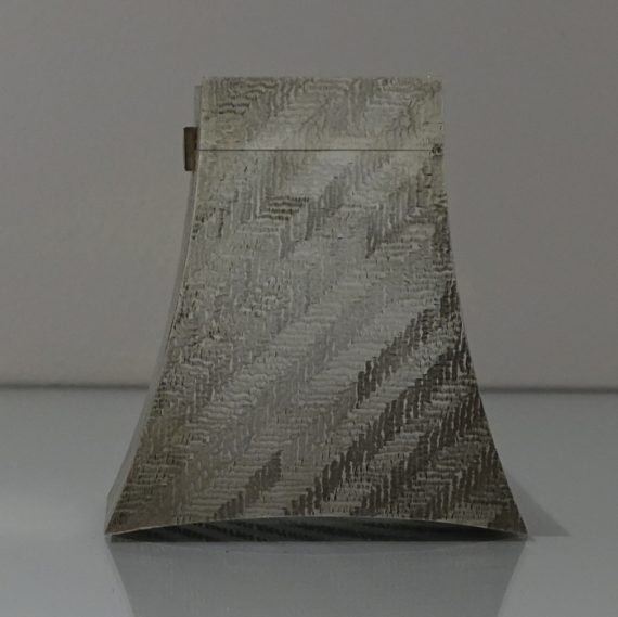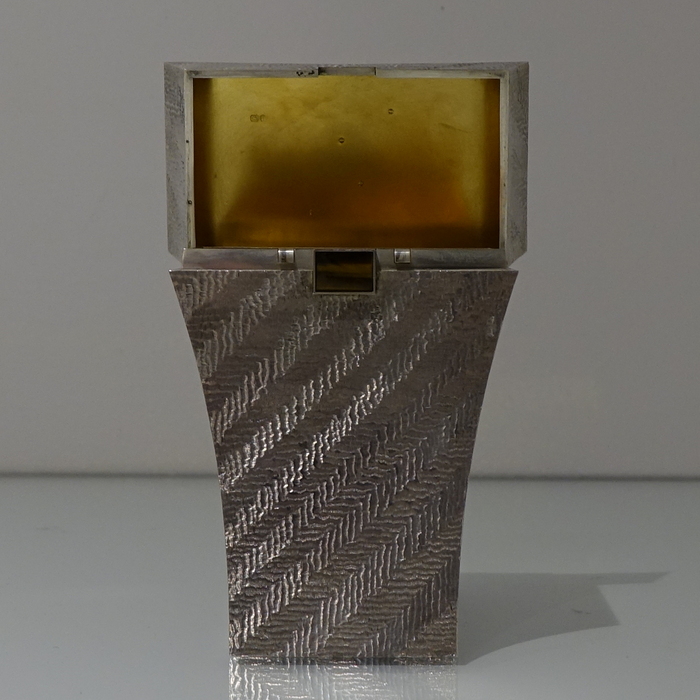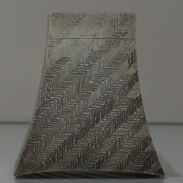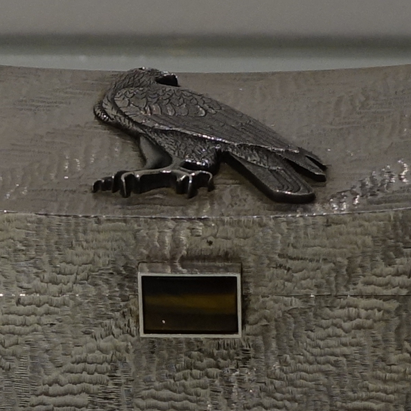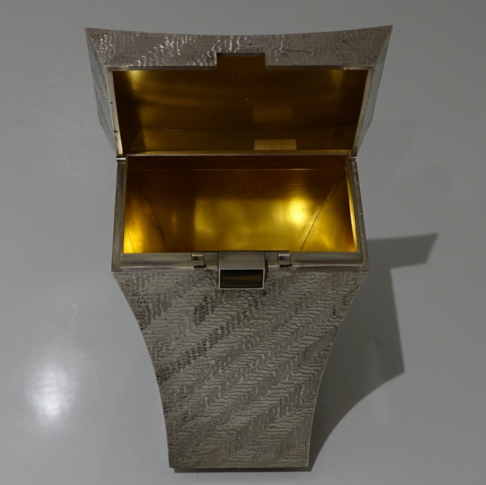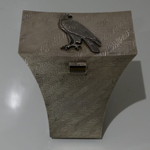 A very stylish and completely unique example of a modern art rectangular tea caddy which has wonderful concave styling to the angles of the body for its overall design. Â The body of the caddy has stylish bark effect matting for decoration and is crowned with a push button lid with a delightful eagle motif for highlights. Â The inside is gilt.