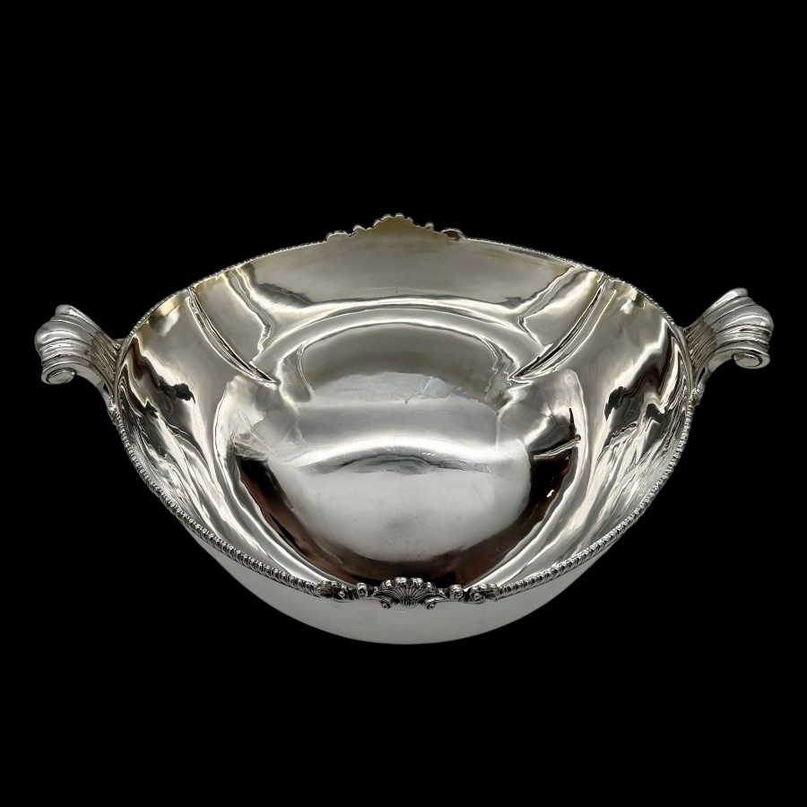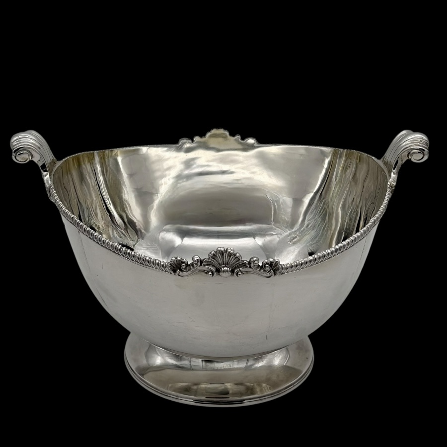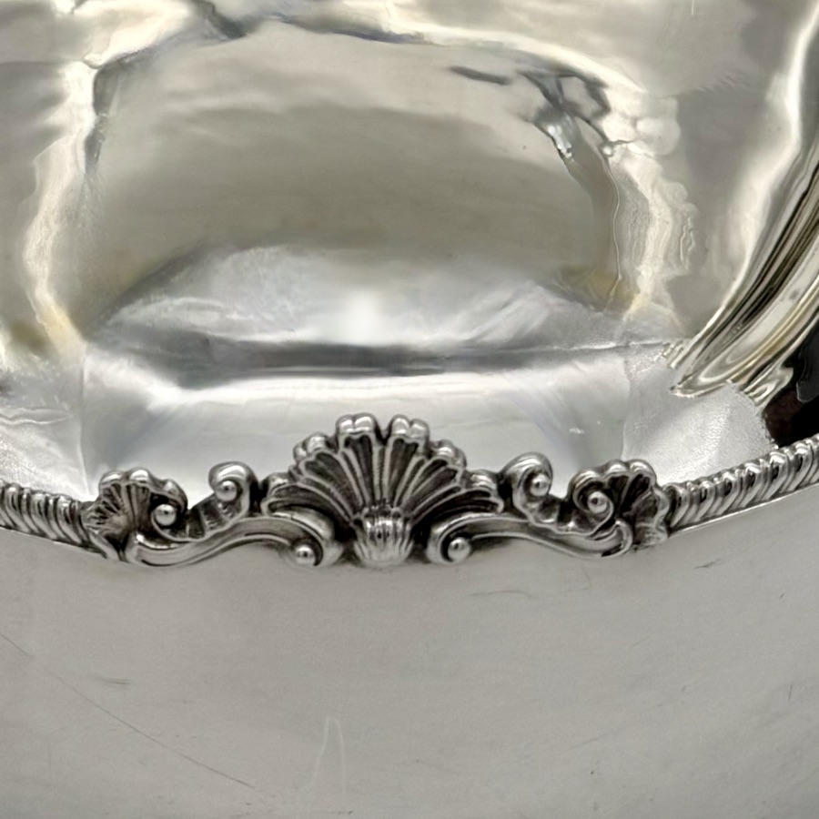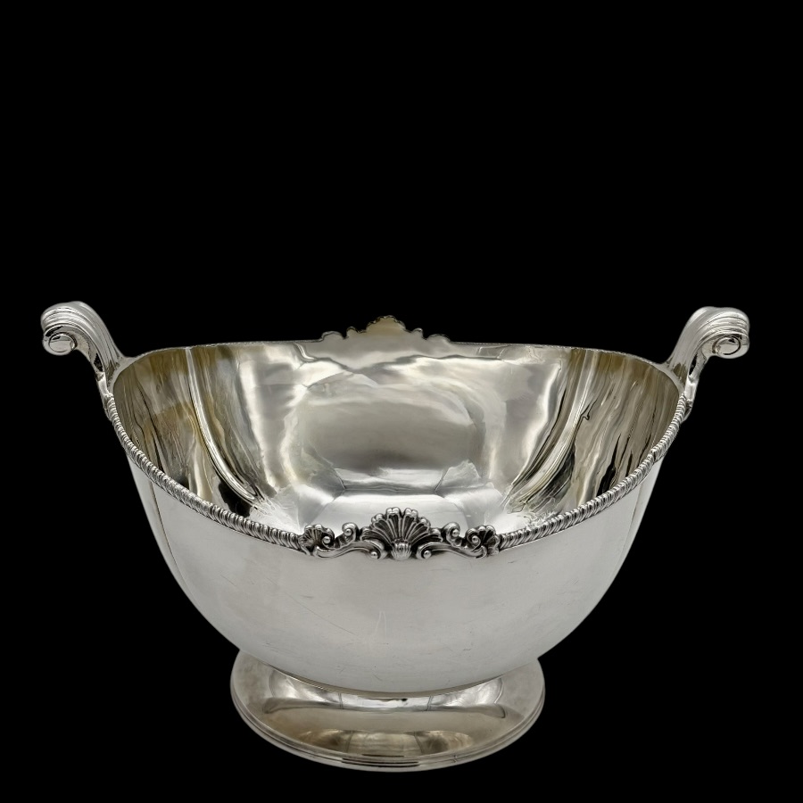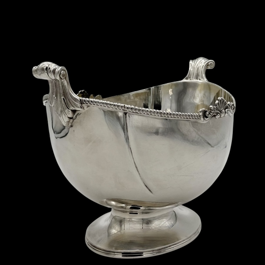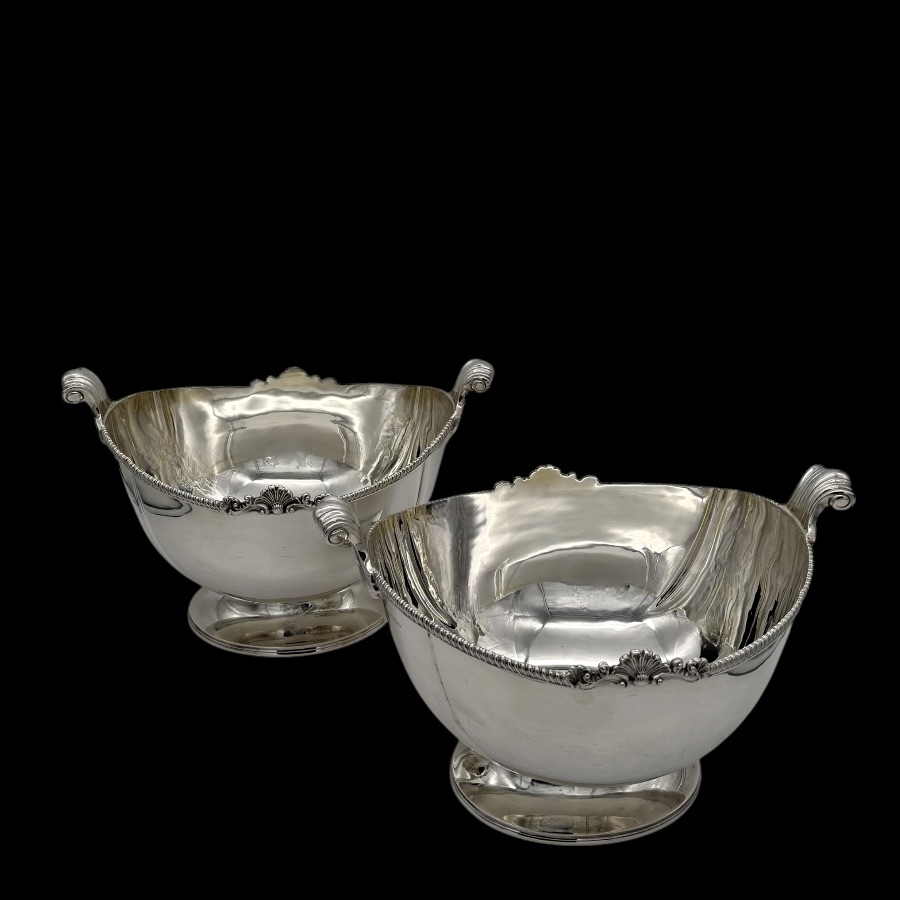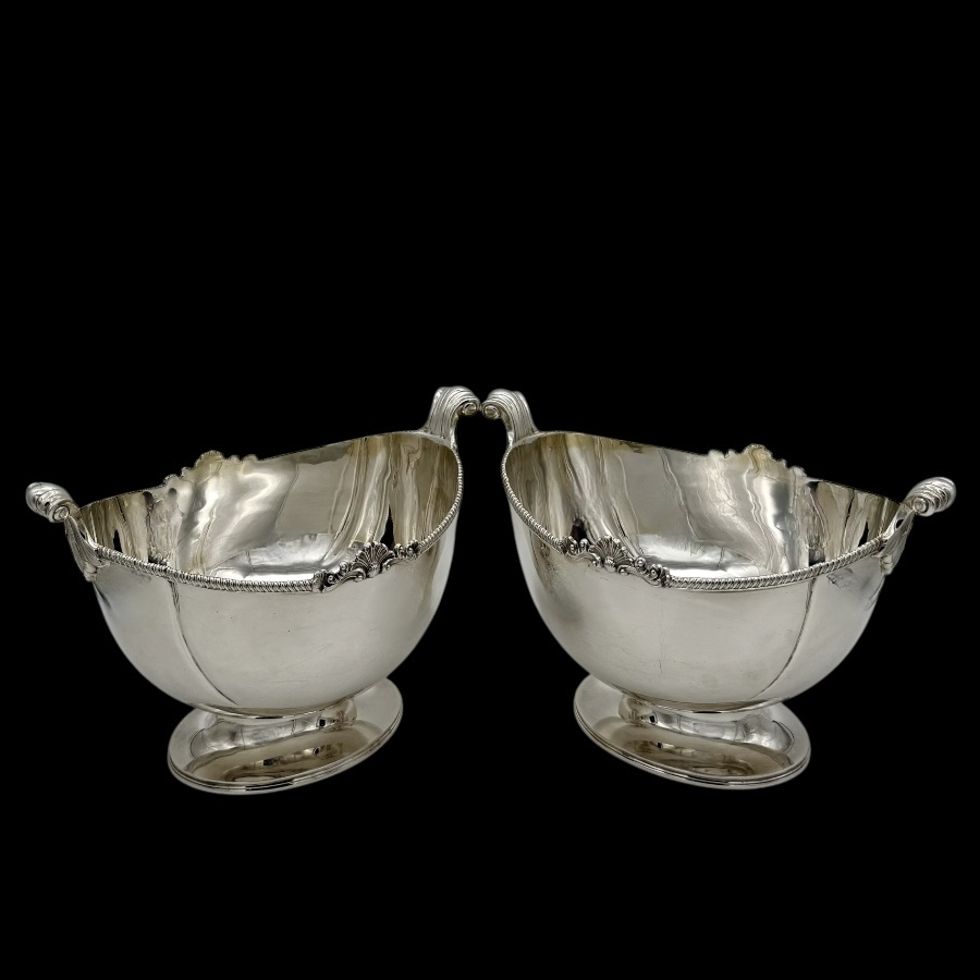 Impressive pair of oval formed sterling silver champagne coolers decorated with ribbing at the angles and stylish applied shell and gadroon borders for highlights.