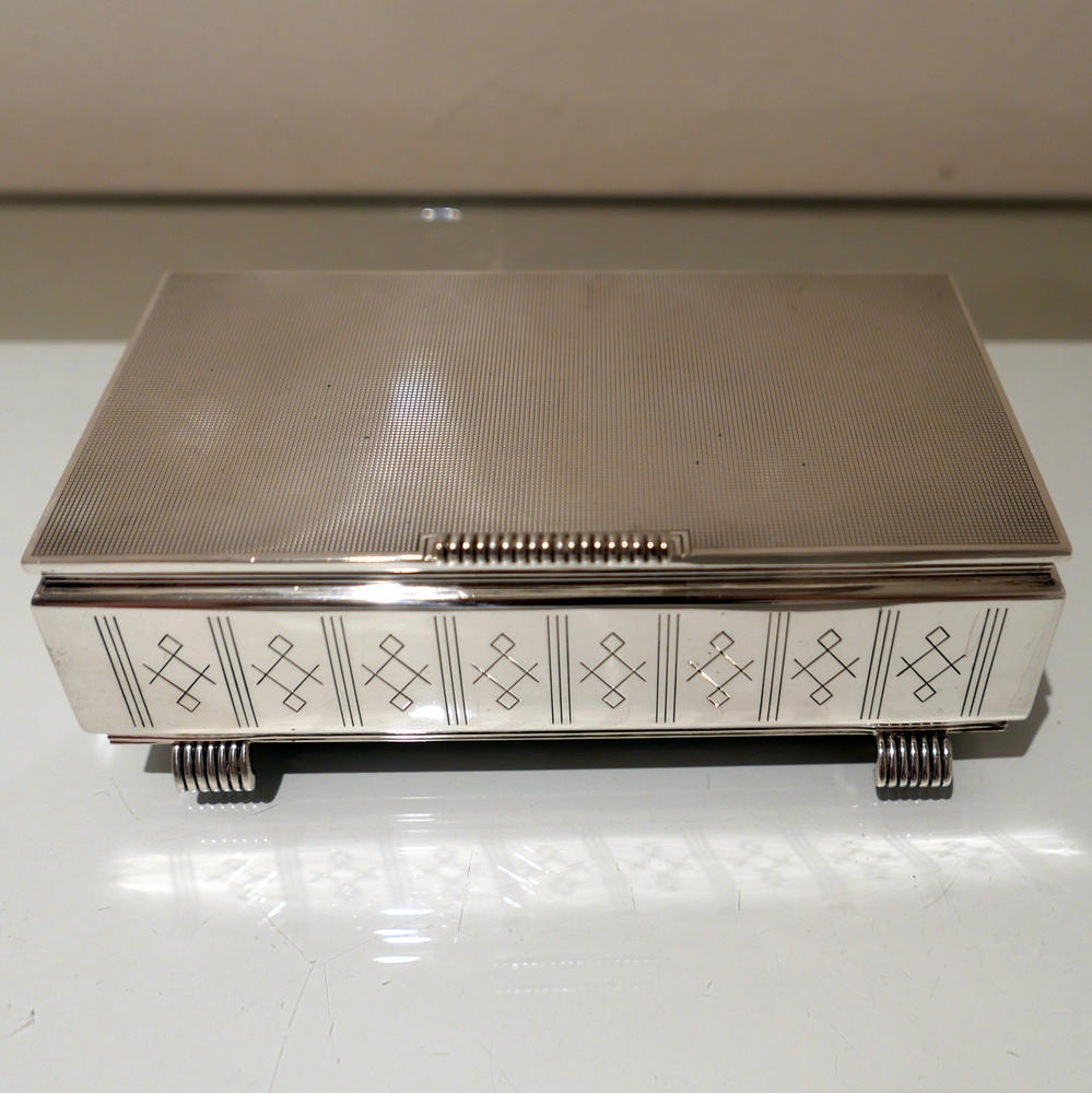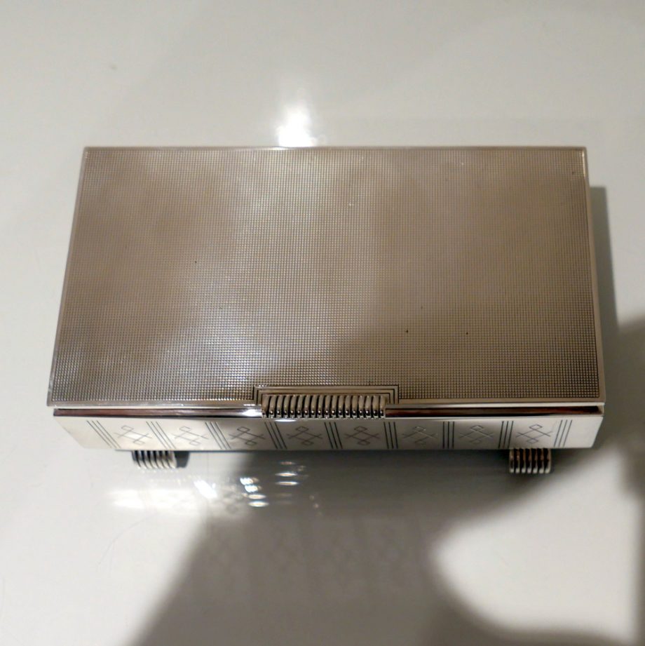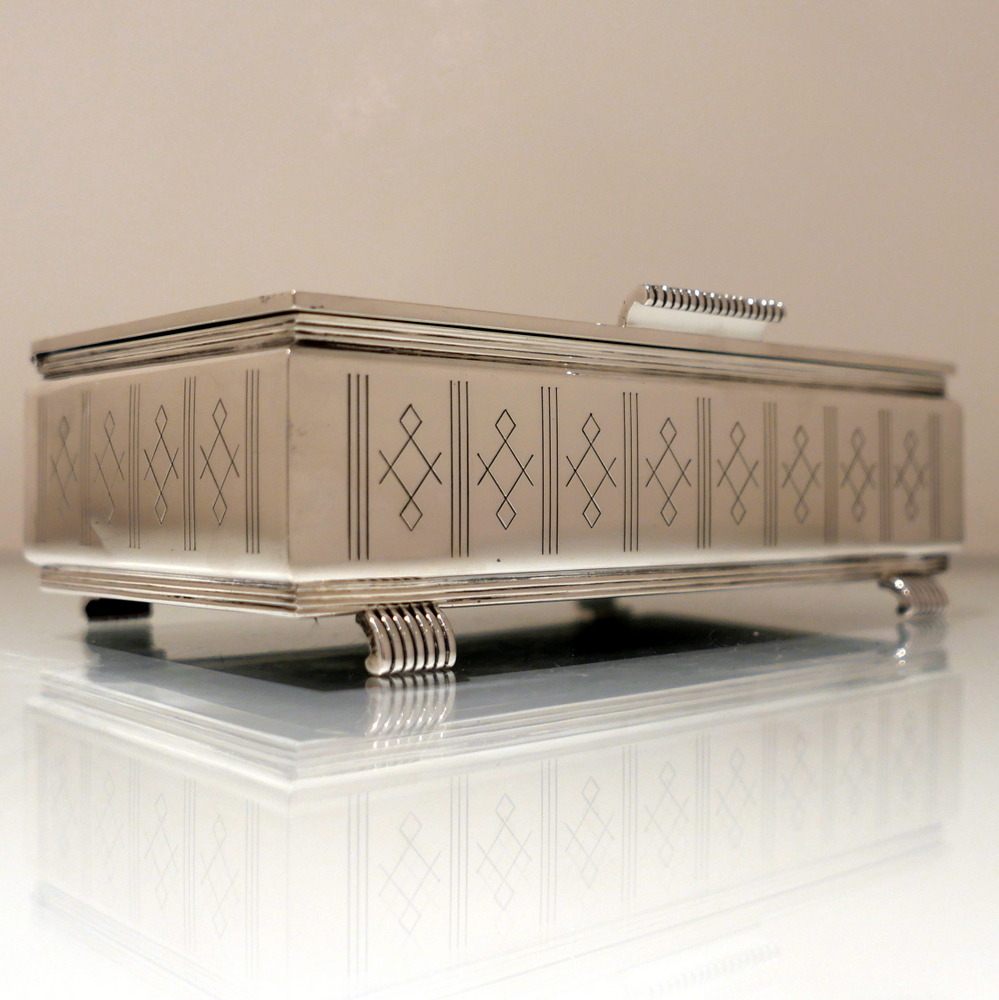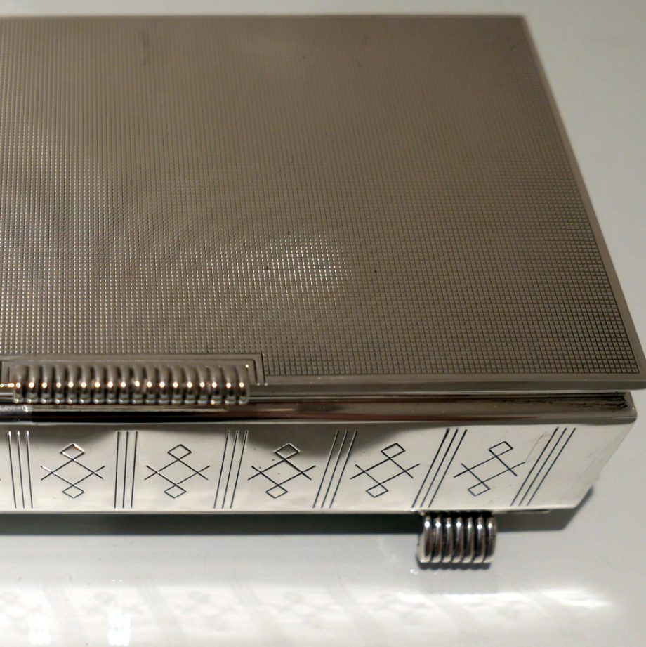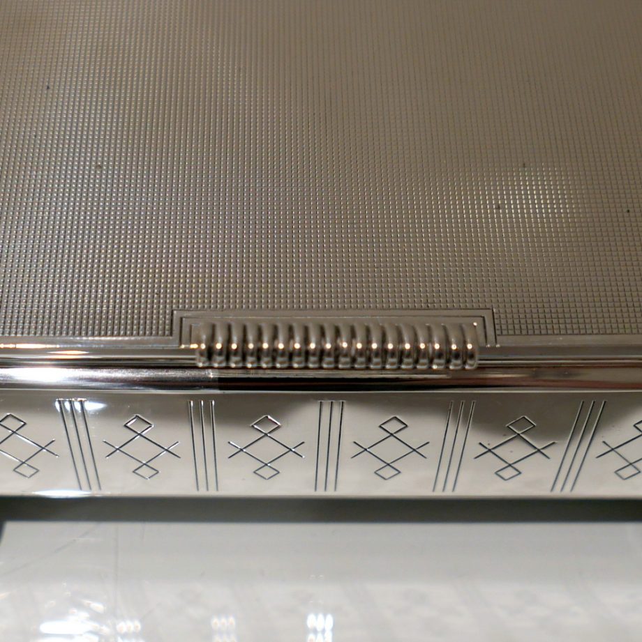 A beautiful Art Deco style rectangular cigarette box decorated with a hinged engine turned lid. Â The body has elegant engraving for highlights and the inside has a wooden inlay.