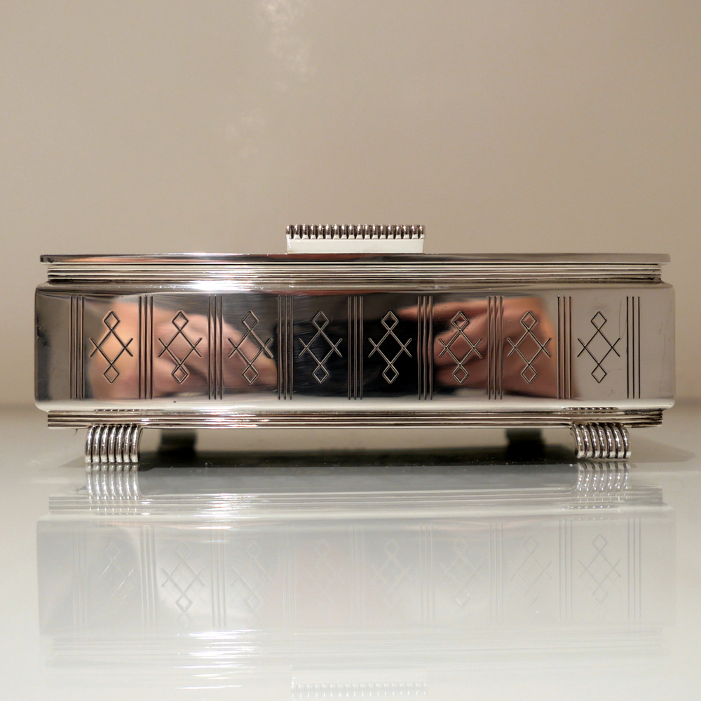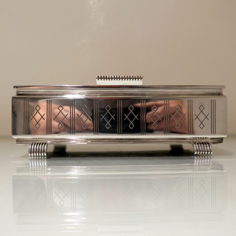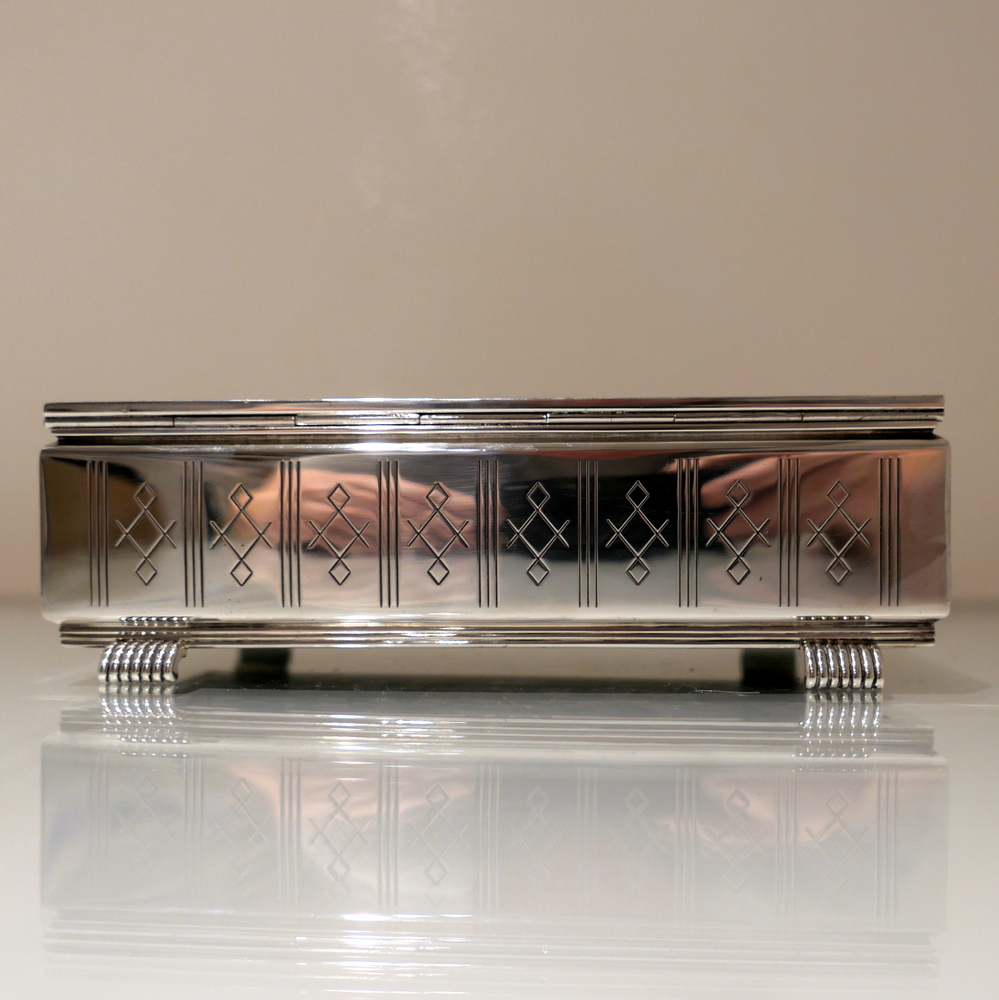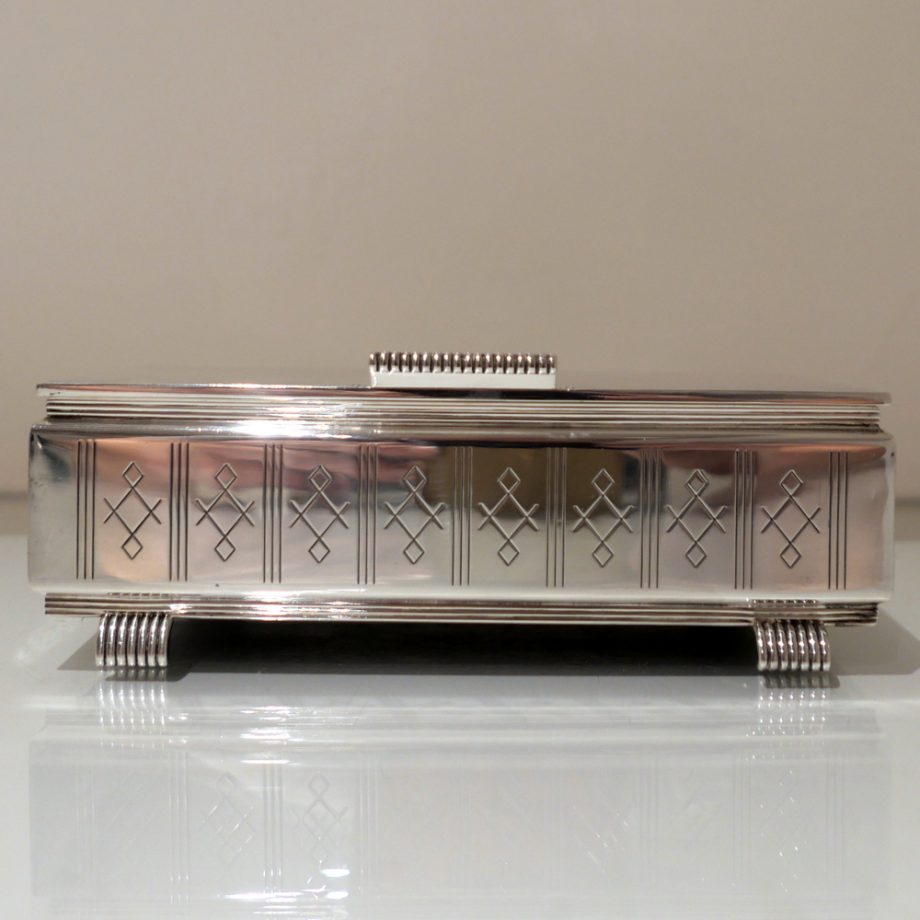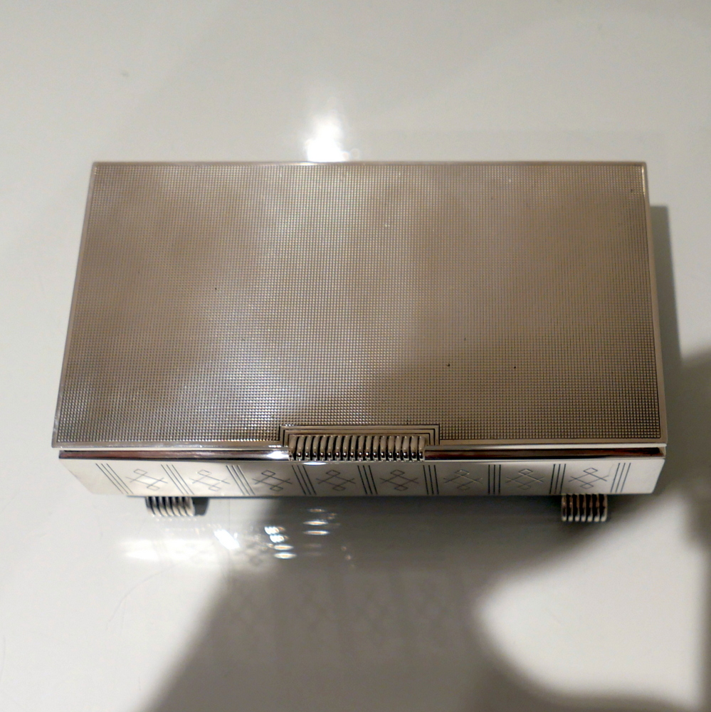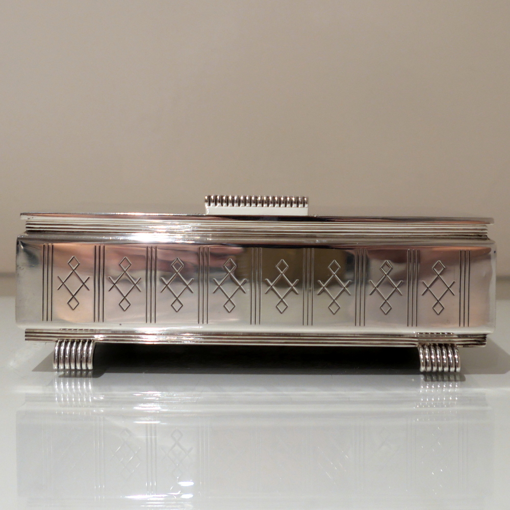 A beautiful Art Deco style rectangular cigarette box decorated with a hinged engine turned lid. Â The body has elegant engraving for highlights and the inside has a wooden inlay.