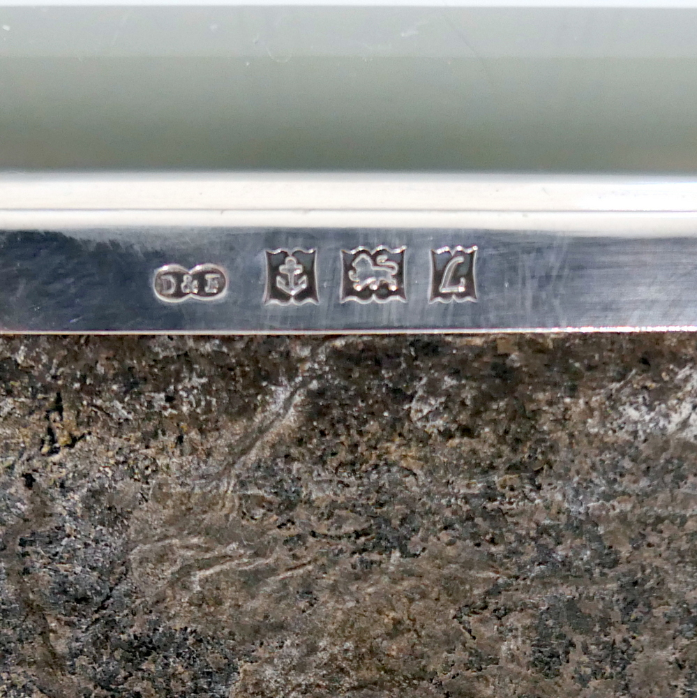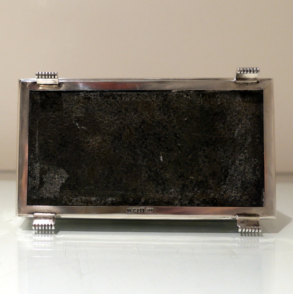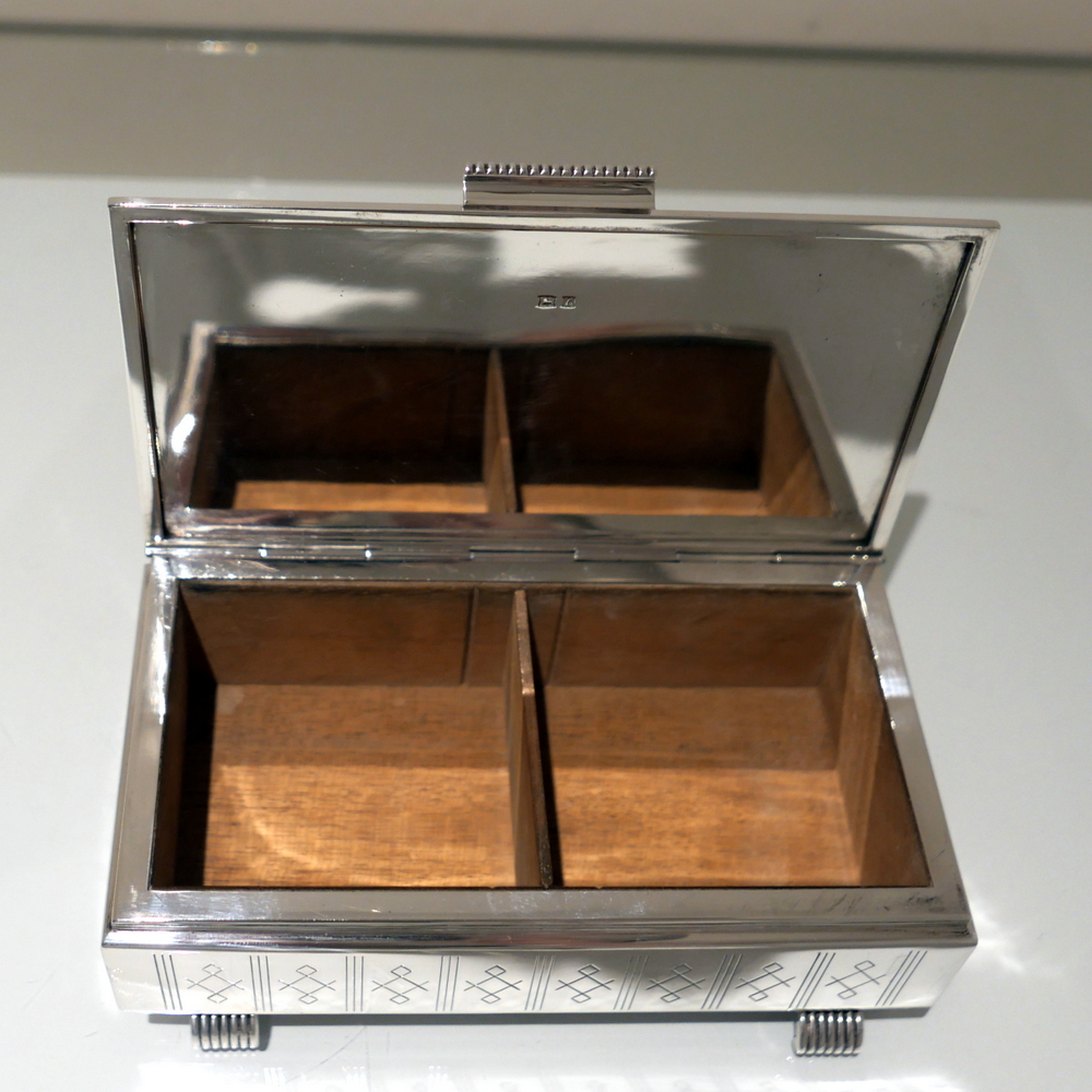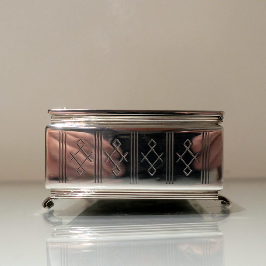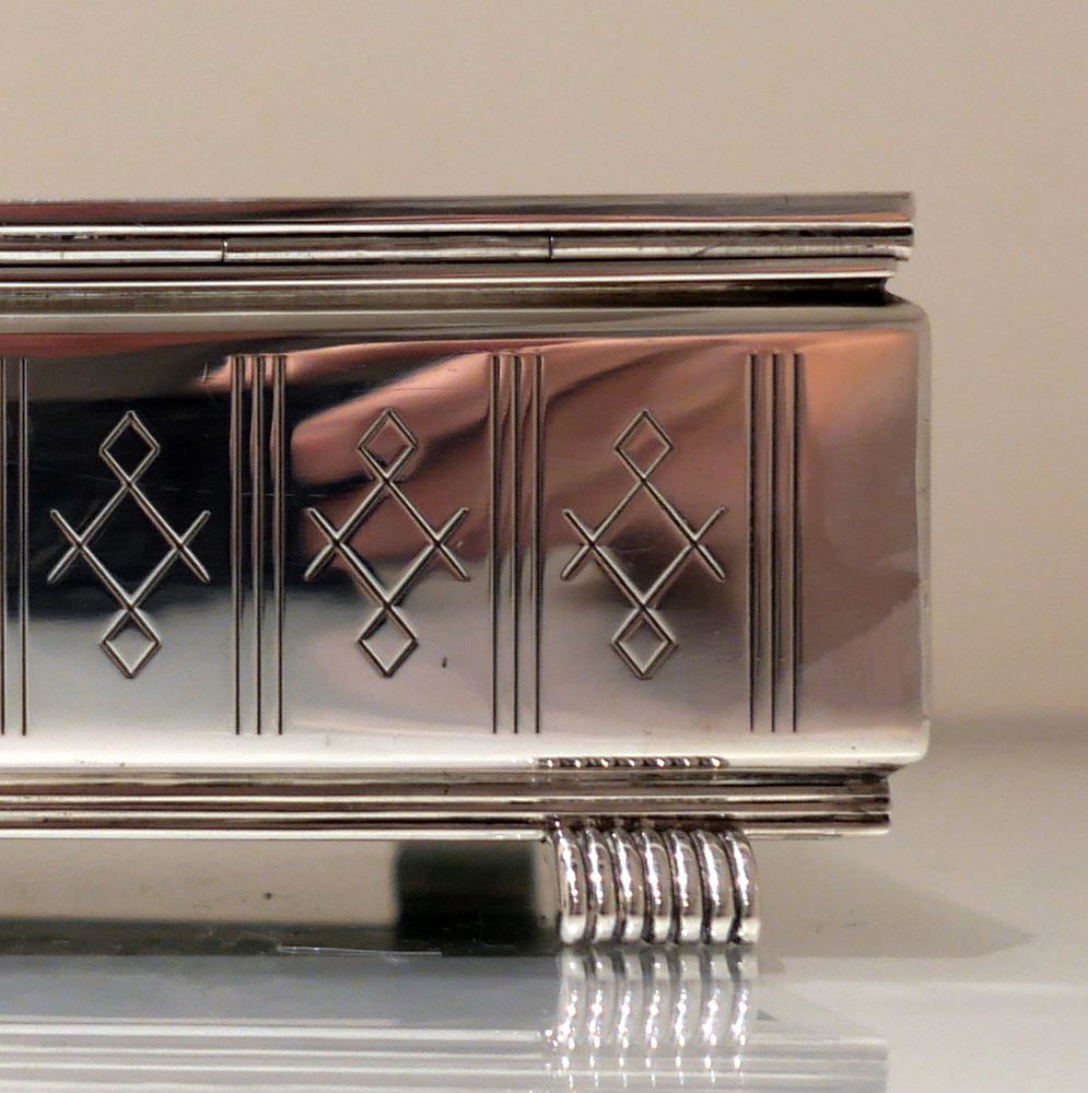 A beautiful Art Deco style rectangular cigarette box decorated with a hinged engine turned lid. Â The body has elegant engraving for highlights and the inside has a wooden inlay.